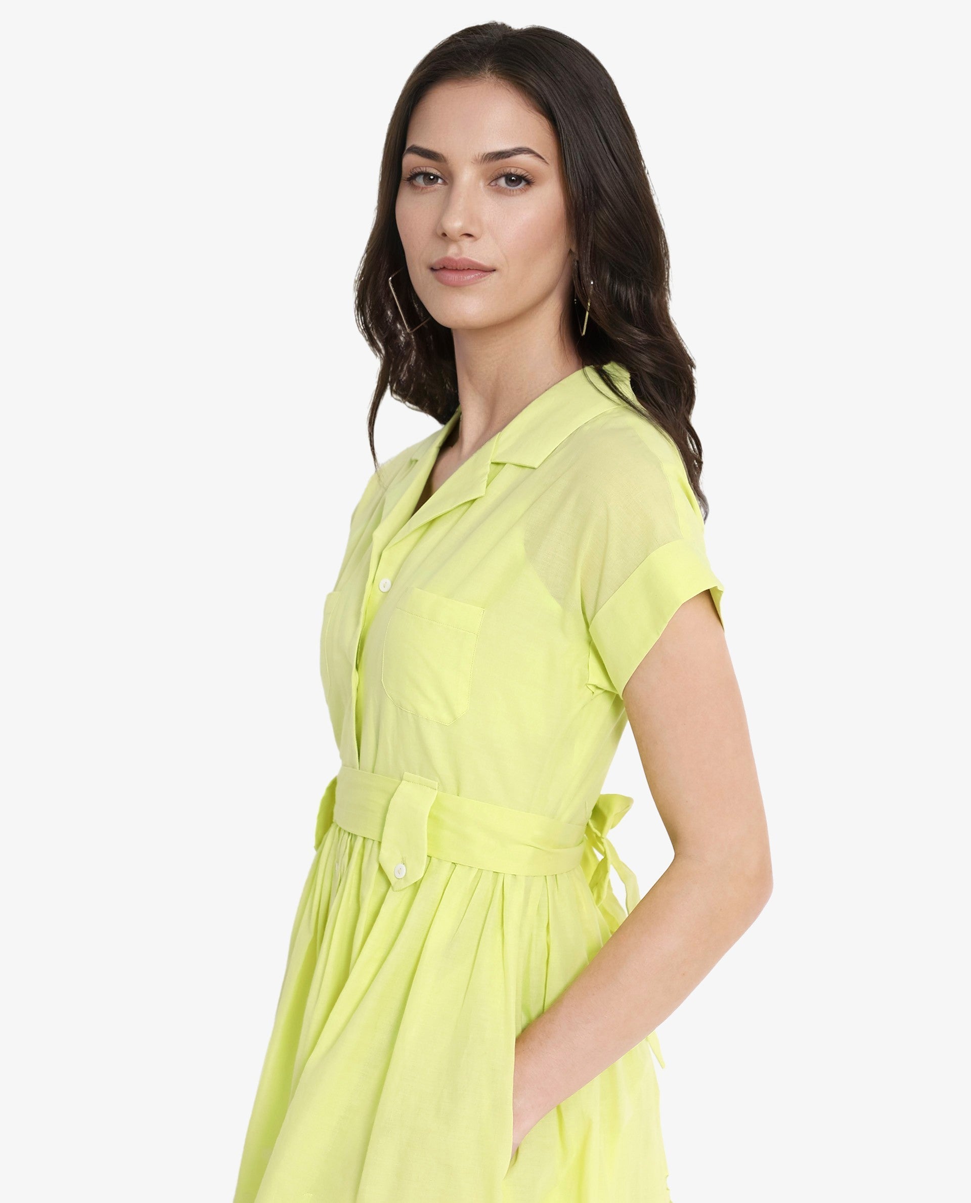 Rareism Women Gunthaar Light Green Cotton Fabric Cap Sleeve Collared Neck Solid Longline Dress