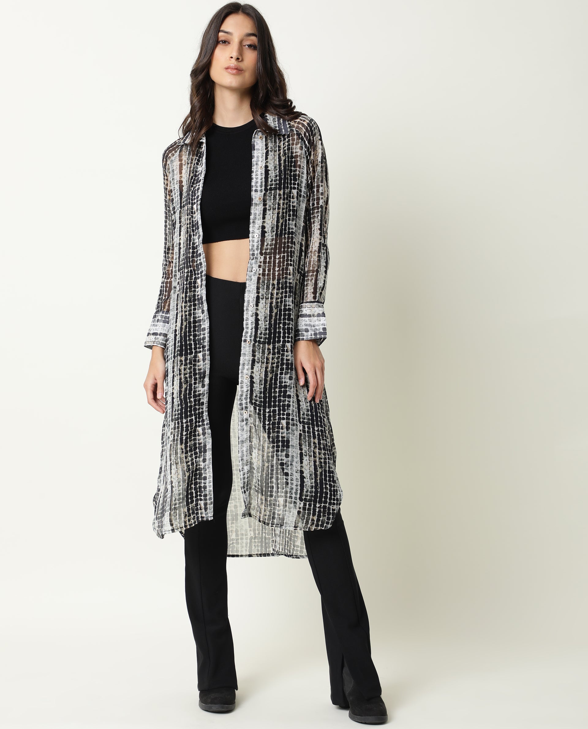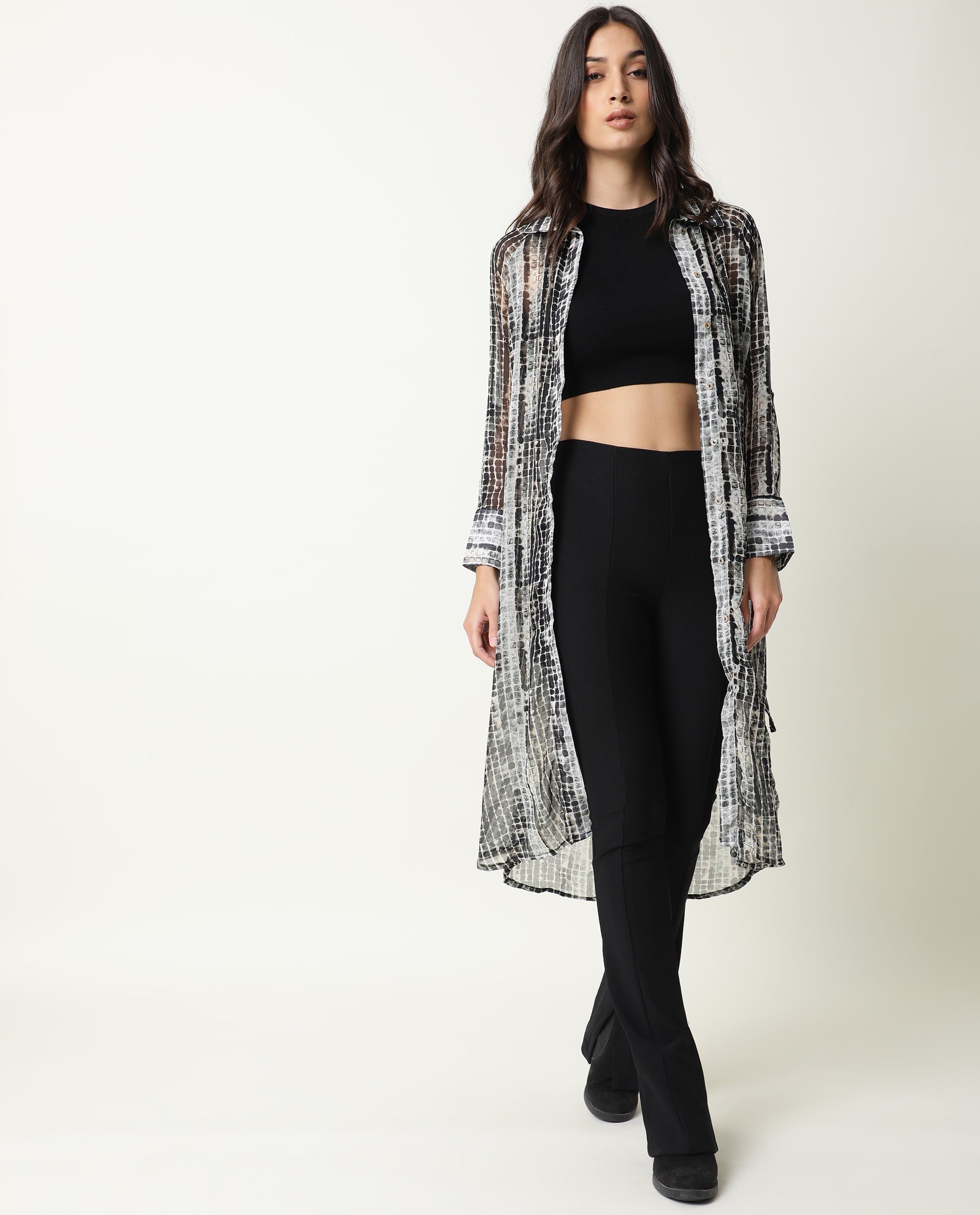 - The model (Bust-34, Waist-24, Hip-35, Height-175 cms) is wearing a size XS.