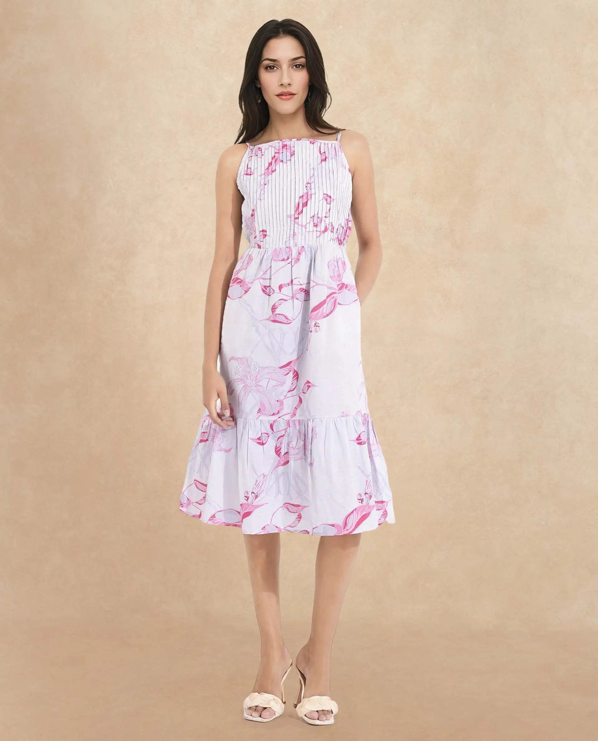 Rareism Women Kanora Dusky Purple Sleeveless Shoulder Straps Fit And Flare Midi Floral Print Dress