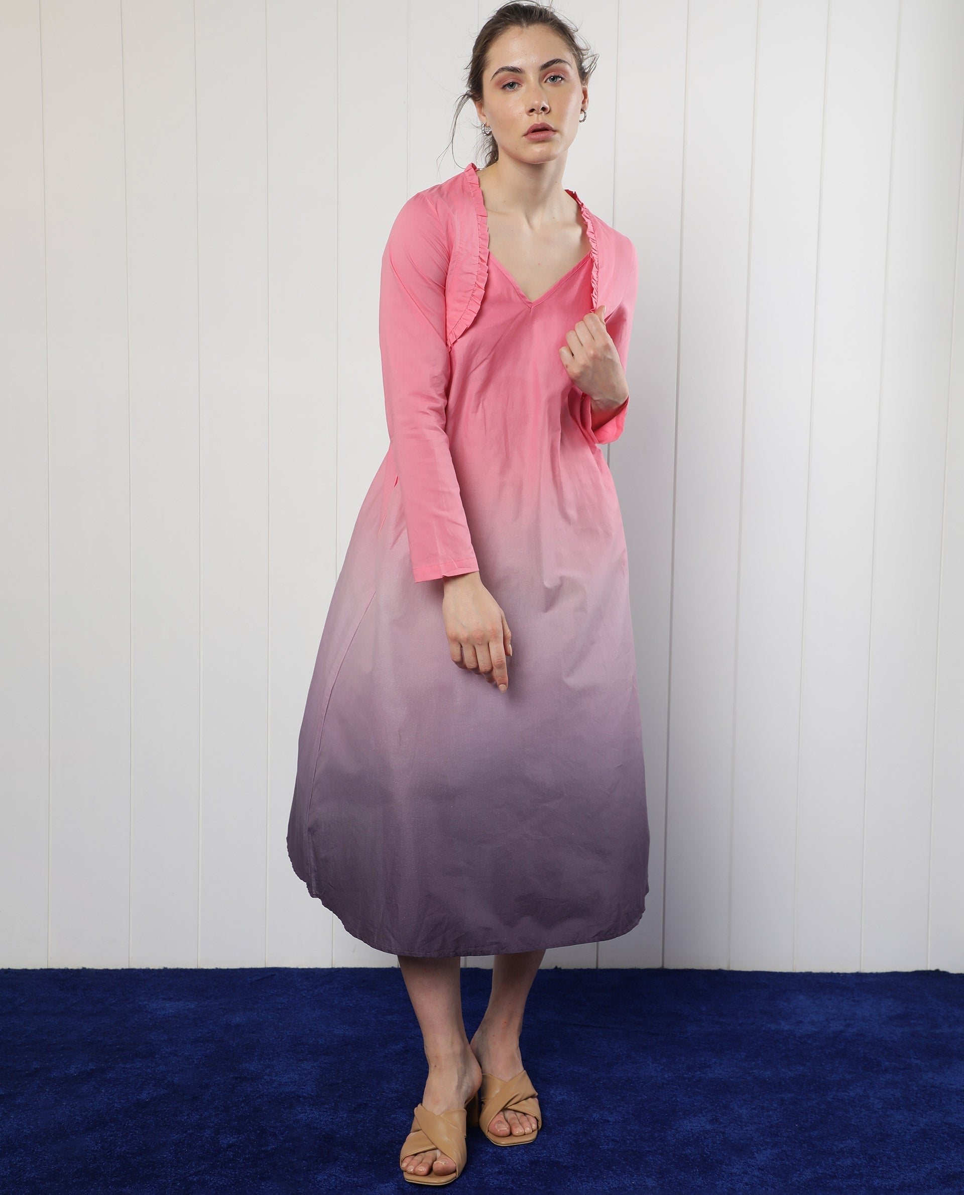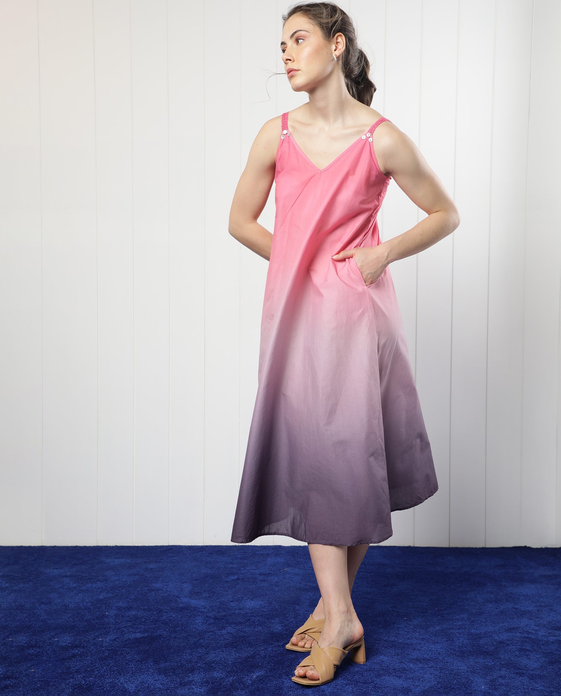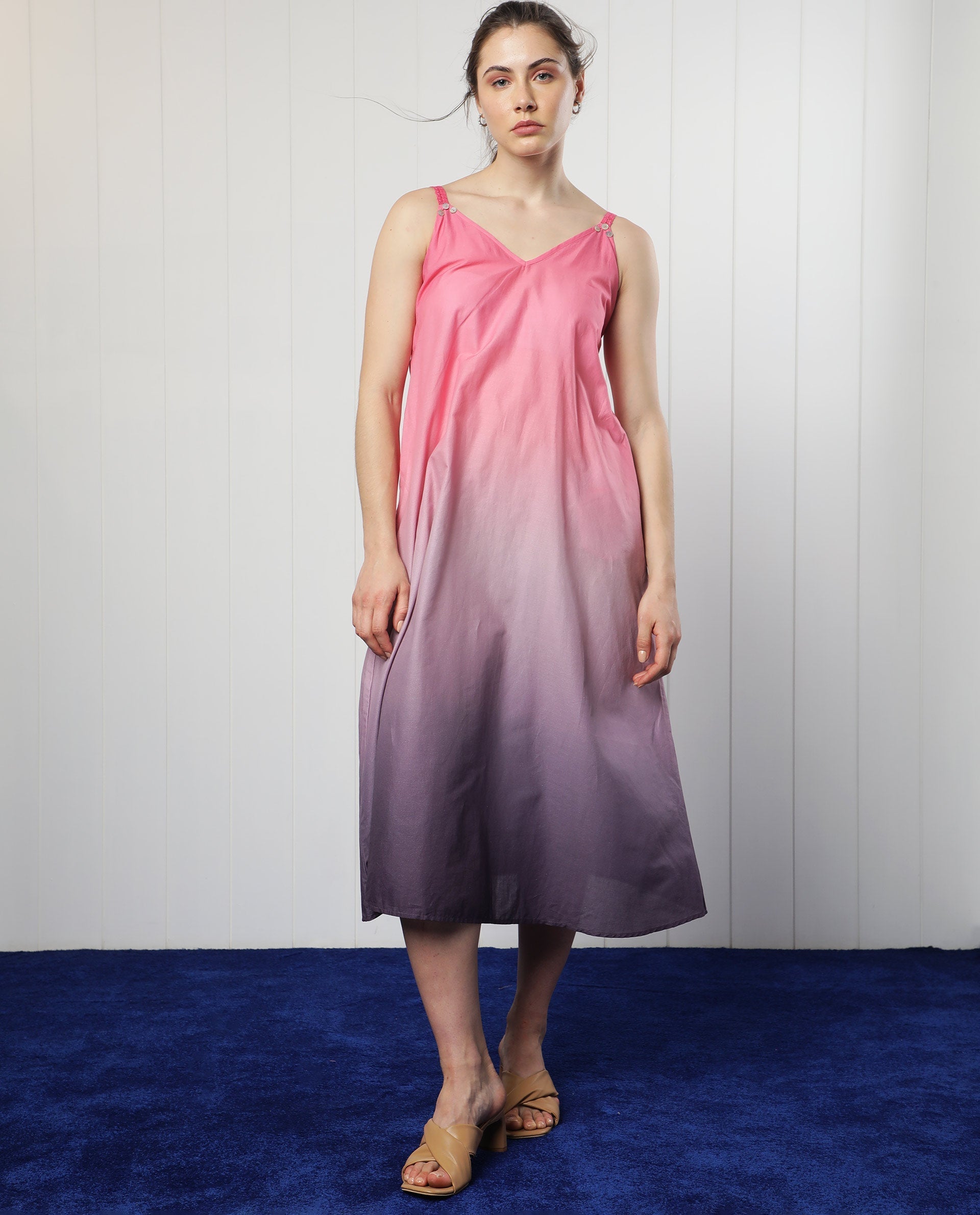 Elevate your wardrobe with this stunning ombre pink midi dress, perfect for any occasion. Crafted from high-quality fabric, this dress features a graceful gradient design that transitions from vibrant pink to a soft purple hue. The sleeveless style and V-neck collar offer a flattering fit, while the relaxed silhouette ensures comfort and elegance. Ideal for summer outings or casual gatherings, this dress pairs beautifully with sandals or heels. Embrace effortless style and make a statement with this chic and versatile piece.