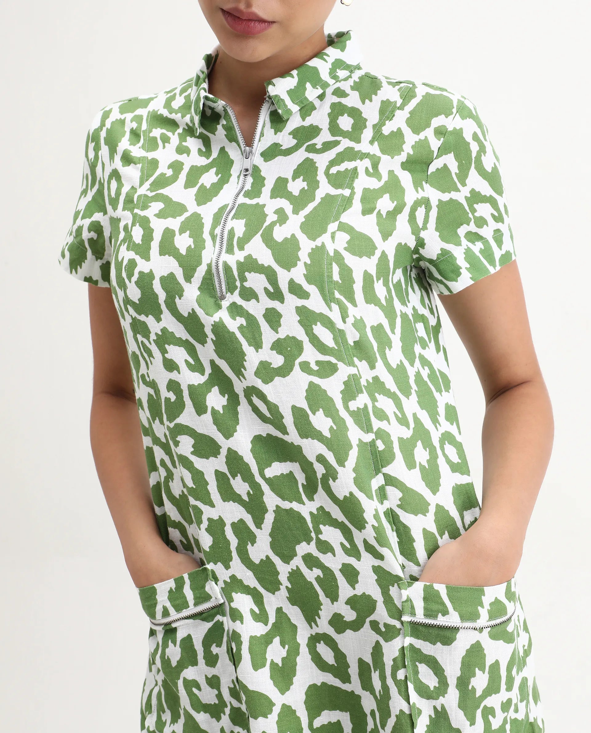 -With regular collar with front metal zipper, and patch pockets with metal zipper details.