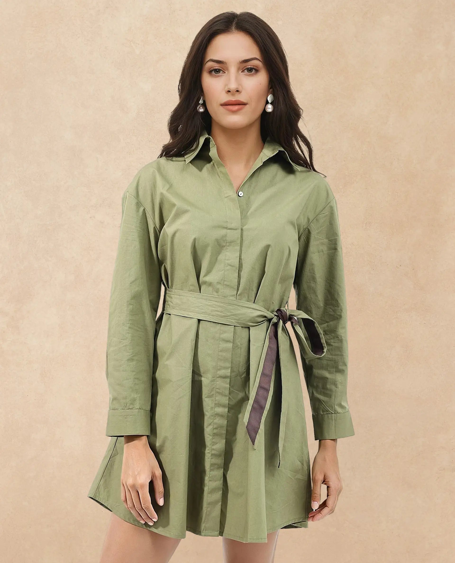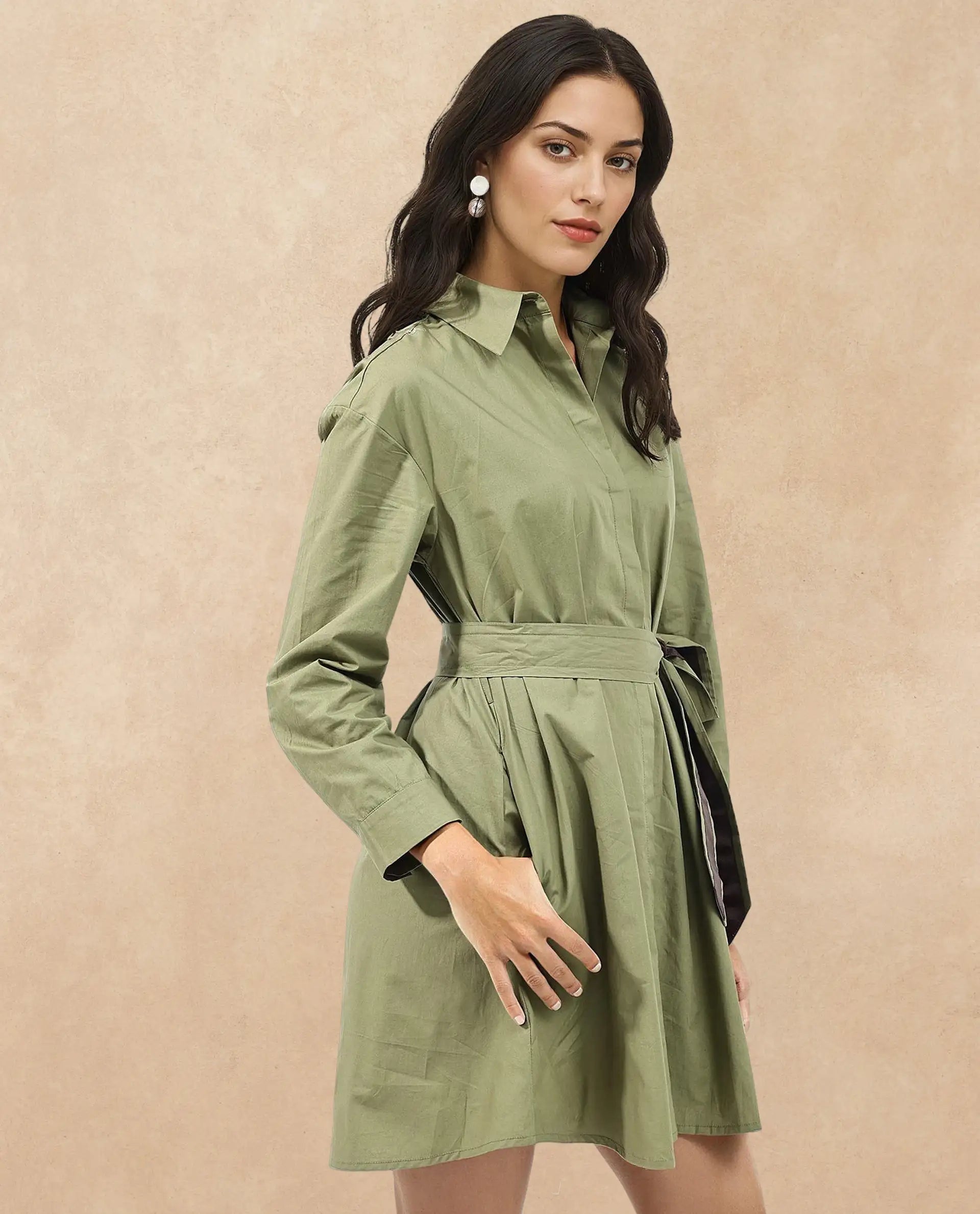 Rareism Women Meztli Green Cotton Fabric Over-Dyed Shirt Dress