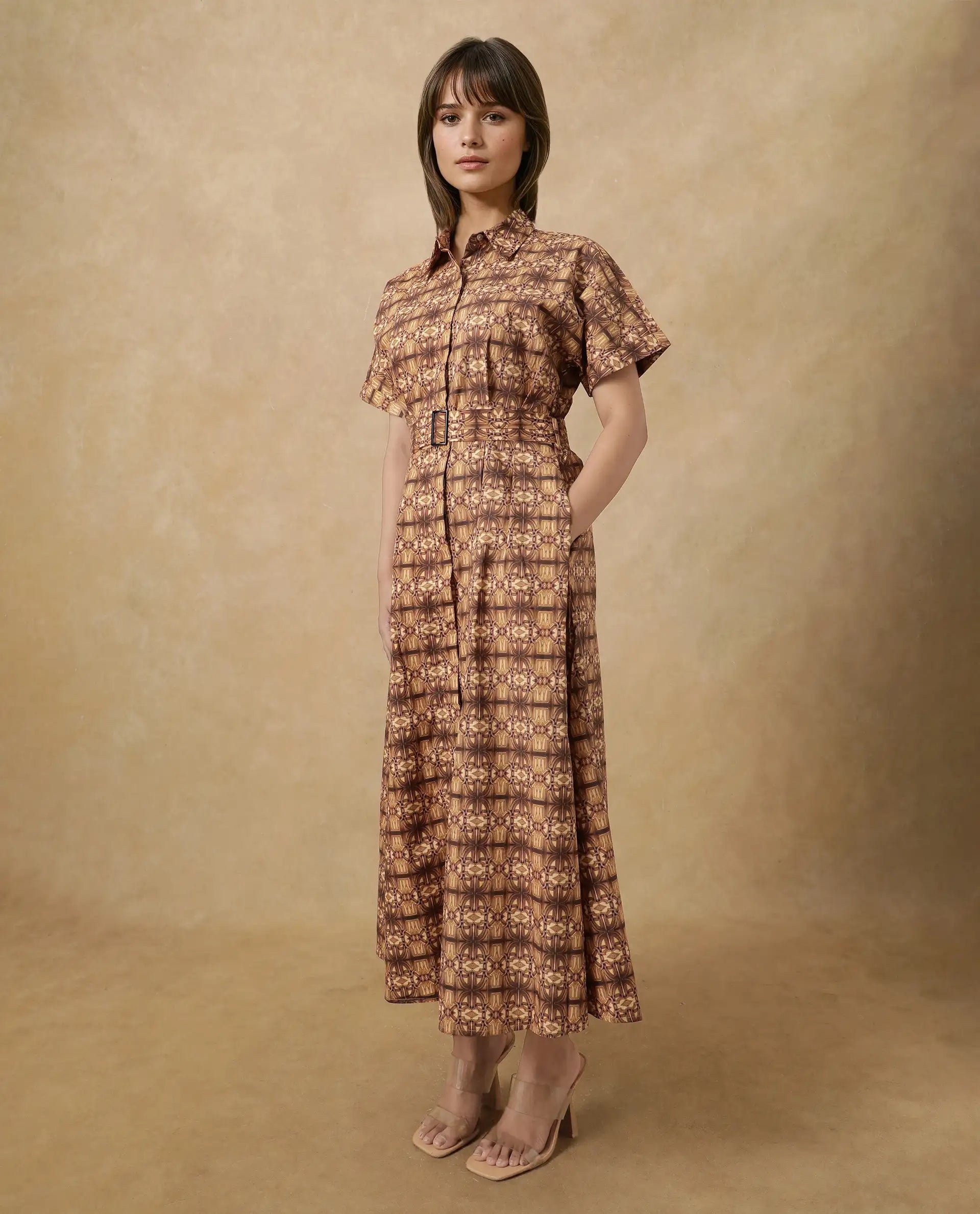 Elevate your wardrobe with this elegant brown midi dress, featuring a captivating geometric print. Perfect for casual outings or semi-formal events, this dress combines style and comfort effortlessly. The short sleeves and classic collar add a touch of sophistication, while the belted waist accentuates your silhouette. Crafted from high-quality fabric, it ensures a comfortable fit and lasting wear. Pair it with your favorite sandals or heels for a chic look that stands out.