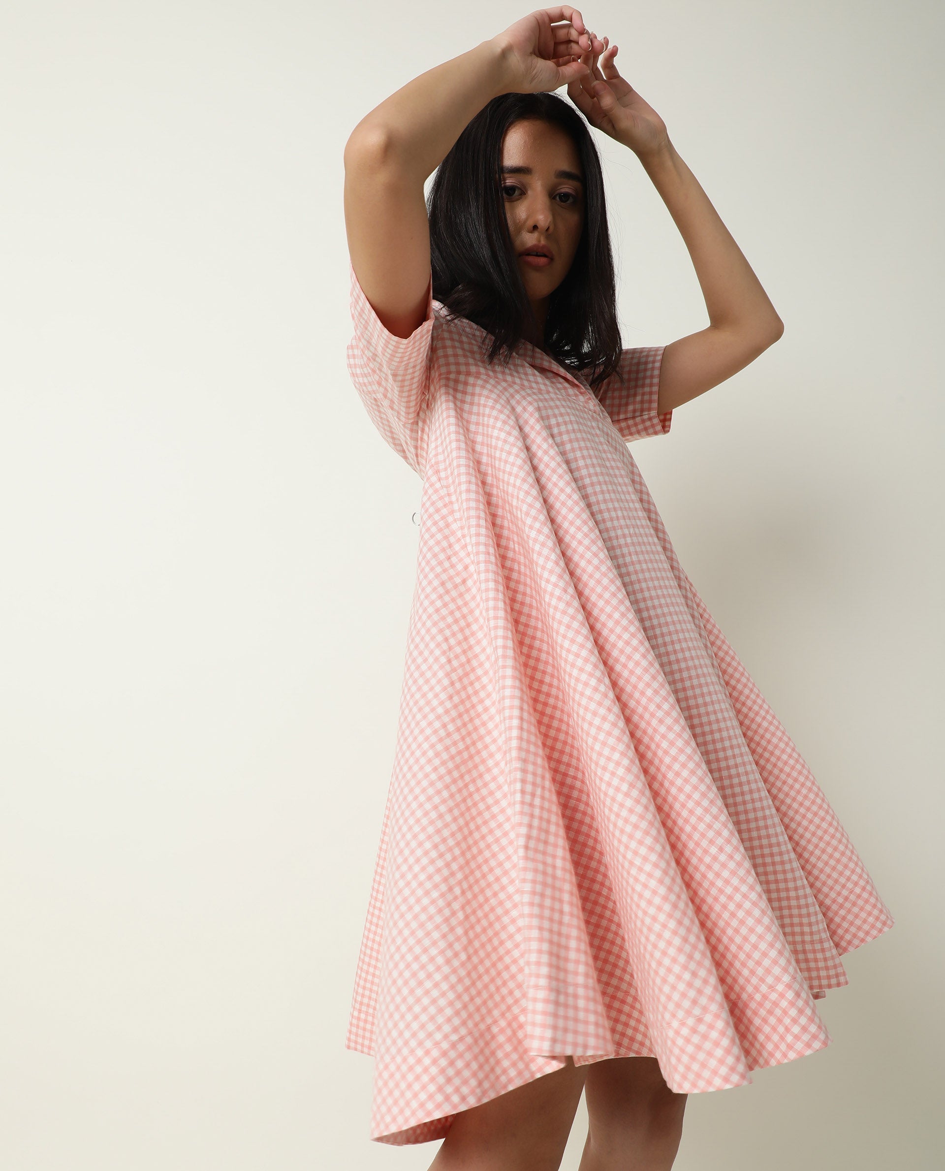 CIRCULAR FLARED GINGHAM CHECKS MIDI DRESS