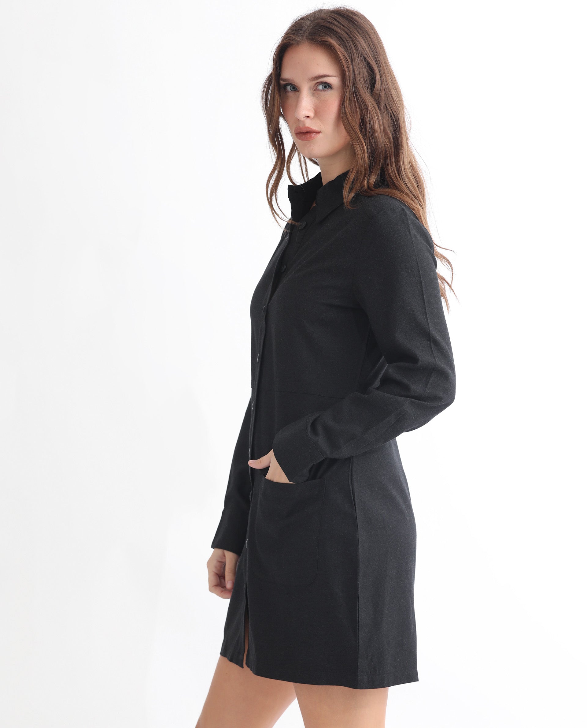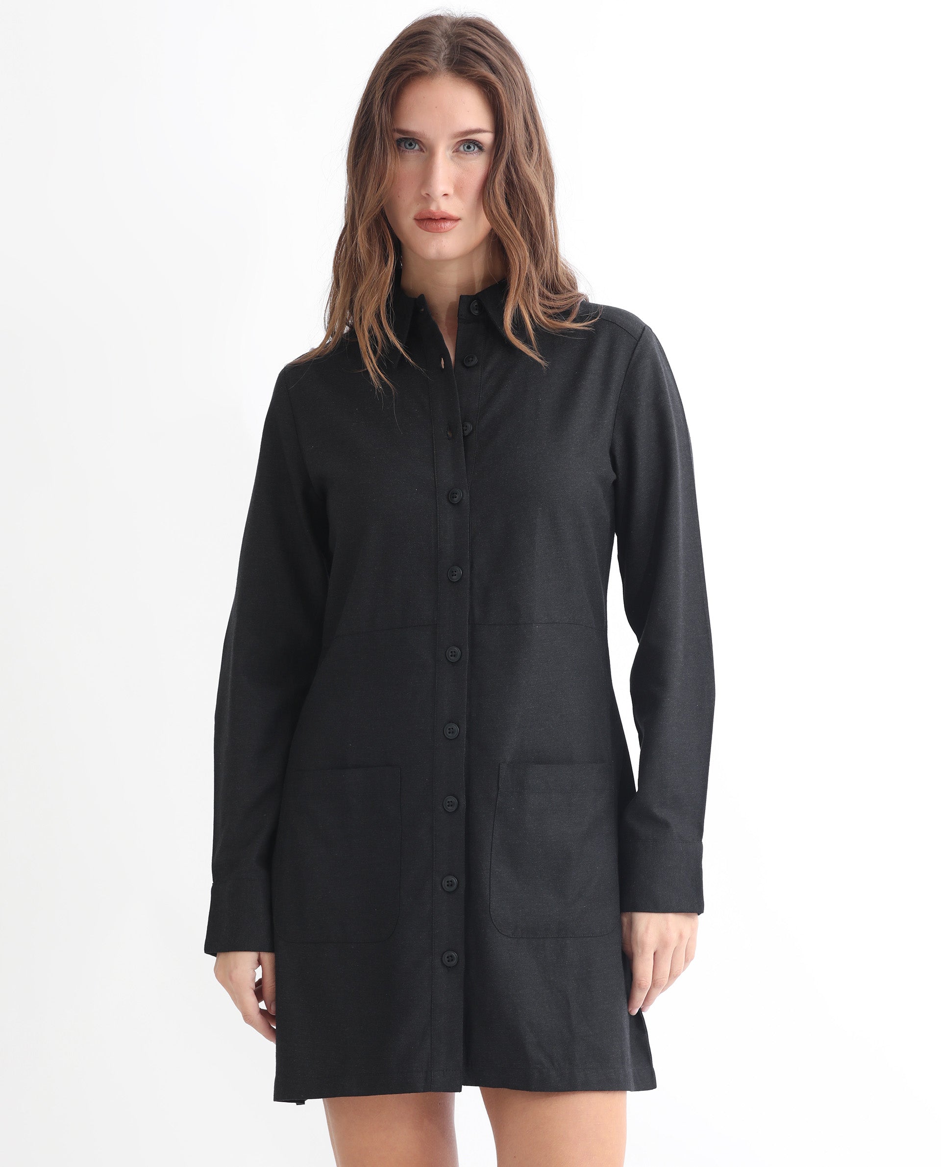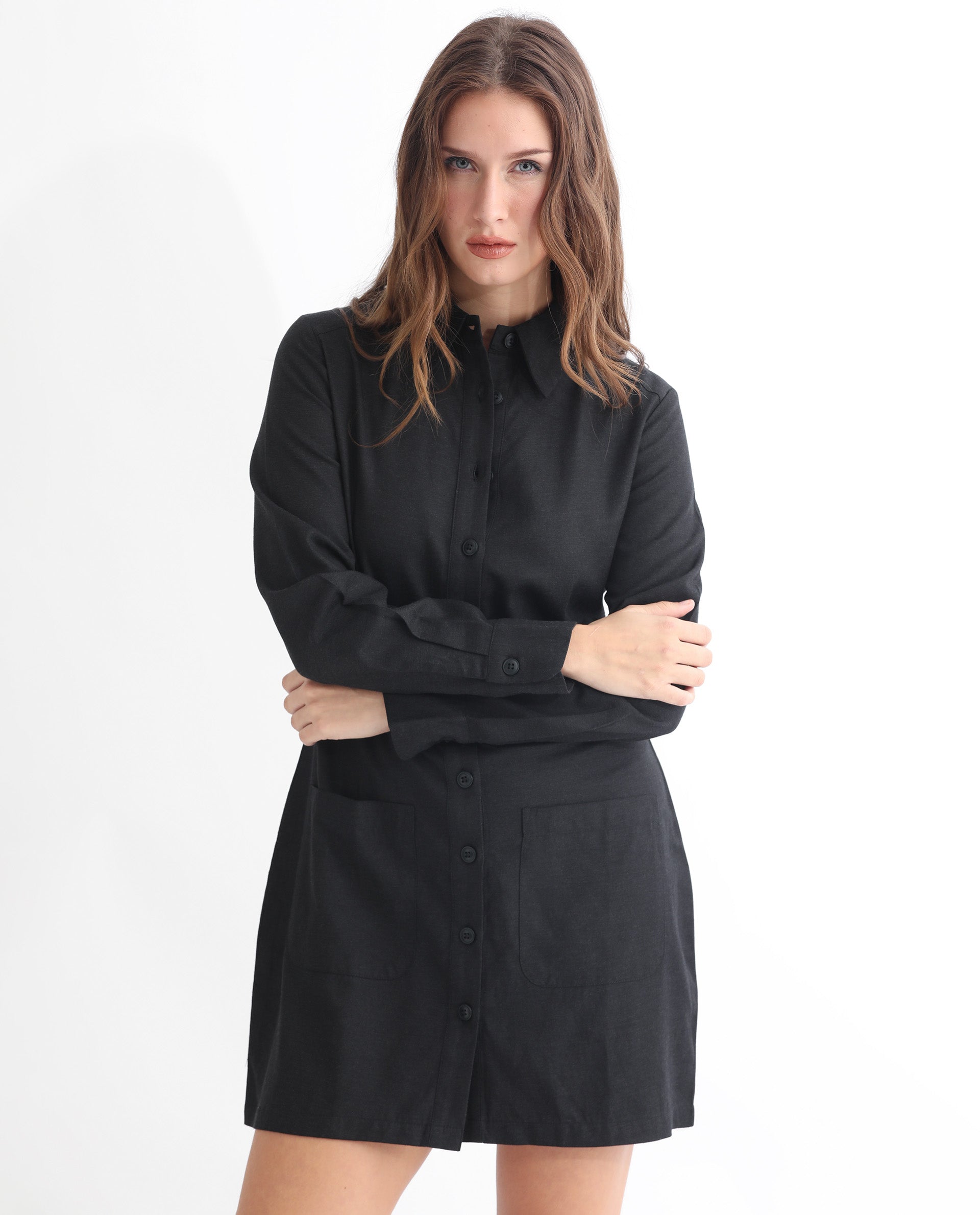 Rareism Women Pricot Black Polyester Fabric Full Sleeves Button Closure Shirt Collar Cuffed Sleeve Regular Fit Plain Short Boxy Dress