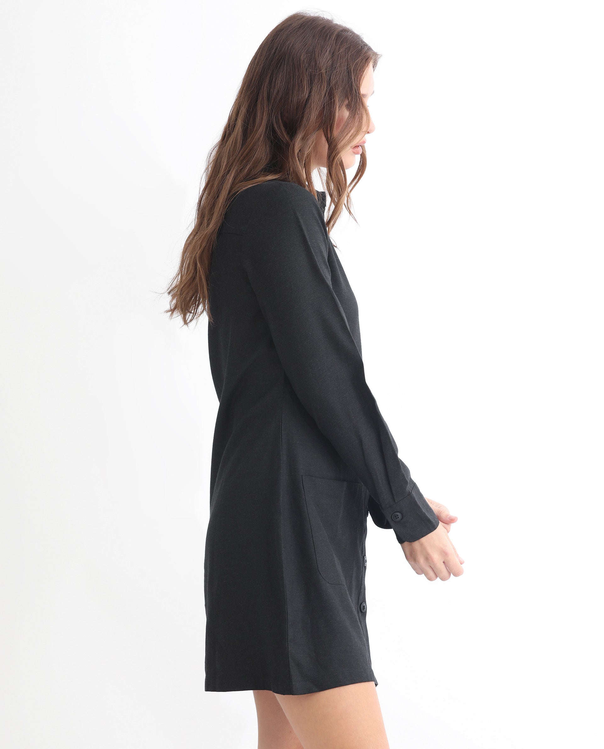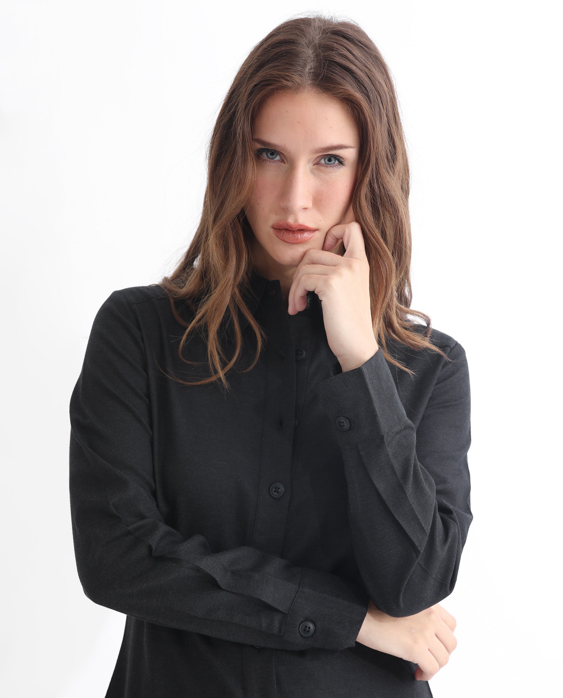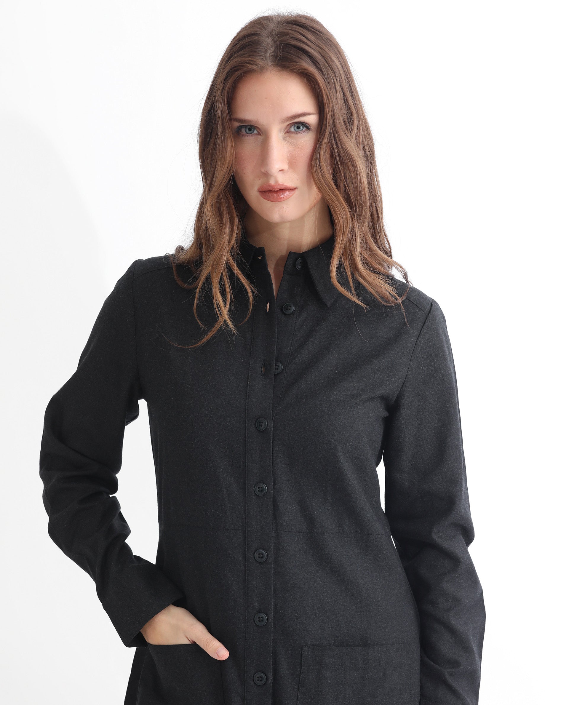 Rareism Women Pricot Black Polyester Fabric Full Sleeves Button Closure Shirt Collar Cuffed Sleeve Regular Fit Plain Short Boxy Dress