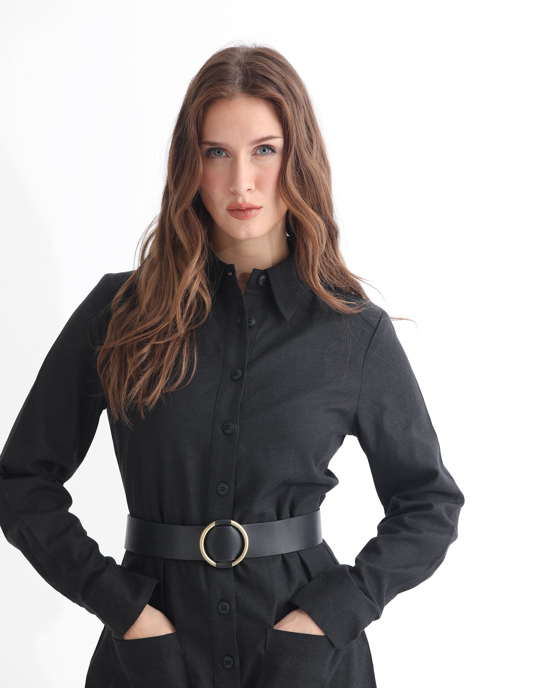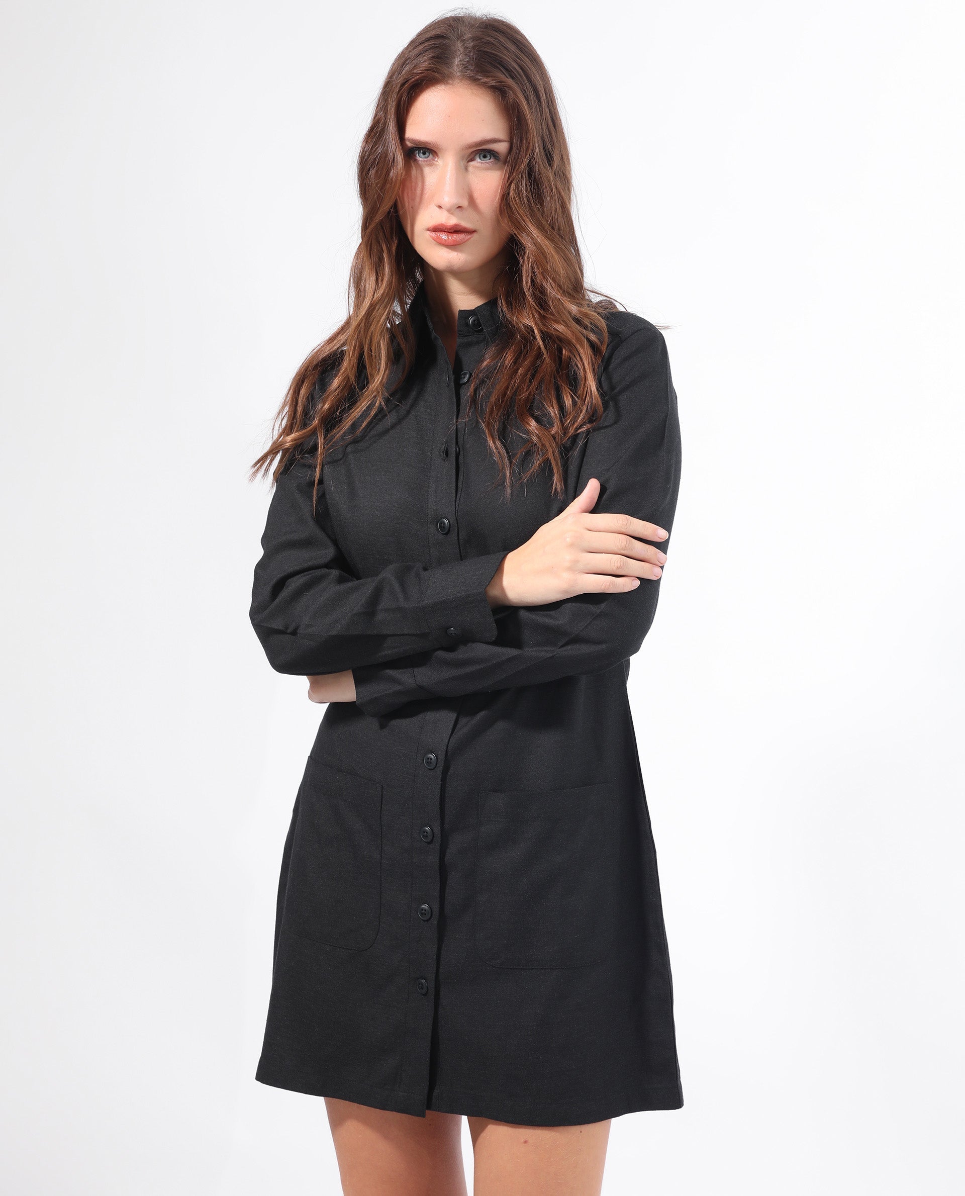 1. Elevate your casual look with our Short Dress featuring a basic collar for a timeless touch. 2. Cuffed sleeves add a hint of sophistication to the ensemble.