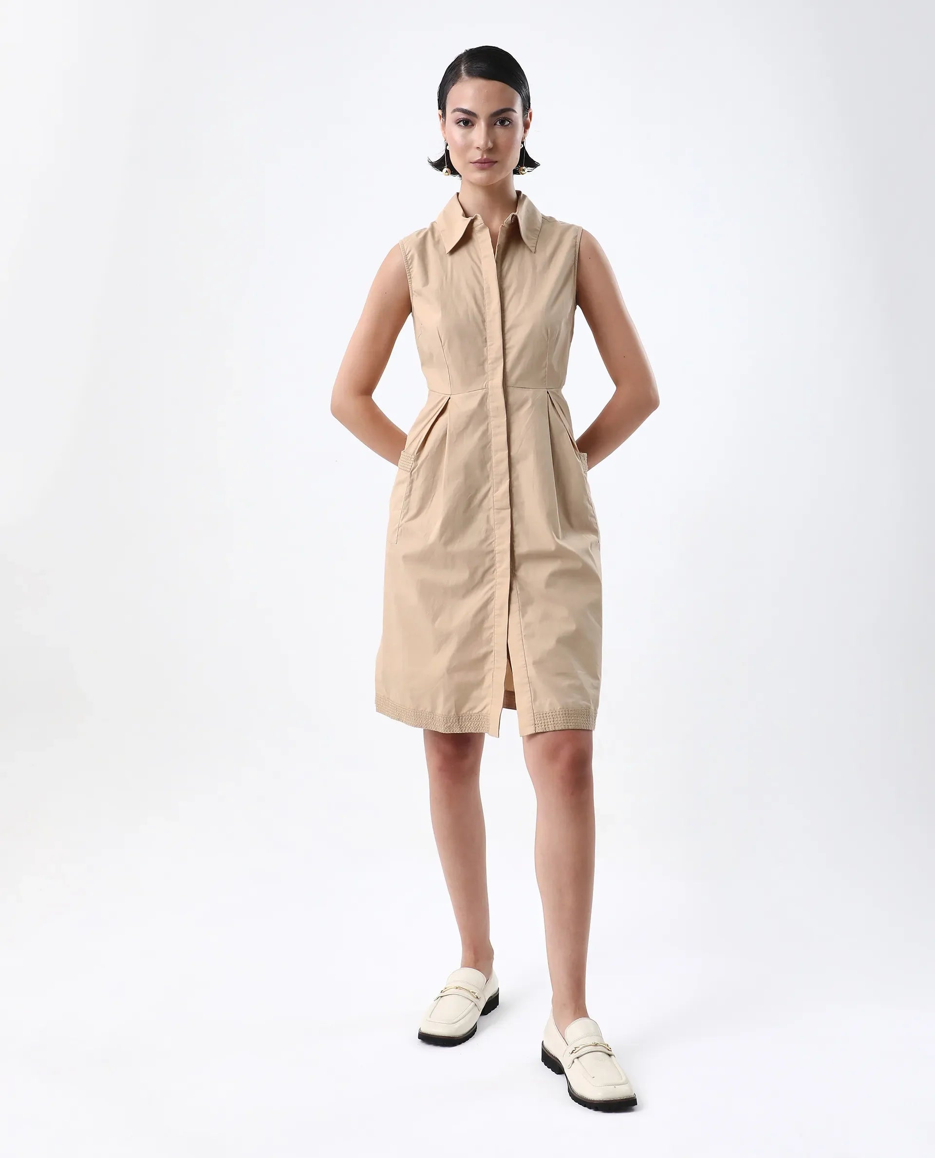 Rareism Women Qba Light Sand Cotton Fabric Sleeveless Collared Neck Button Closure A-Line Midi Plain Dress