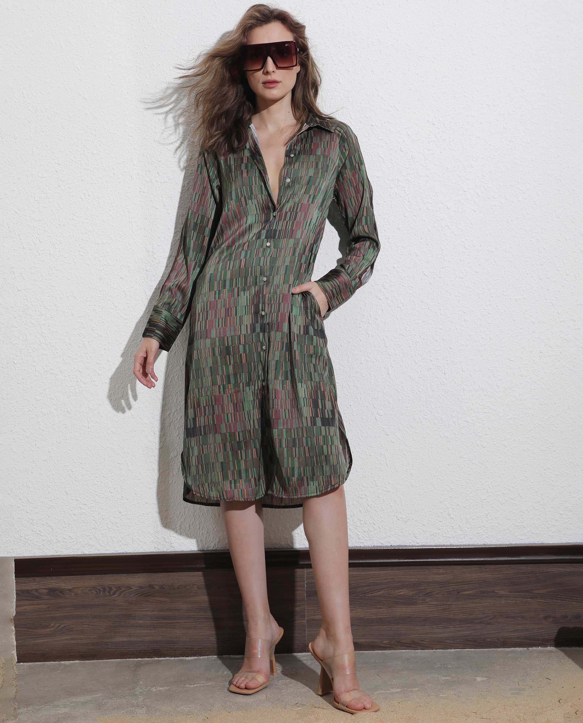 GEOMETRIC PRINT SATIN MIDI SHIRT DRESS