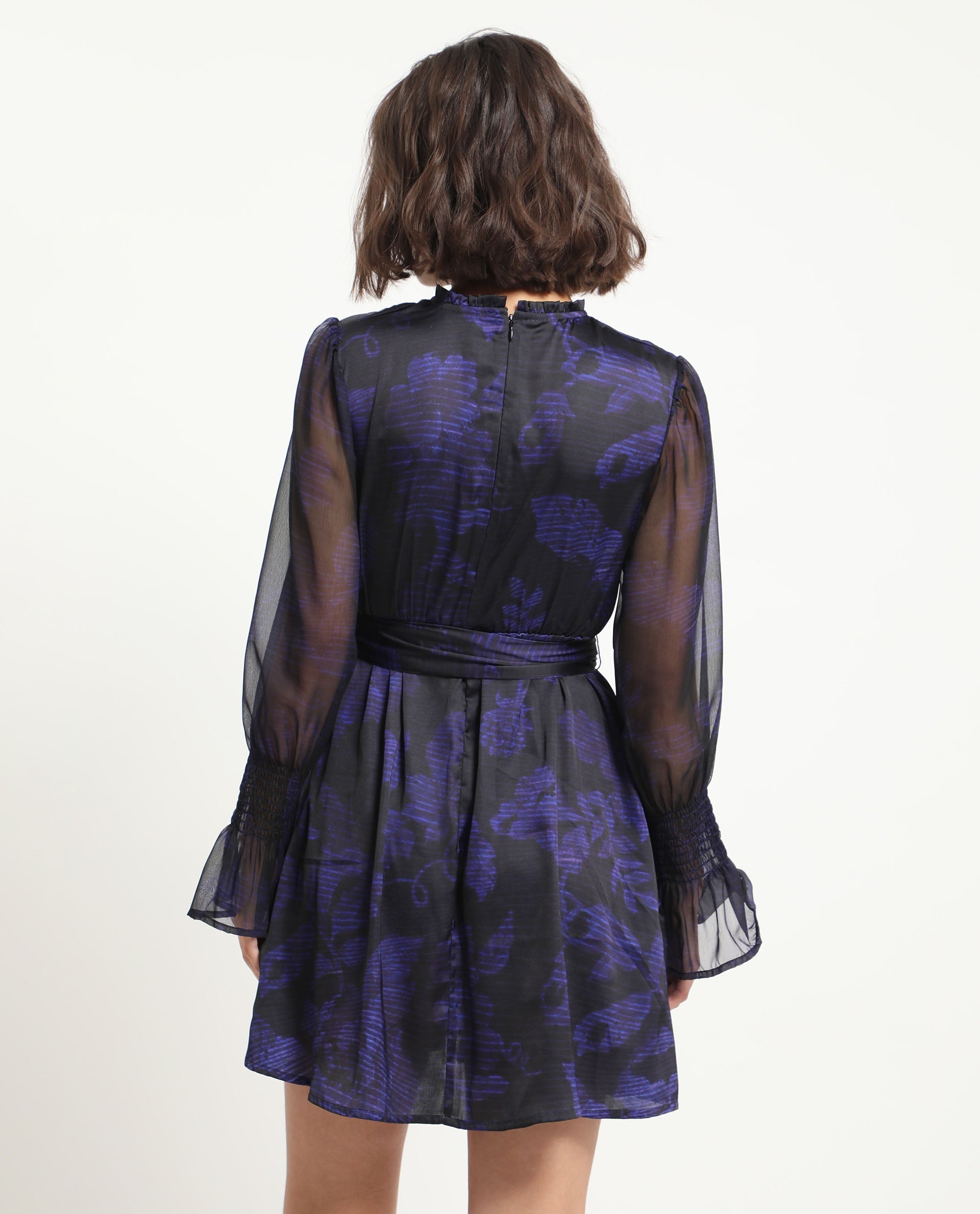 Rareism Women Rossel Dark Navy Polyester Fabric Full Sleeves High Neck Balloon Sleeve Regular Fit Abstract Print Short Empire Dress