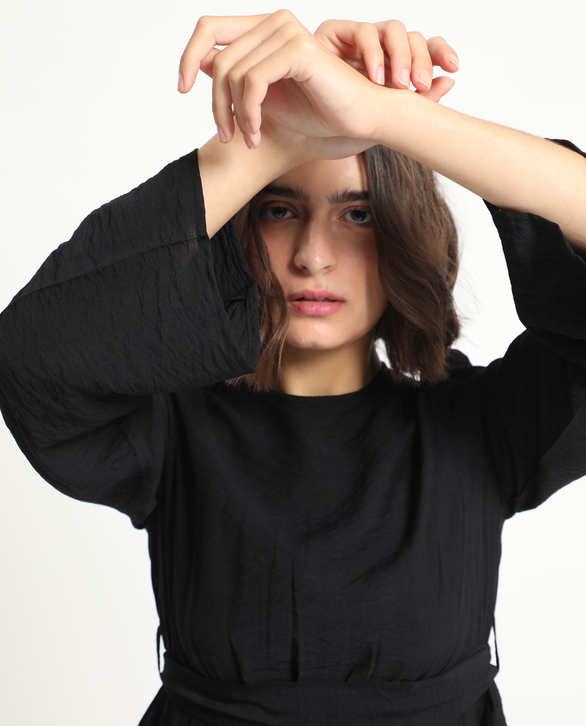 Rareism Women Sahar Black Viscose Nylon Fabric Full Sleeves Zip Closure Round Neck Raglan Sleeve Fit And Flare Plain Knee Length Empire Dress