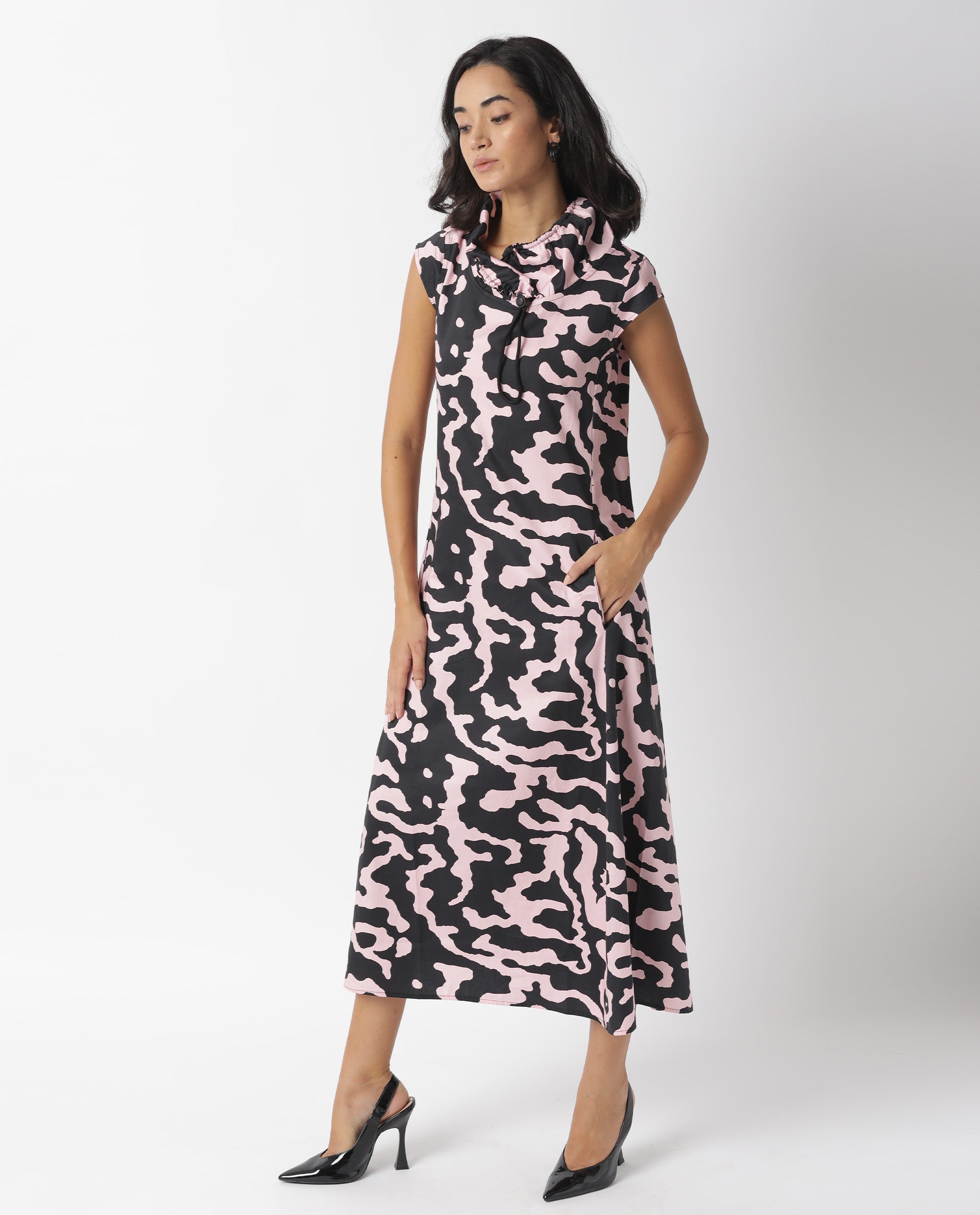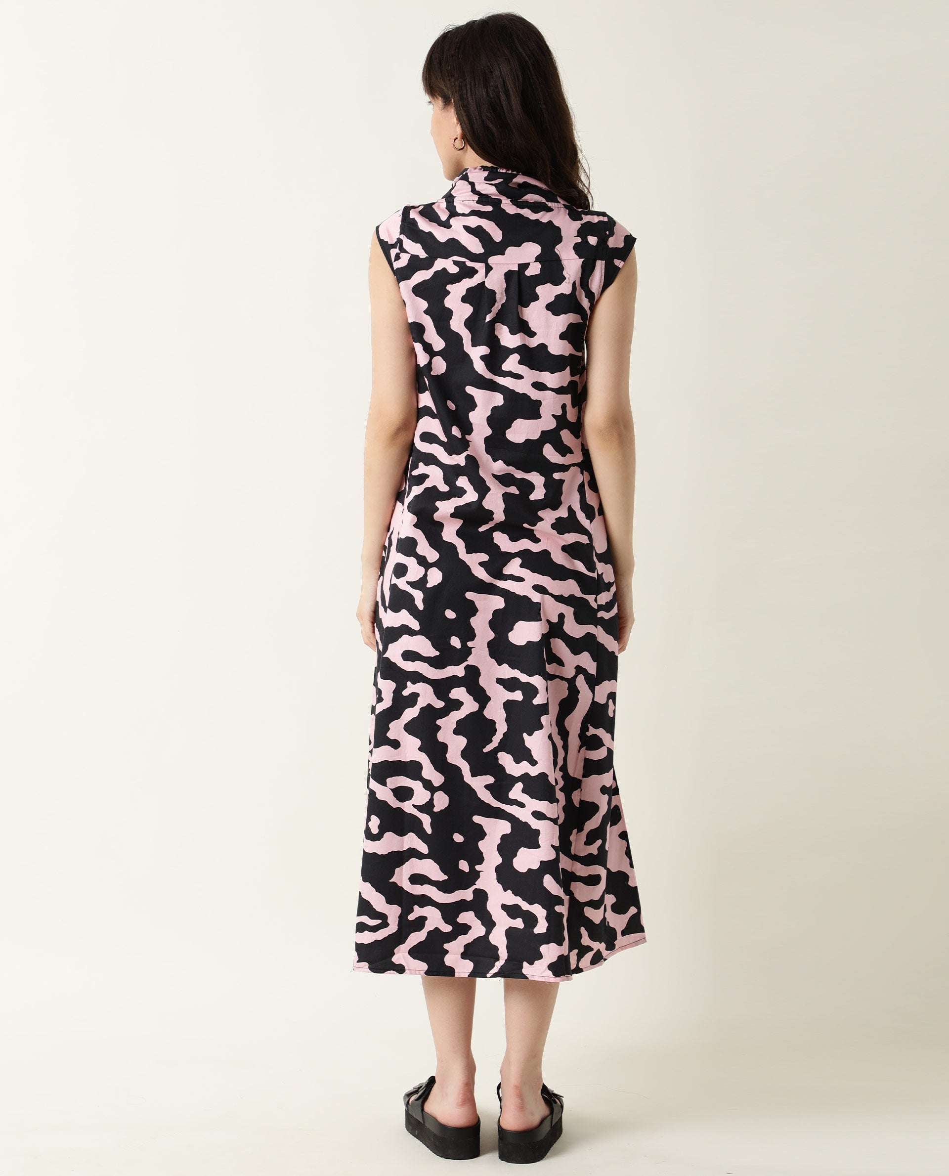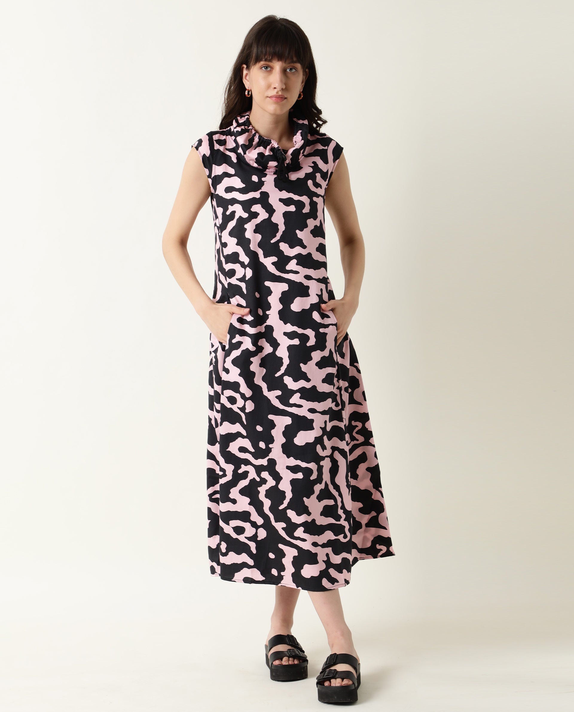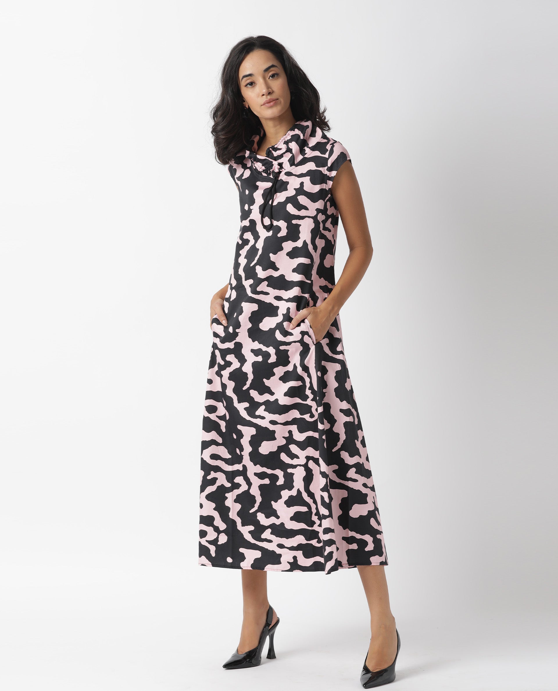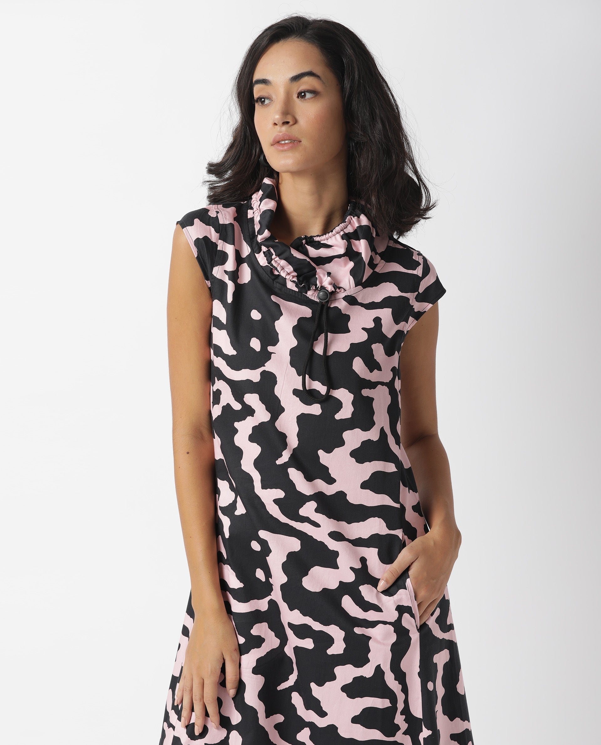 A contemporary style sleeveless midi in abstract print.