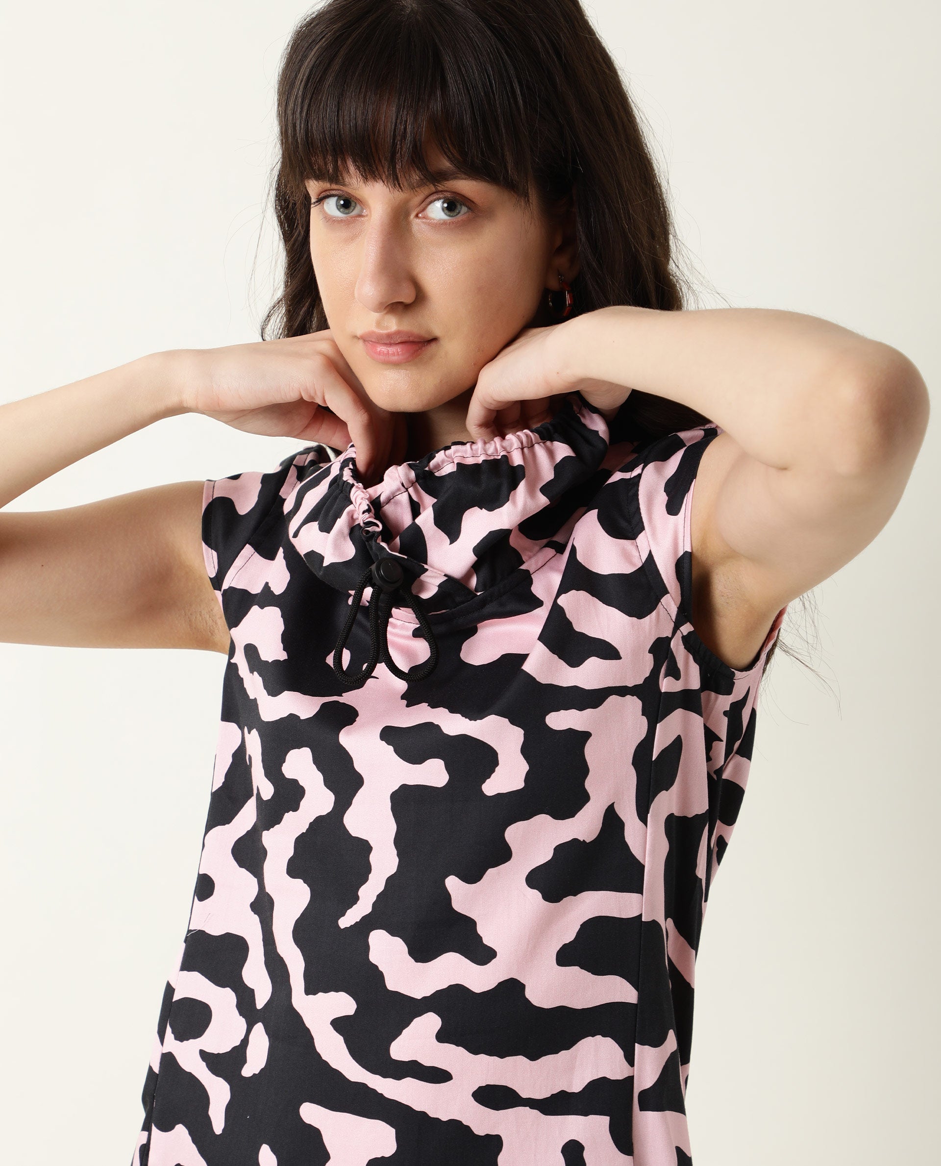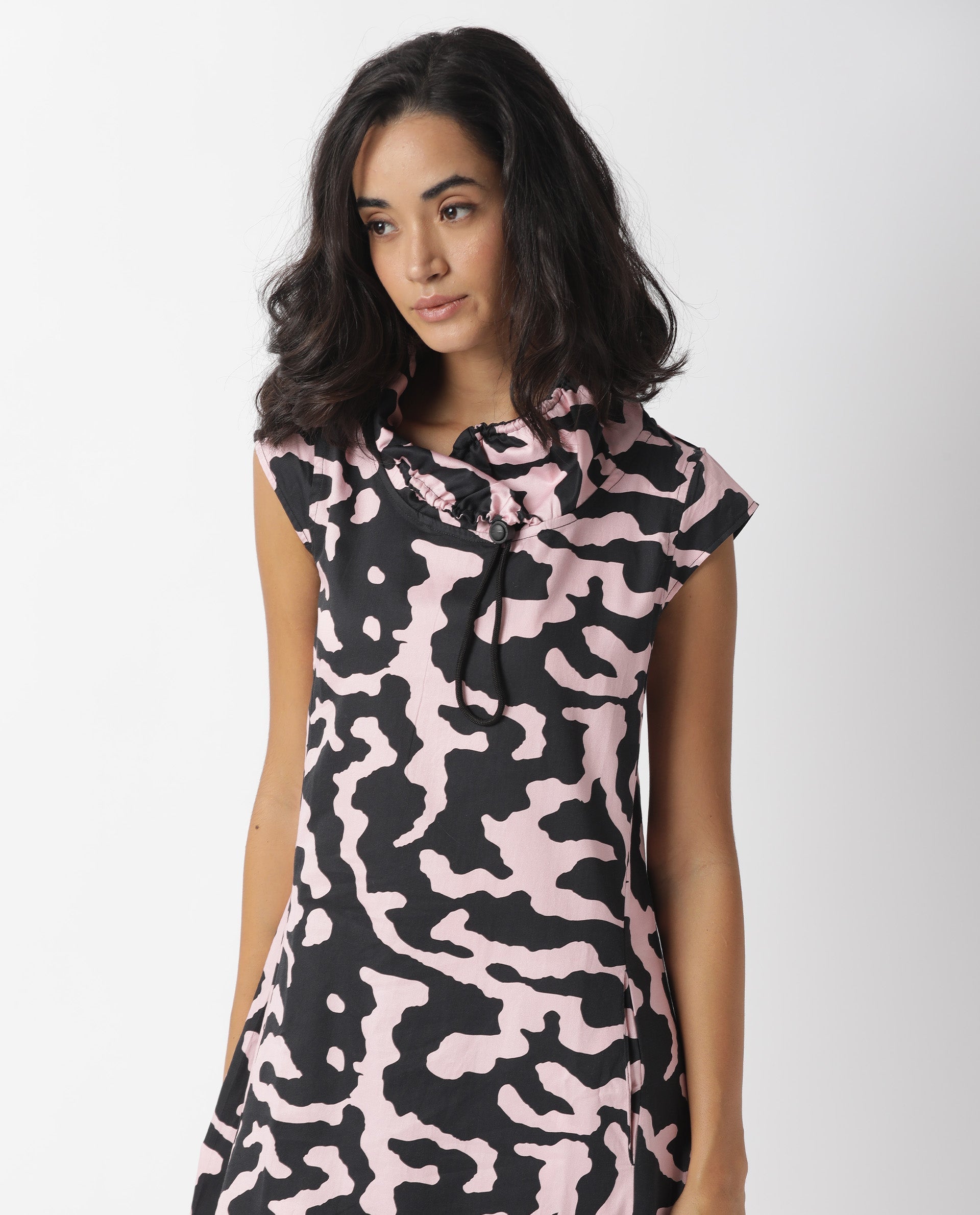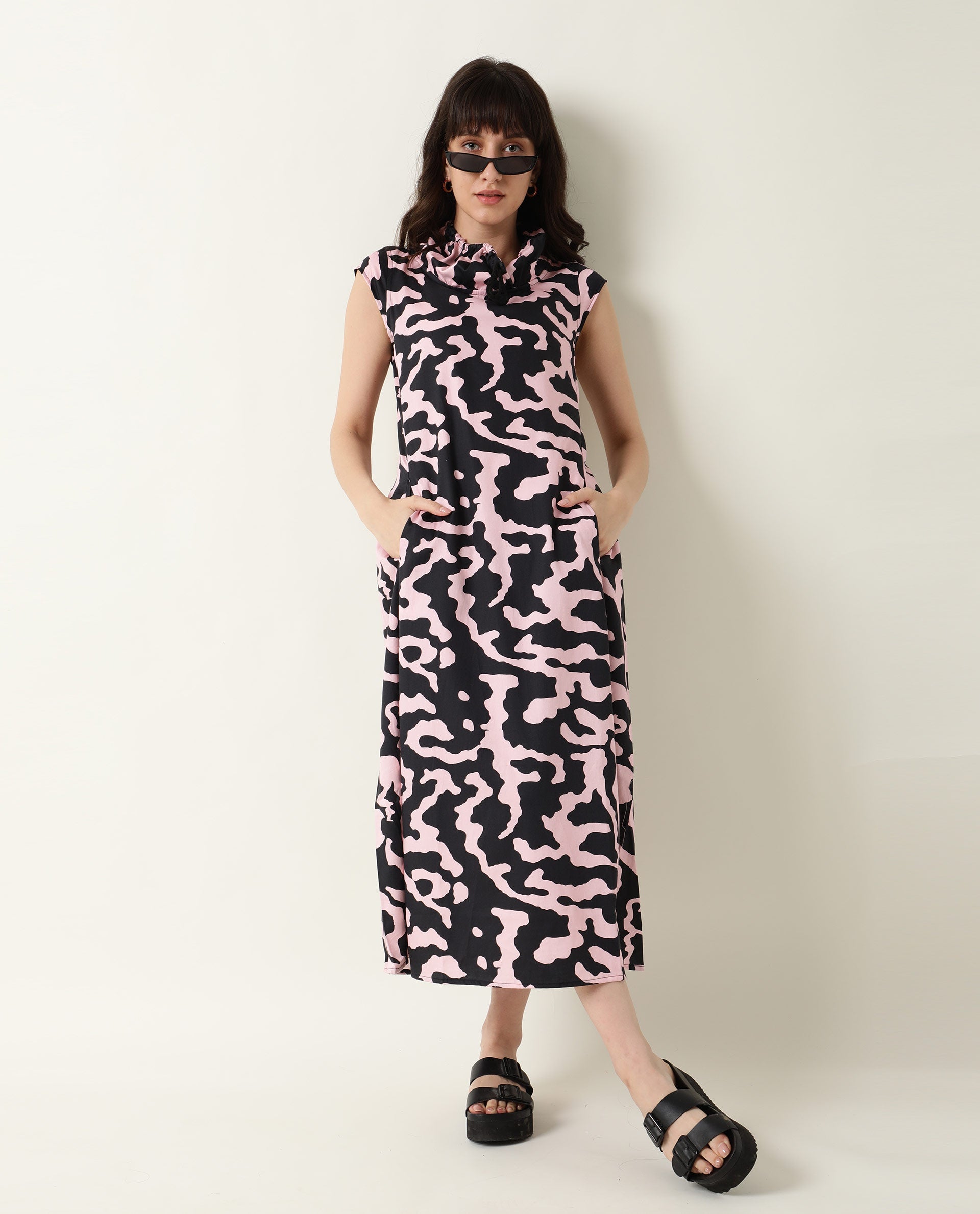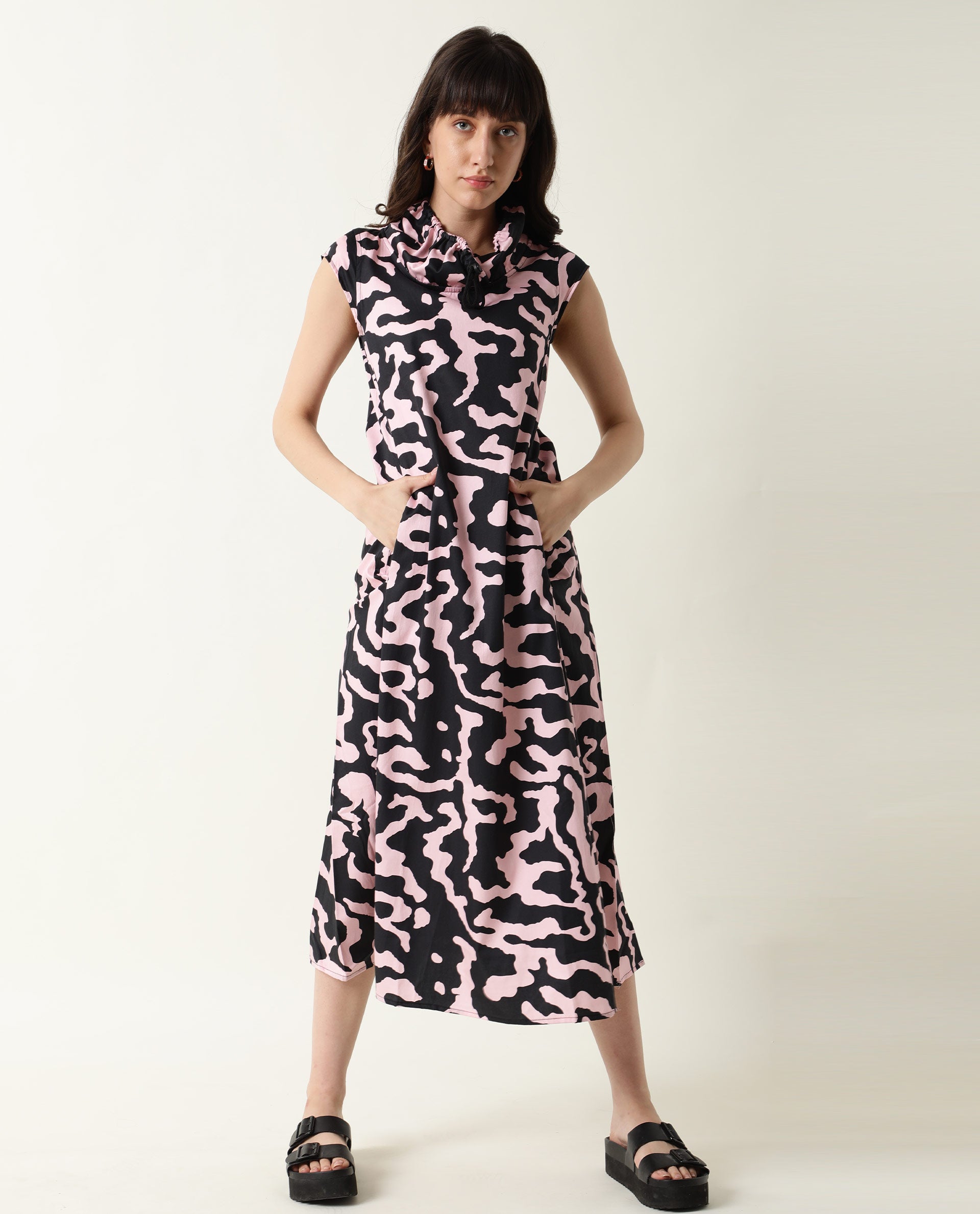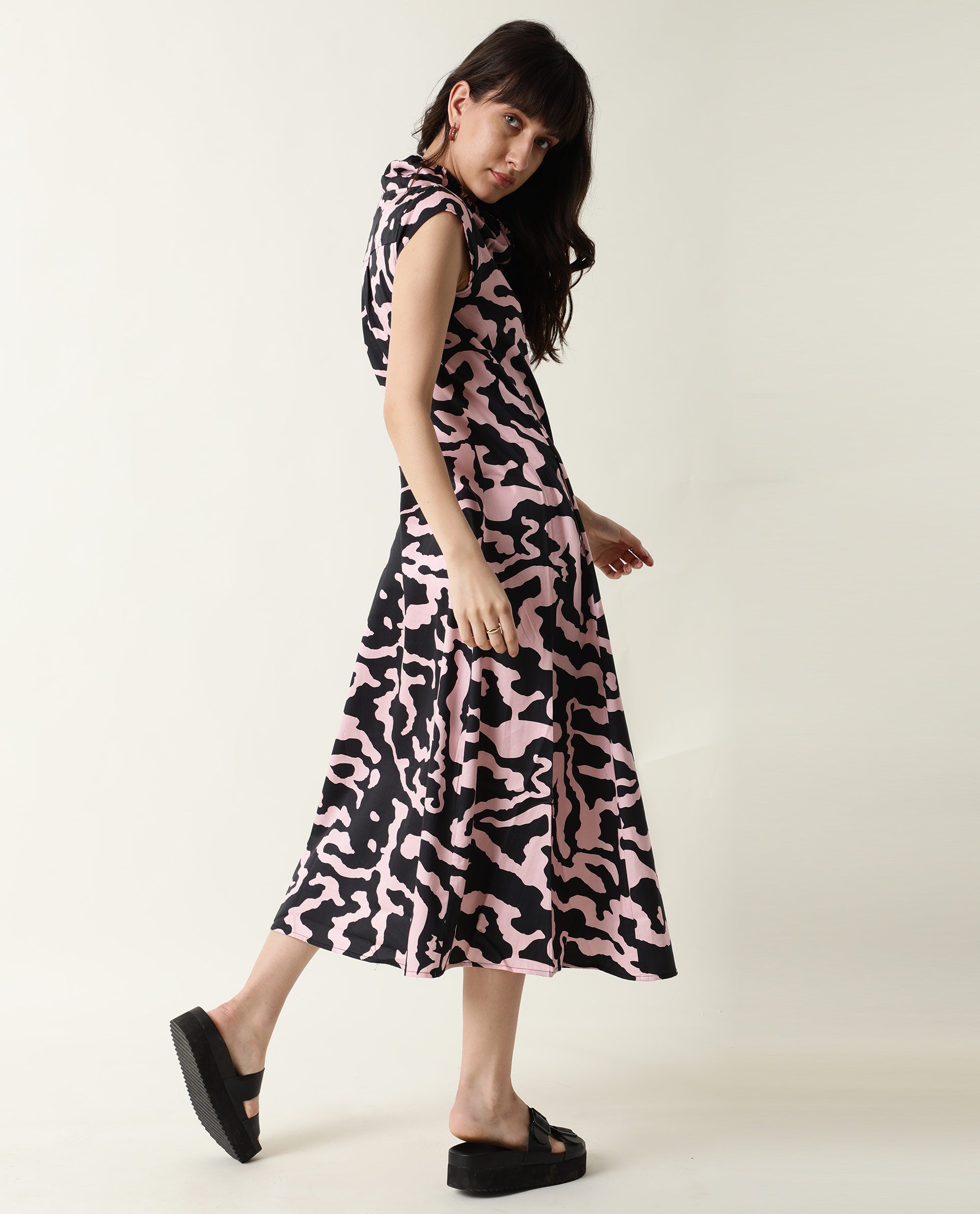 A contemporary style sleeveless midi in abstract print.