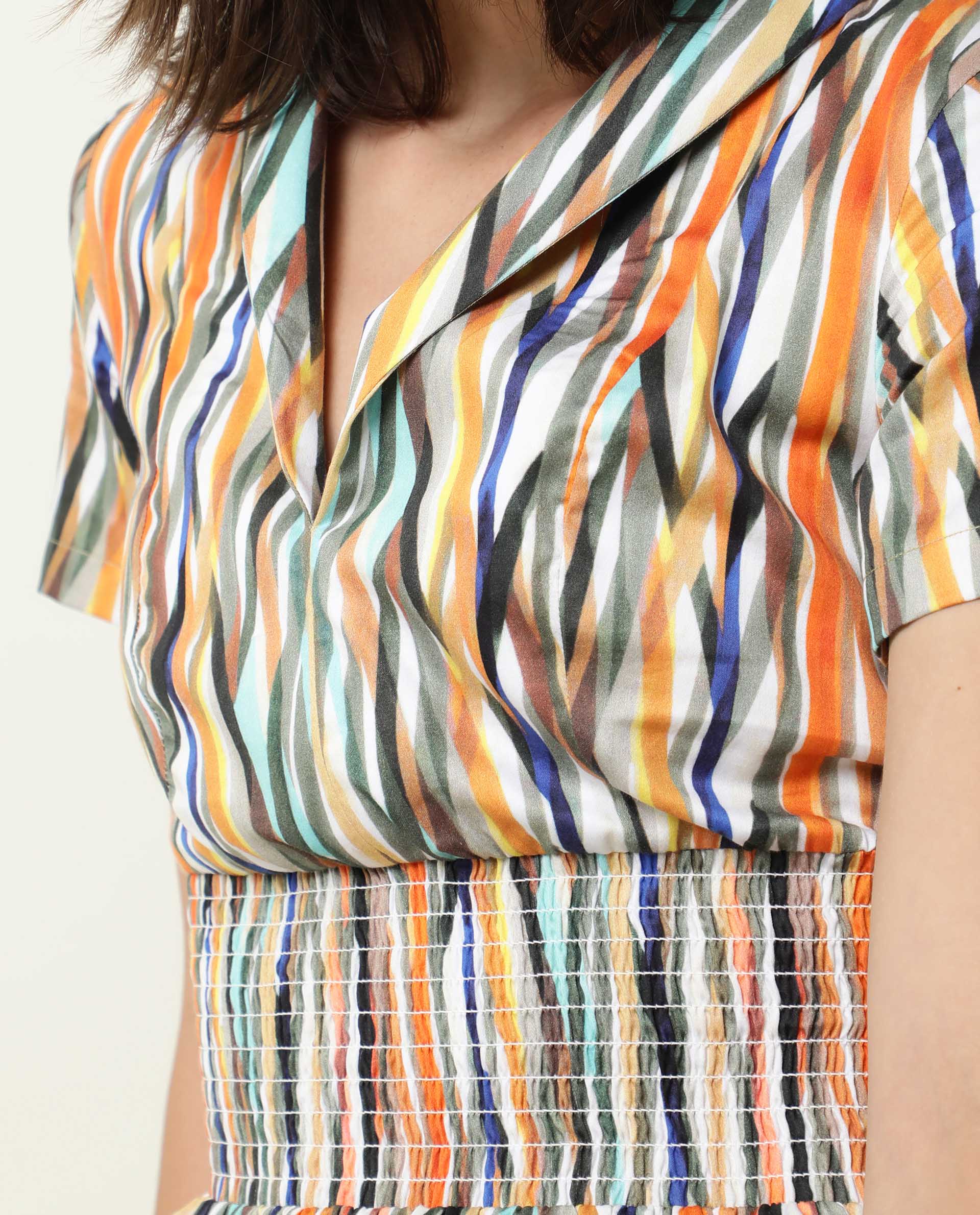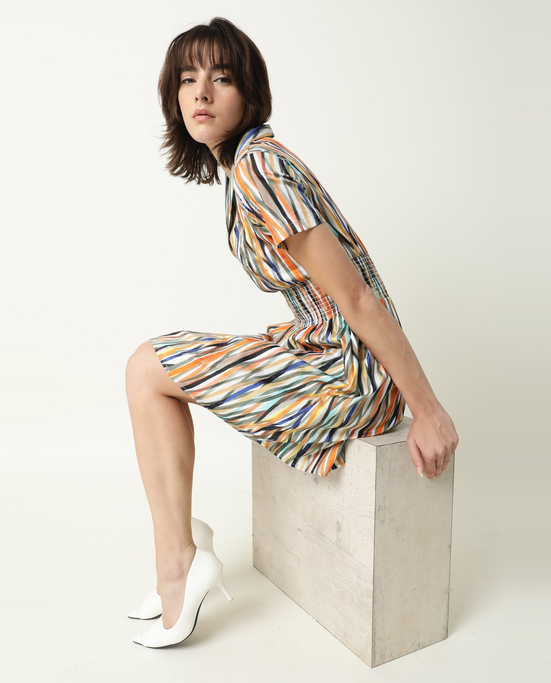 A contemporary style fit and flare dress in abstract multi stripe print.