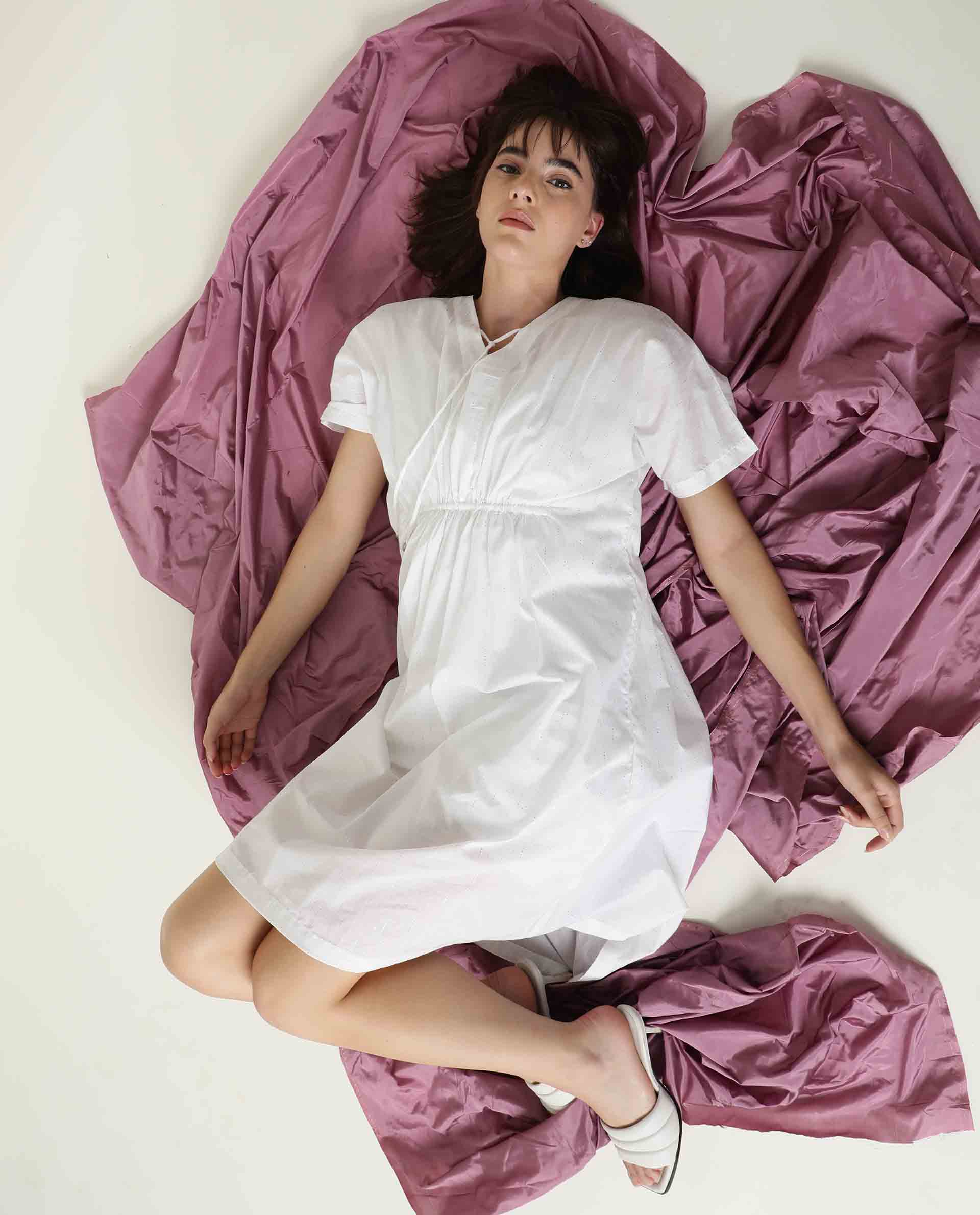 Rareism Women Shawn White V Neck Tie Up Half Sleeves Drawstring At Waist With Pockets Kaftan Knee Length Dress