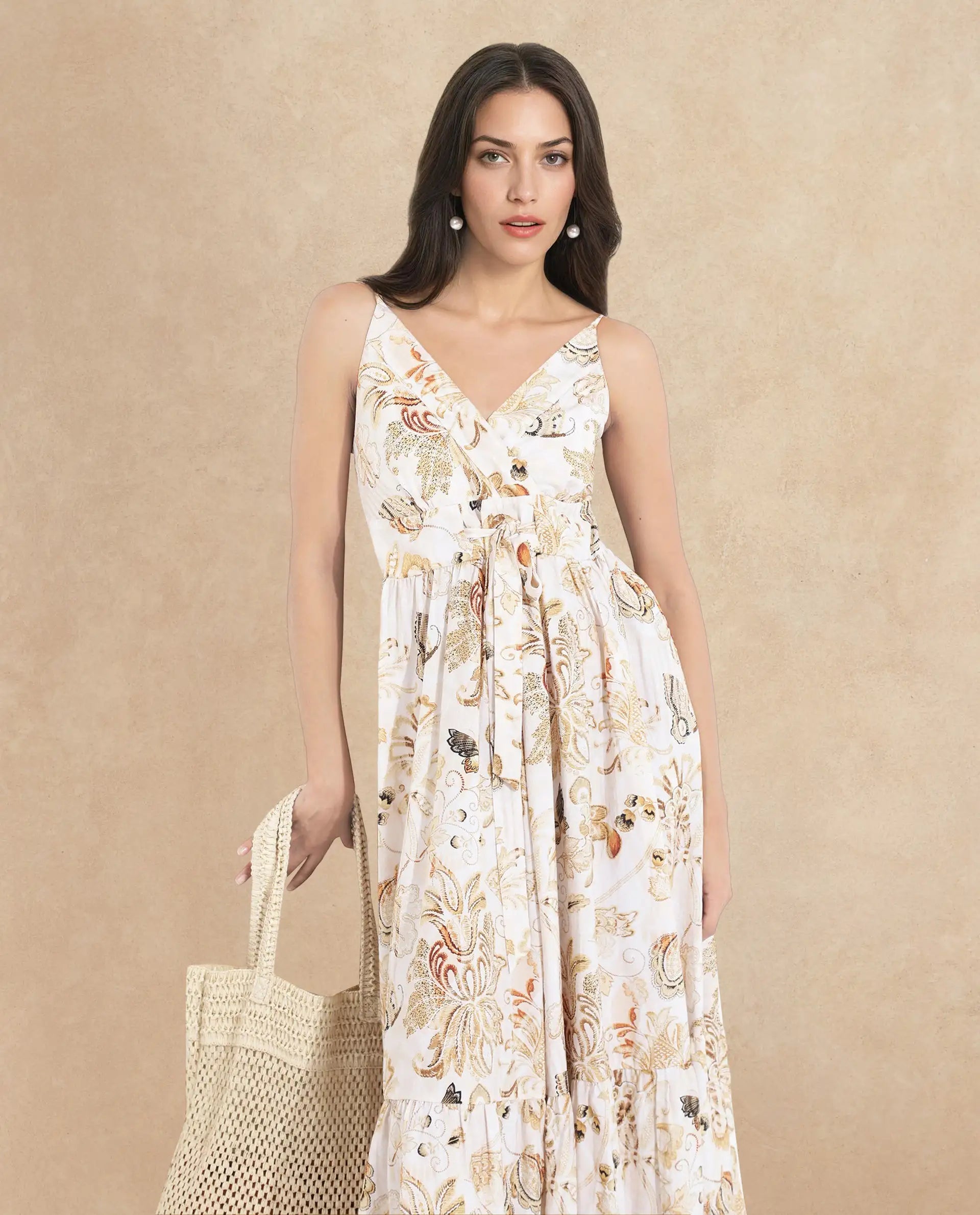 Elevate your wardrobe with this stunning floral maxi dress, perfect for any occasion. Featuring a delicate floral print, this dress offers a sleeveless design and a flattering V-neckline. The flowing maxi length provides an elegant silhouette, while the relaxed fit ensures comfort throughout the day. Crafted from high-quality fabric, this dress is both stylish and durable. Ideal for summer outings or special events, pair it with your favorite heels for a chic look. Experience effortless elegance with this must-have addition to your collection.