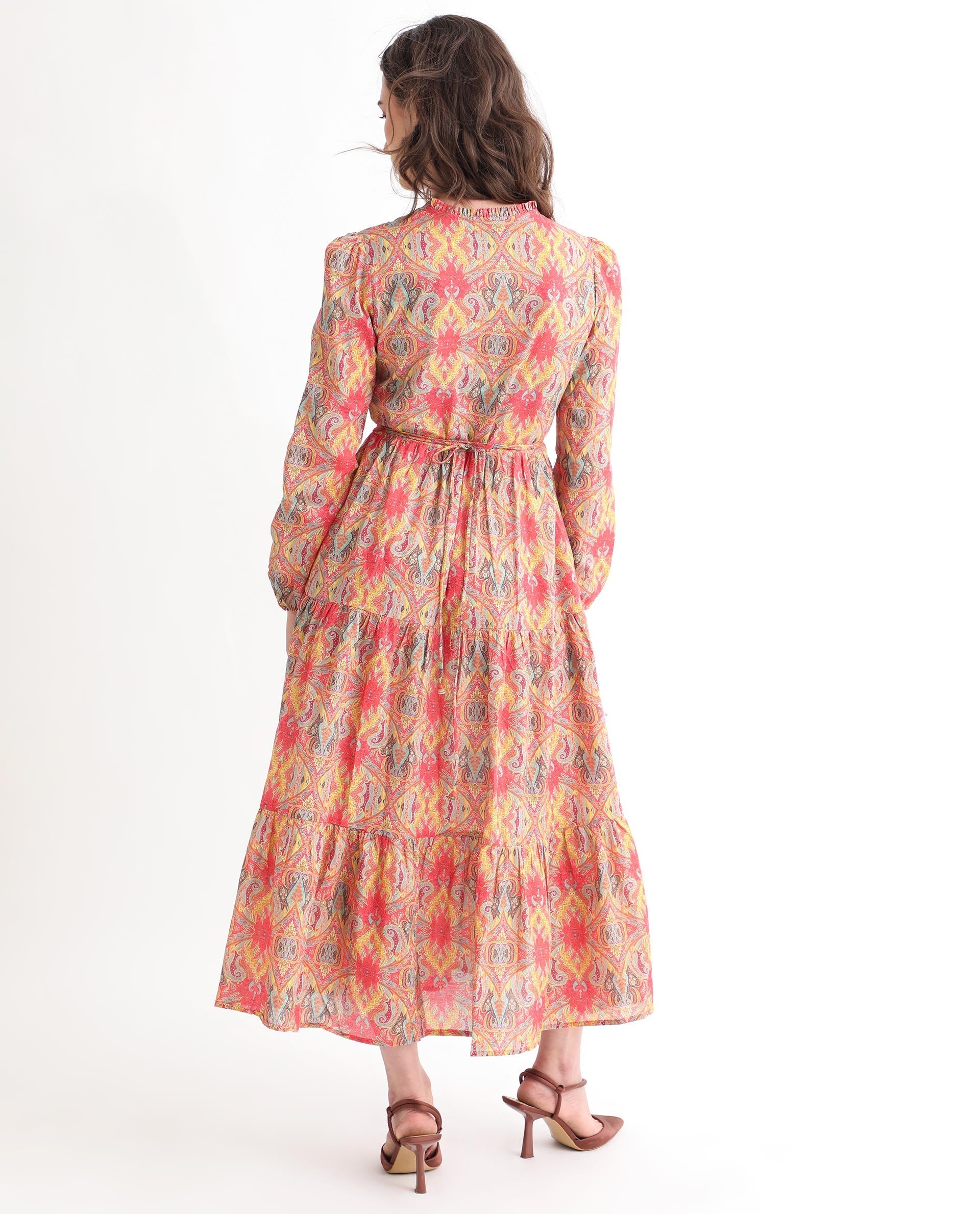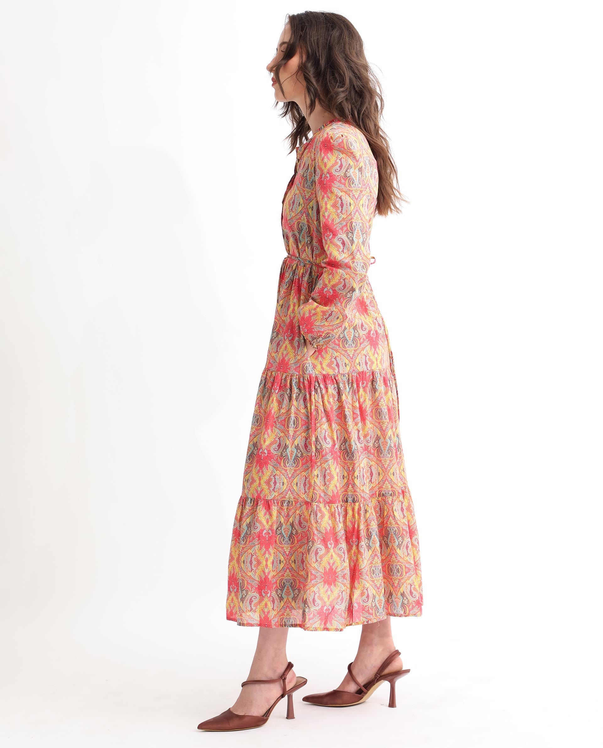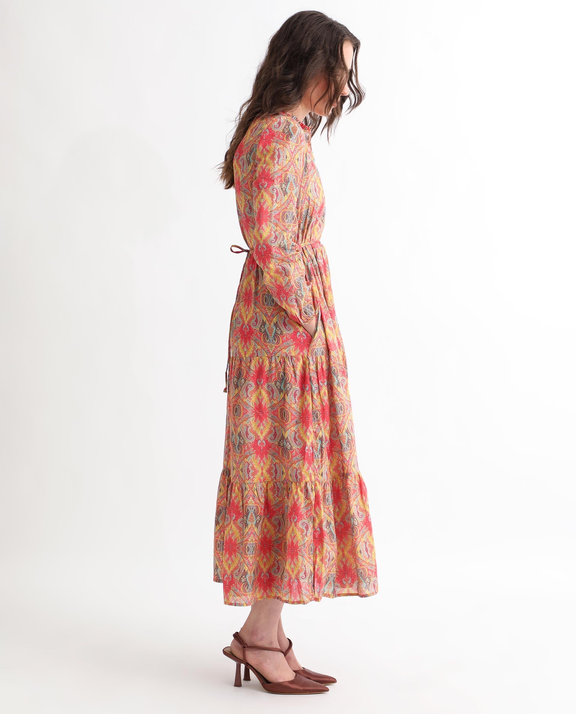 1. *Embrace bohemian elegance with full sleeves and a sweeping maxi length, perfect for effortless style. 2. Enjoy a seamless neckline adorned with a delicate ruffle insert, adding a touch of femininity. 3. Featuring front buttons and a long drawcord belt with button and tassel tipping, providing versatility in styling. 4. Stay practical with side pockets, offering convenience without sacrificing style. 5. Crafted from breathable cotton fabric, ensuring comfort and ease of wear. Pair with bohemian-inspired sandals and layered jewellery for a relaxed daytime look or dress it up with wedges and statement accessories for an outdoor event. Ideal for casual outings, beach gatherings, or daytime celebrations, this dress offers a blend of comfort and effortless style.