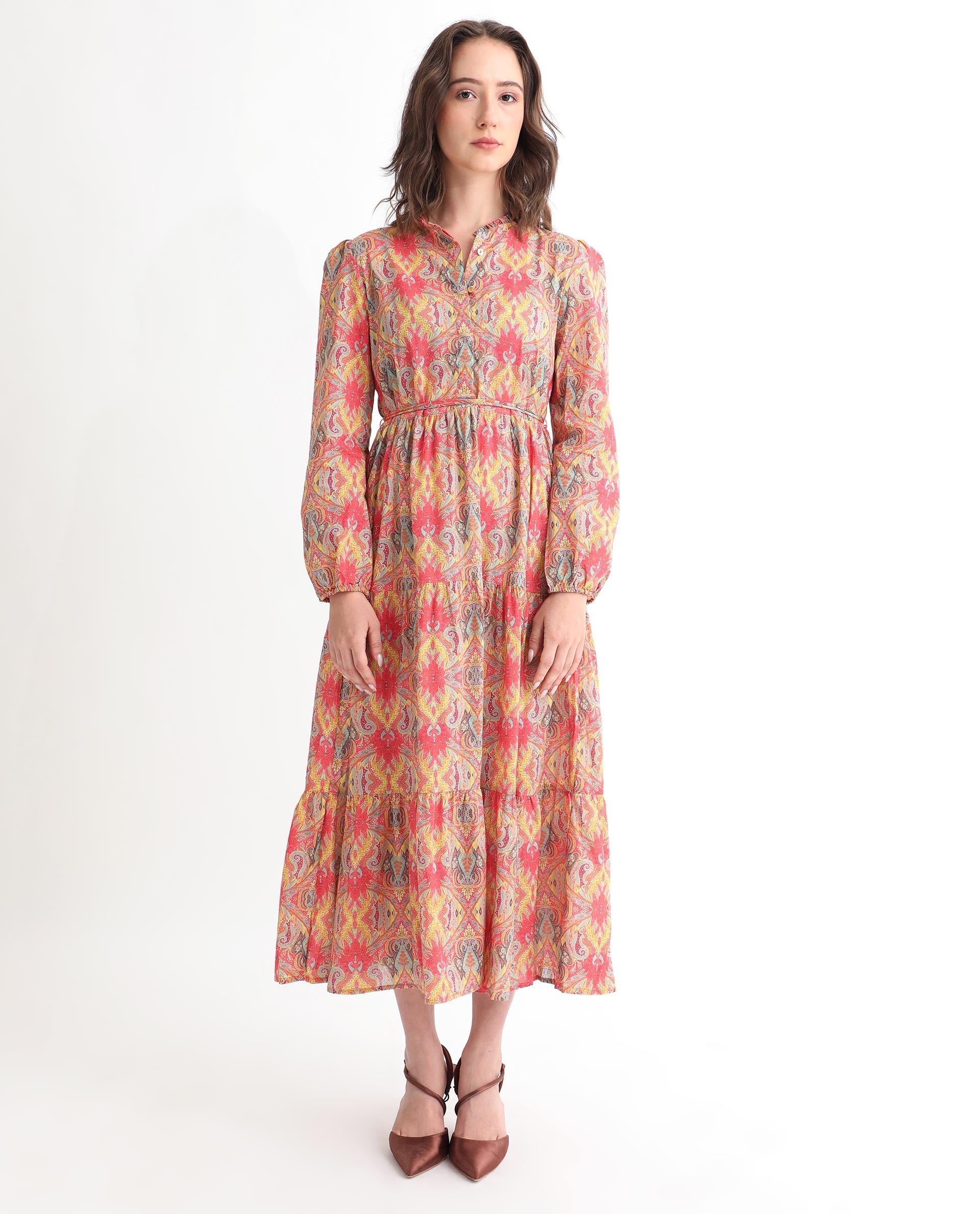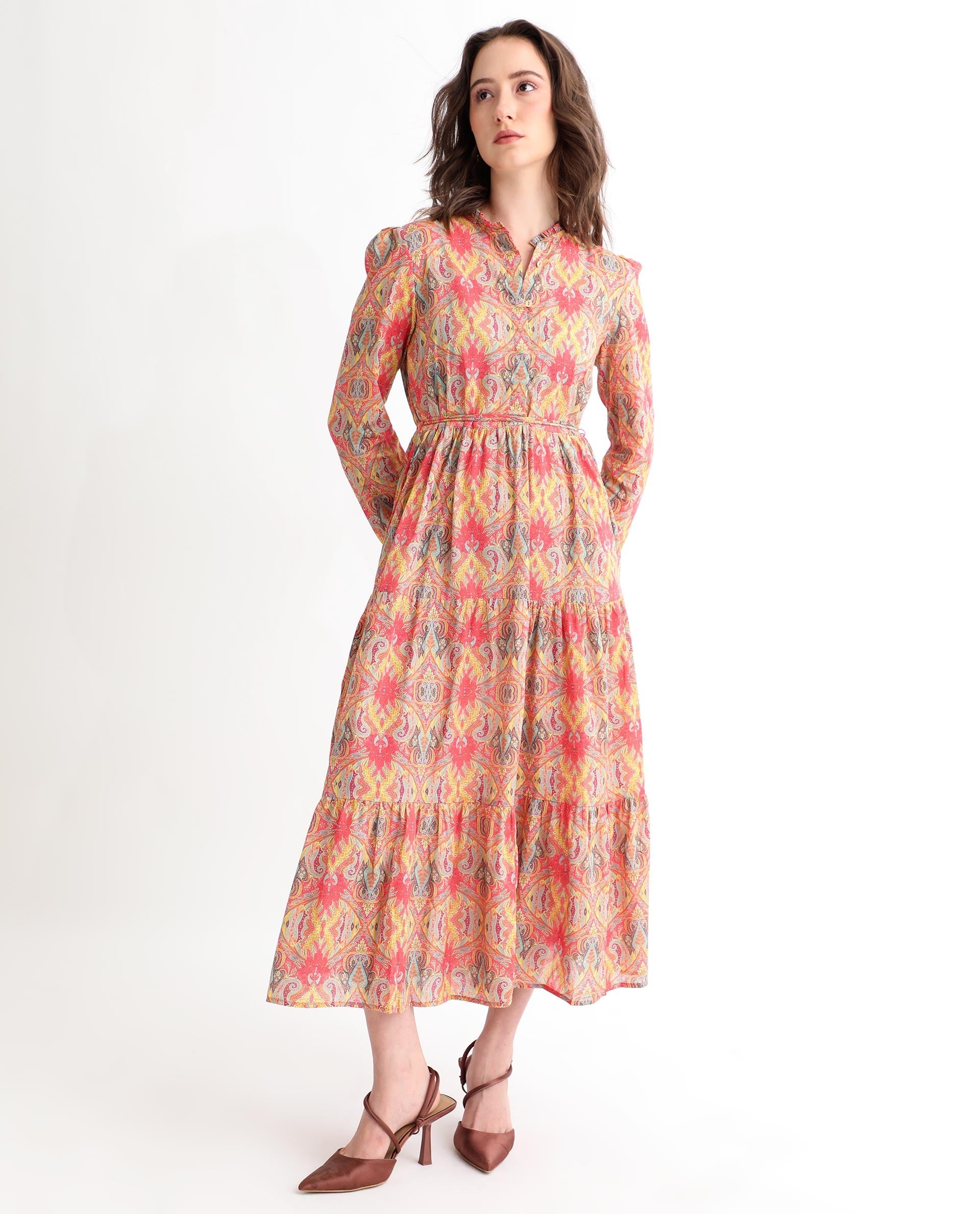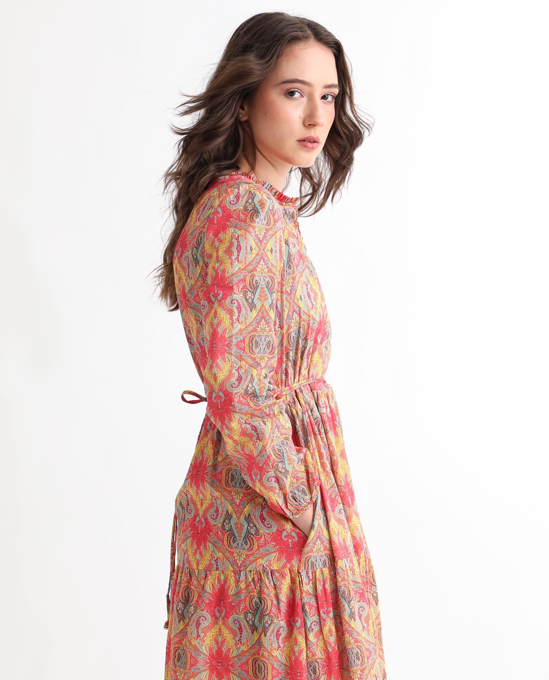 1. *Embrace bohemian elegance with full sleeves and a sweeping maxi length, perfect for effortless style. 2. Enjoy a seamless neckline adorned with a delicate ruffle insert, adding a touch of femininity. 3. Featuring front buttons and a long drawcord belt with button and tassel tipping, providing versatility in styling. 4. Stay practical with side pockets, offering convenience without sacrificing style. 5. Crafted from breathable cotton fabric, ensuring comfort and ease of wear. Pair with bohemian-inspired sandals and layered jewellery for a relaxed daytime look or dress it up with wedges and statement accessories for an outdoor event. Ideal for casual outings, beach gatherings, or daytime celebrations, this dress offers a blend of comfort and effortless style.