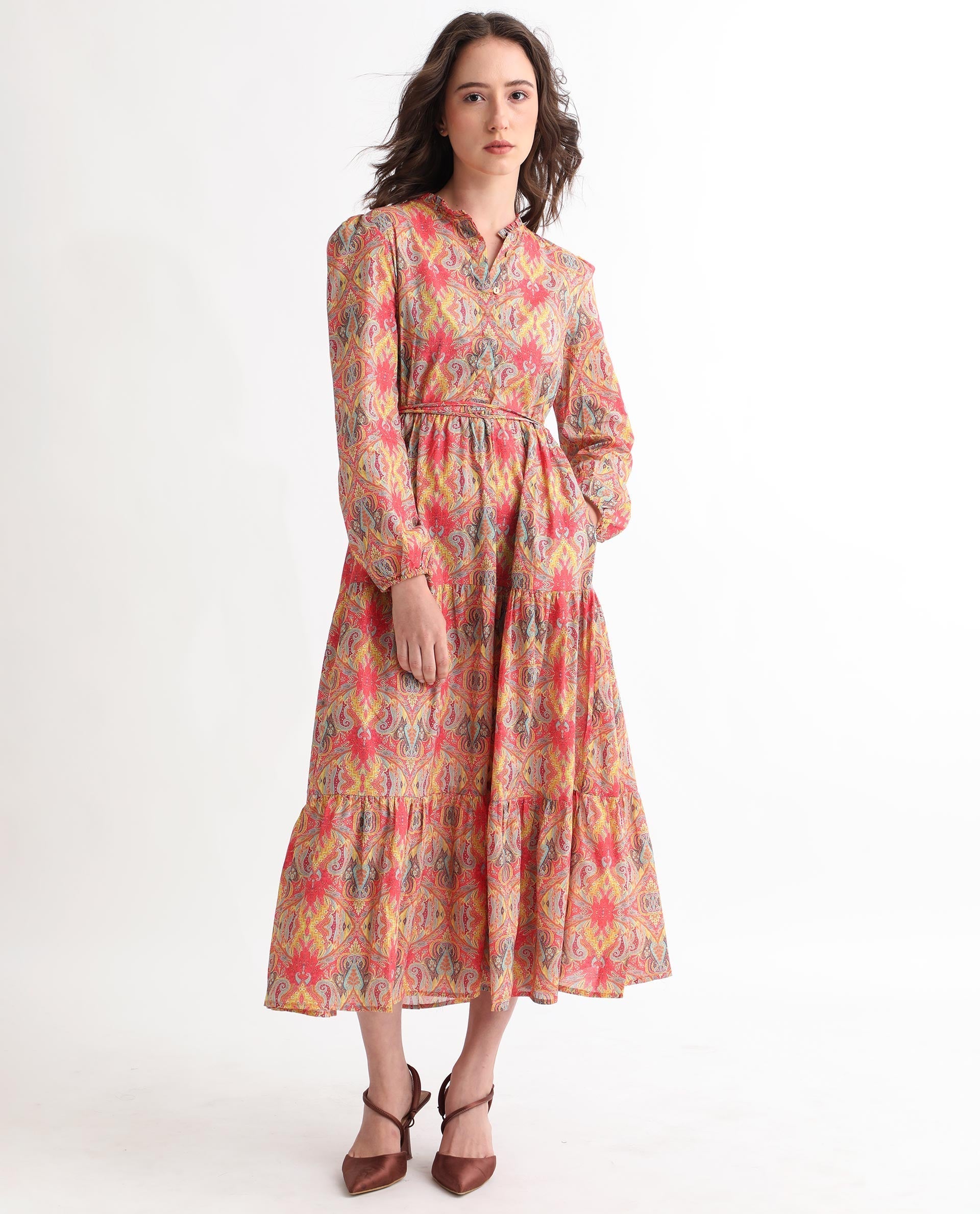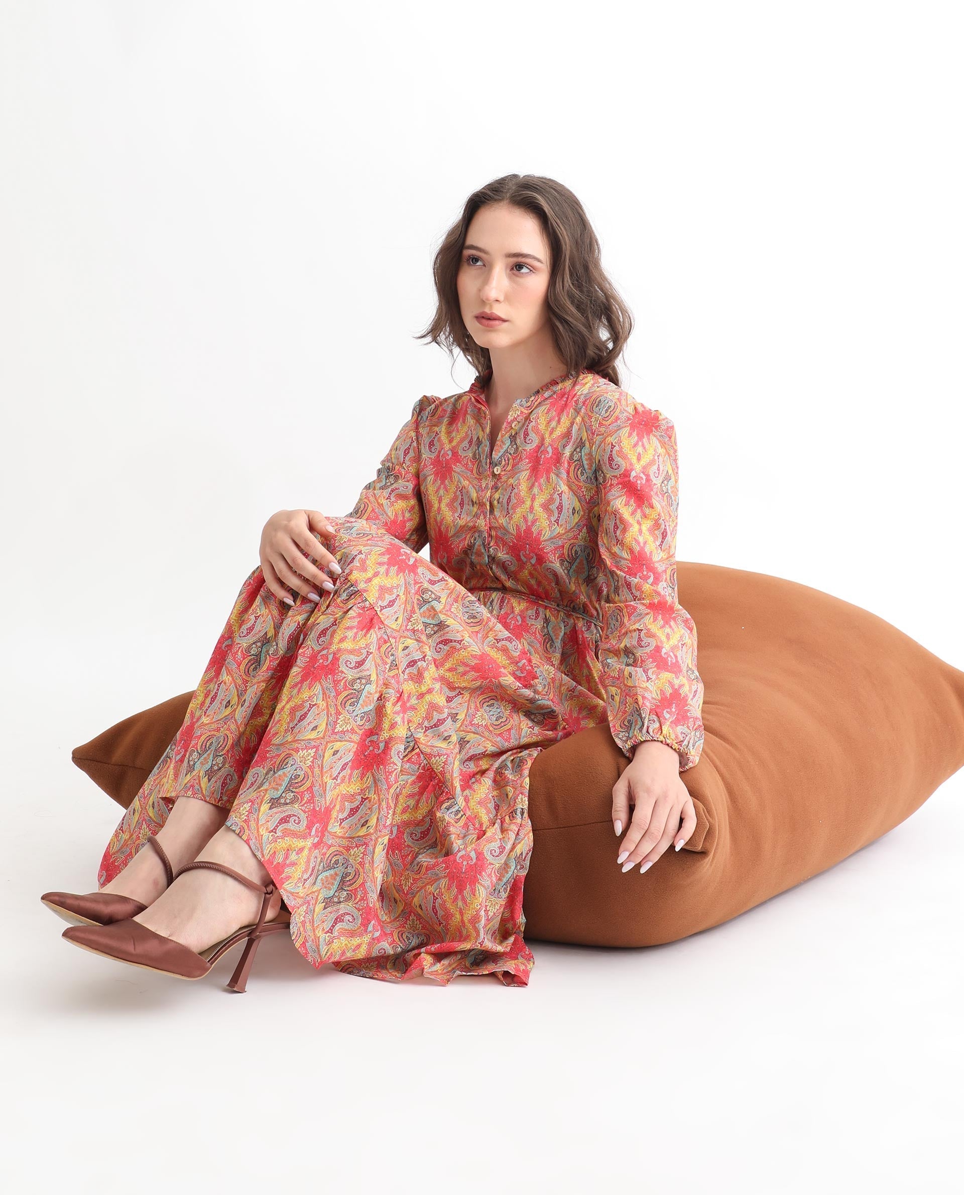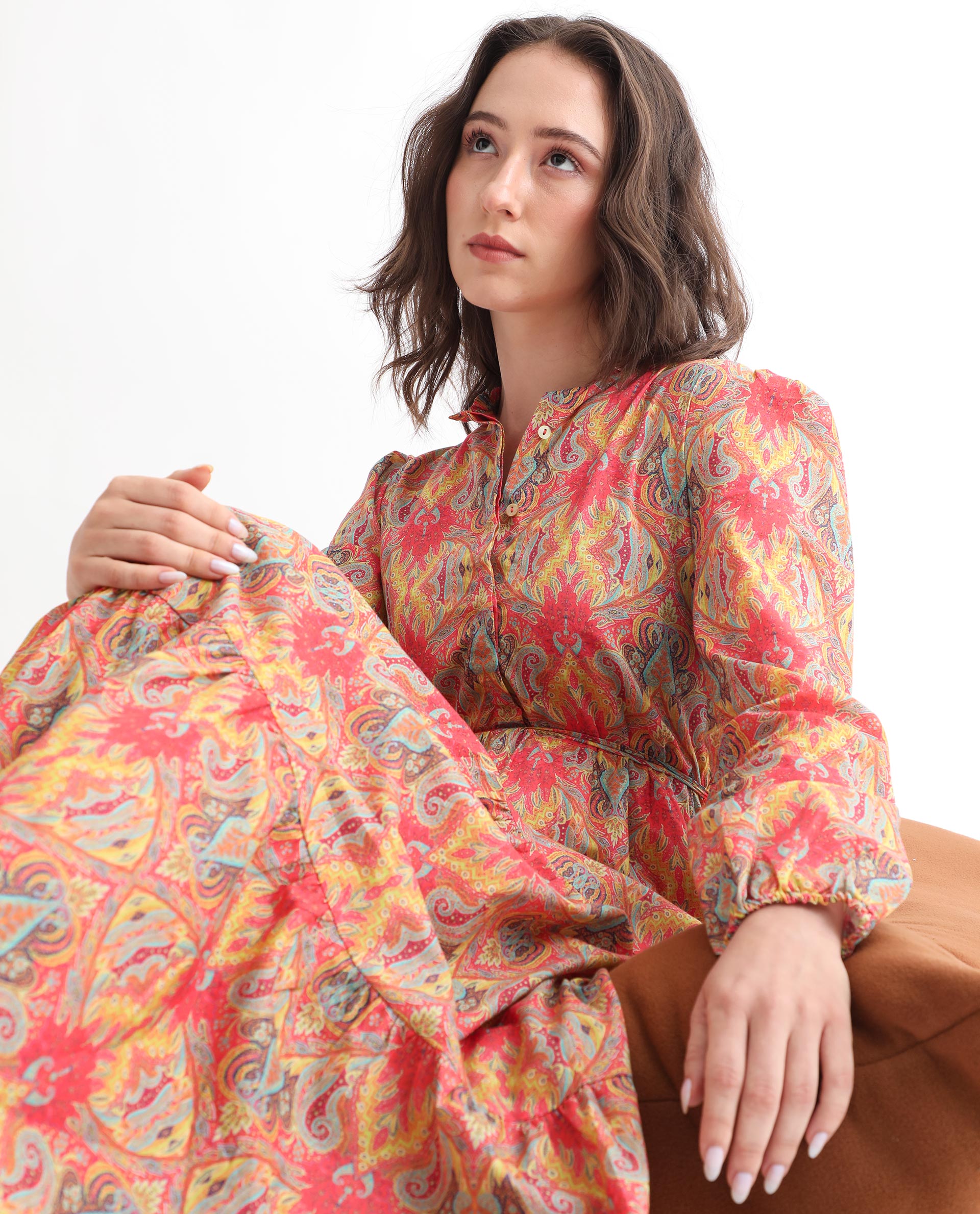 Rareism Women Taylor Multi Cotton Fabric Full Sleeves Button Closure Mandarin Collar Fit And Flare Abstract Print Knee Length Dress
