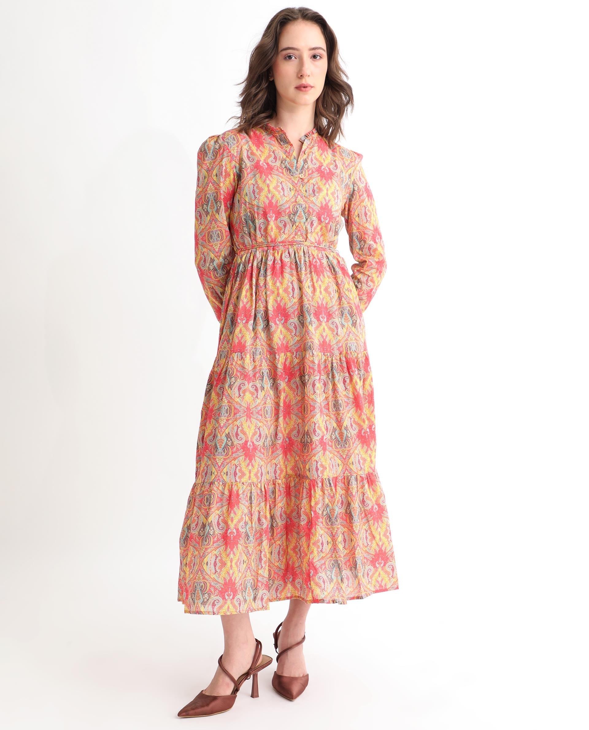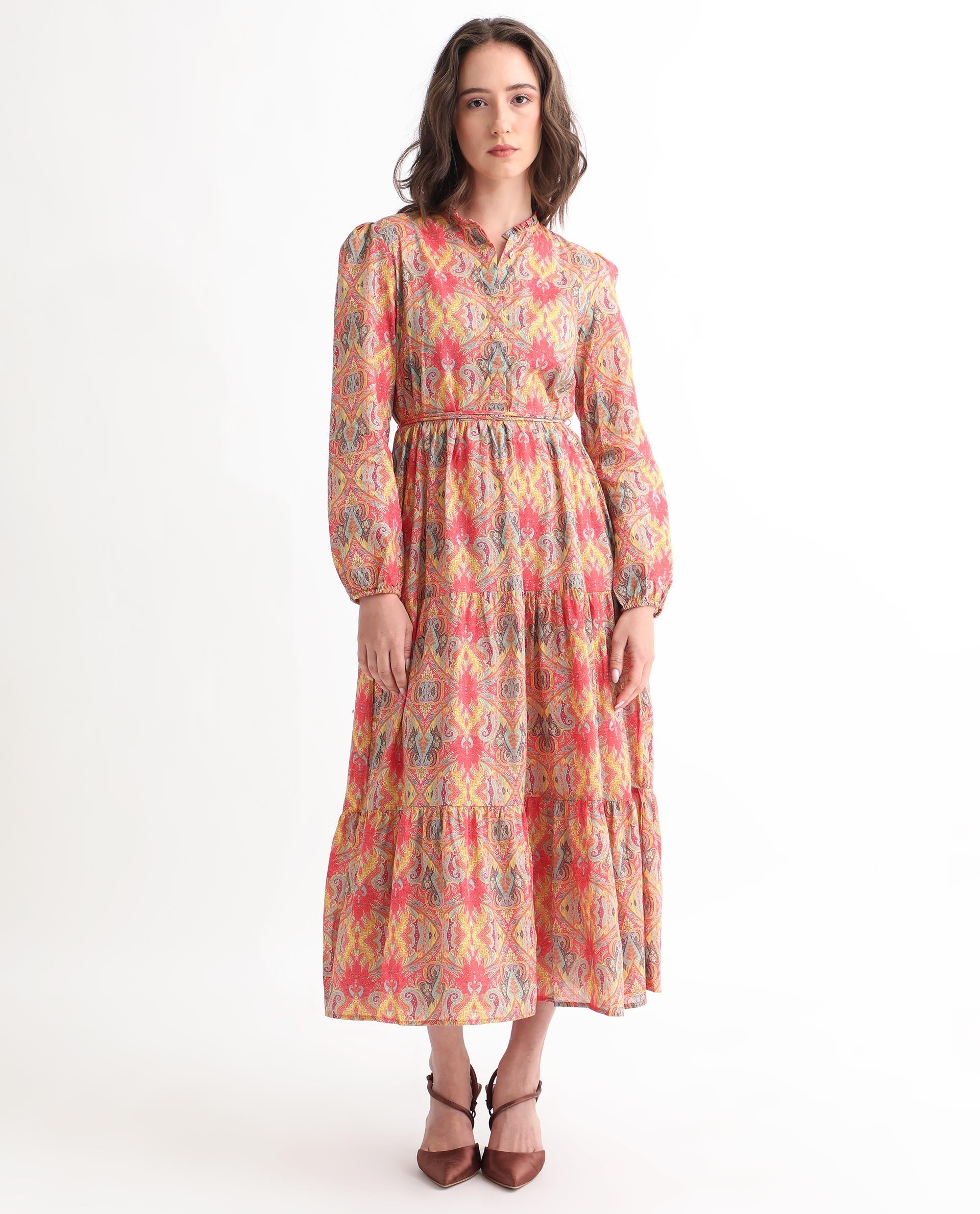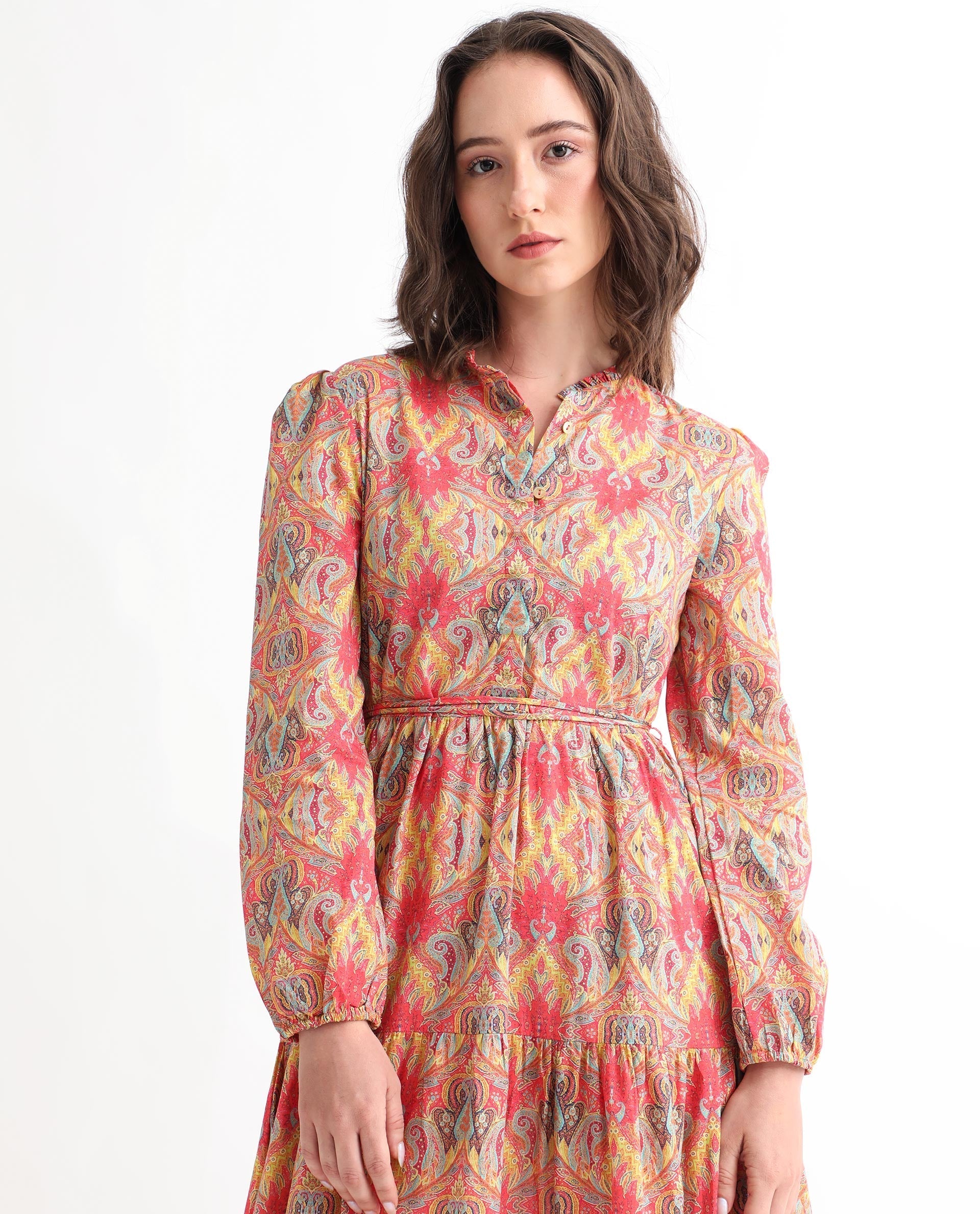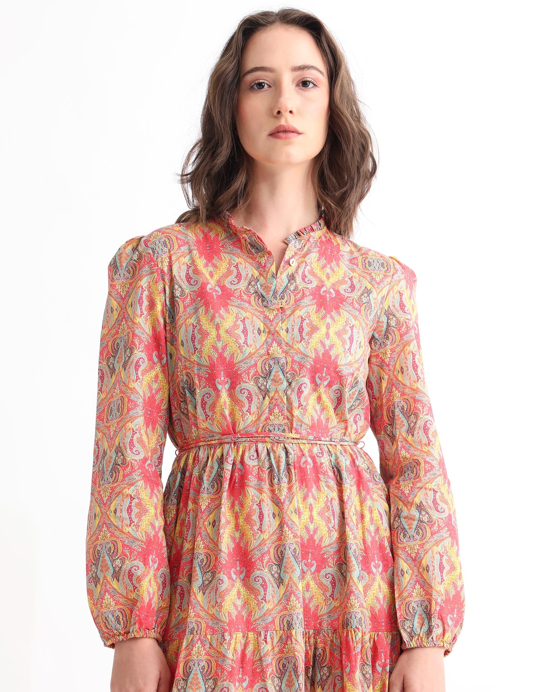 Rareism Women Taylor Multi Cotton Fabric Full Sleeves Button Closure Mandarin Collar Fit And Flare Abstract Print Knee Length Dress