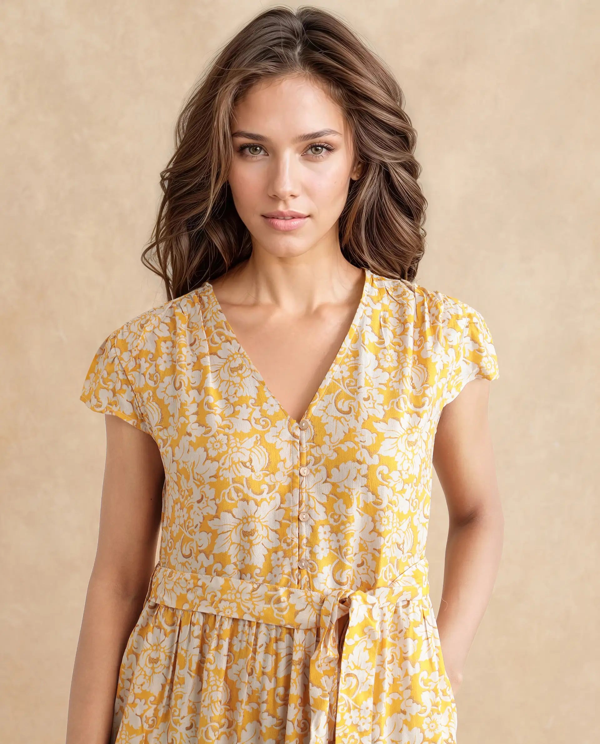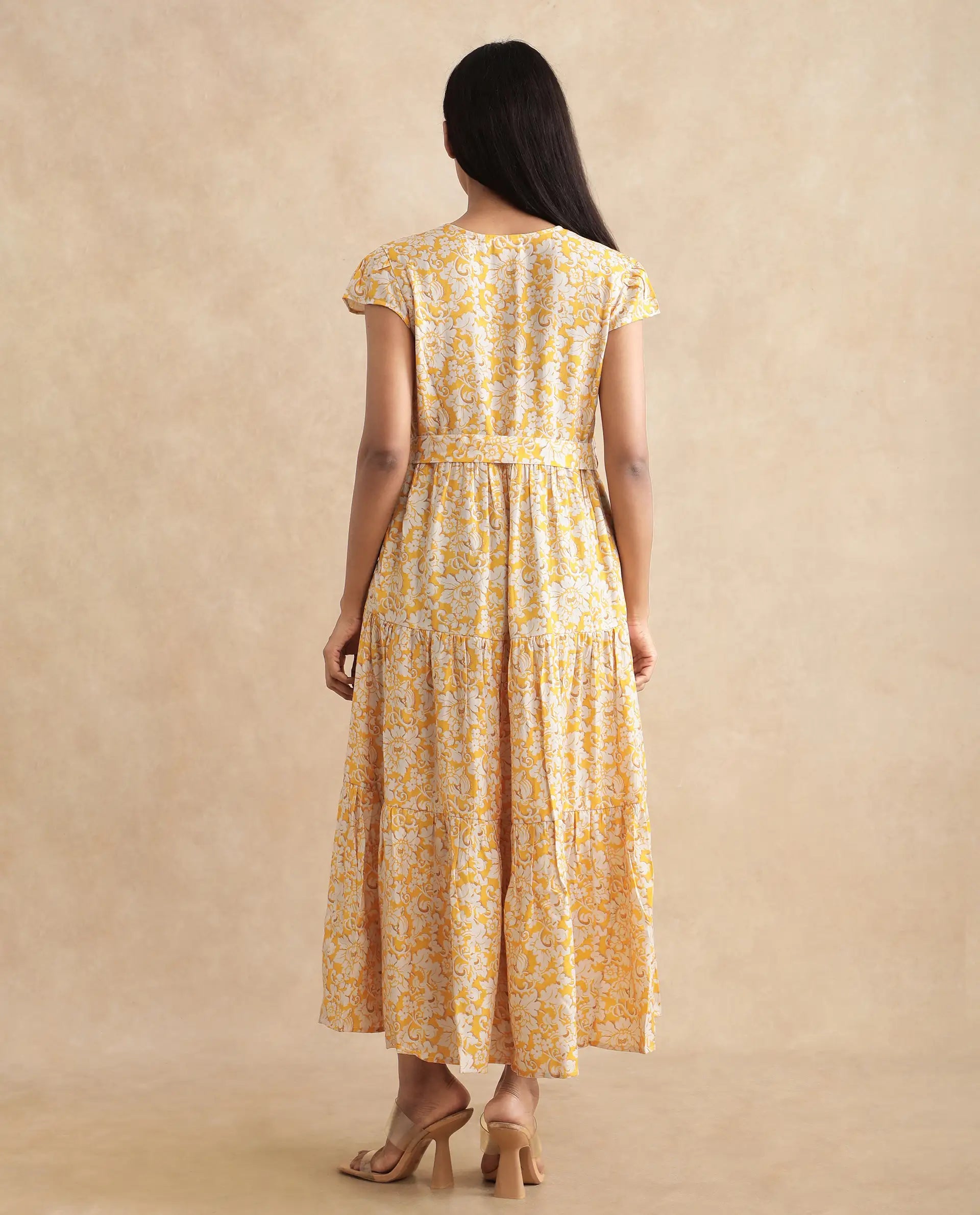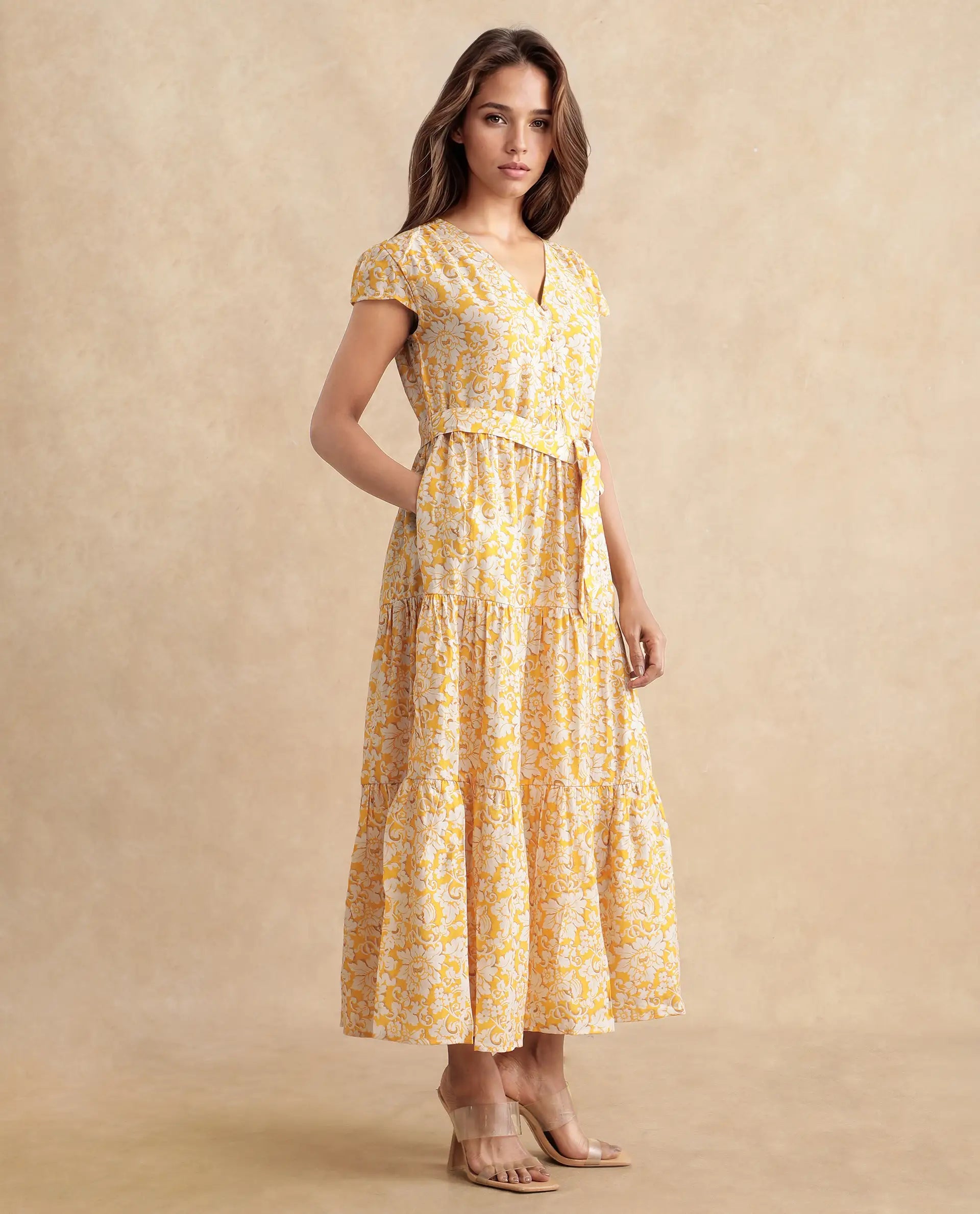 Rareism Women Tenna Yellow Cap Sleeves V-Neck Button Closure Fit And Flare Midi Floral Print Dress