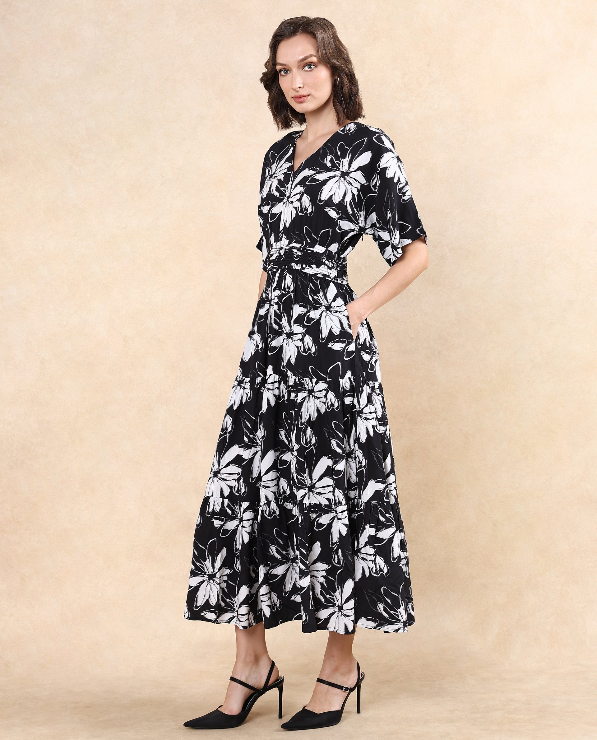 Rareism Women Tuzio Black Extended Sleeves V-Neck Zipper Closure Fit And Flare Floral Print Maxi Dress