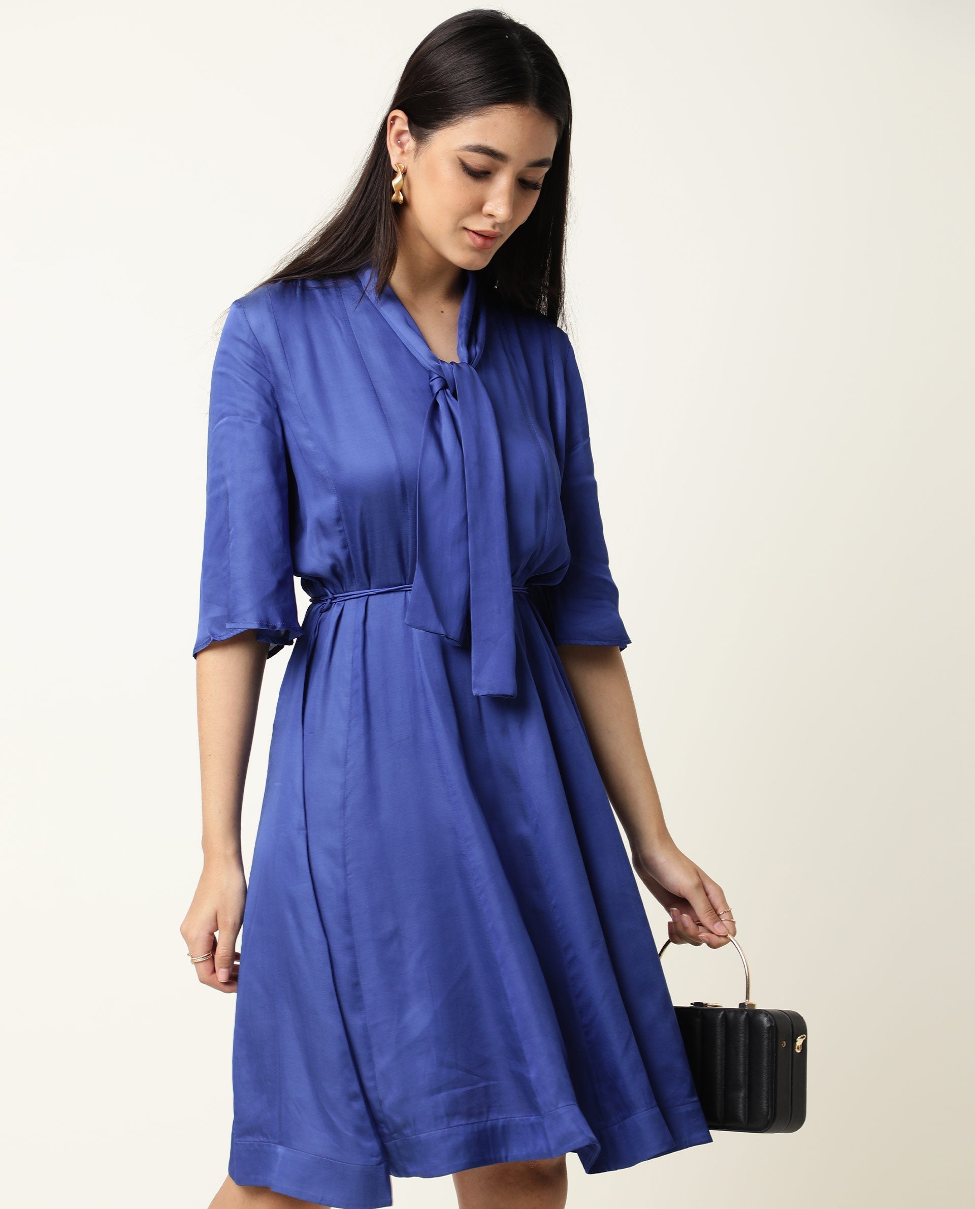 Rareism Women Yeme Blue V Neck With Tie Up Flared Sleeves Mini Dress