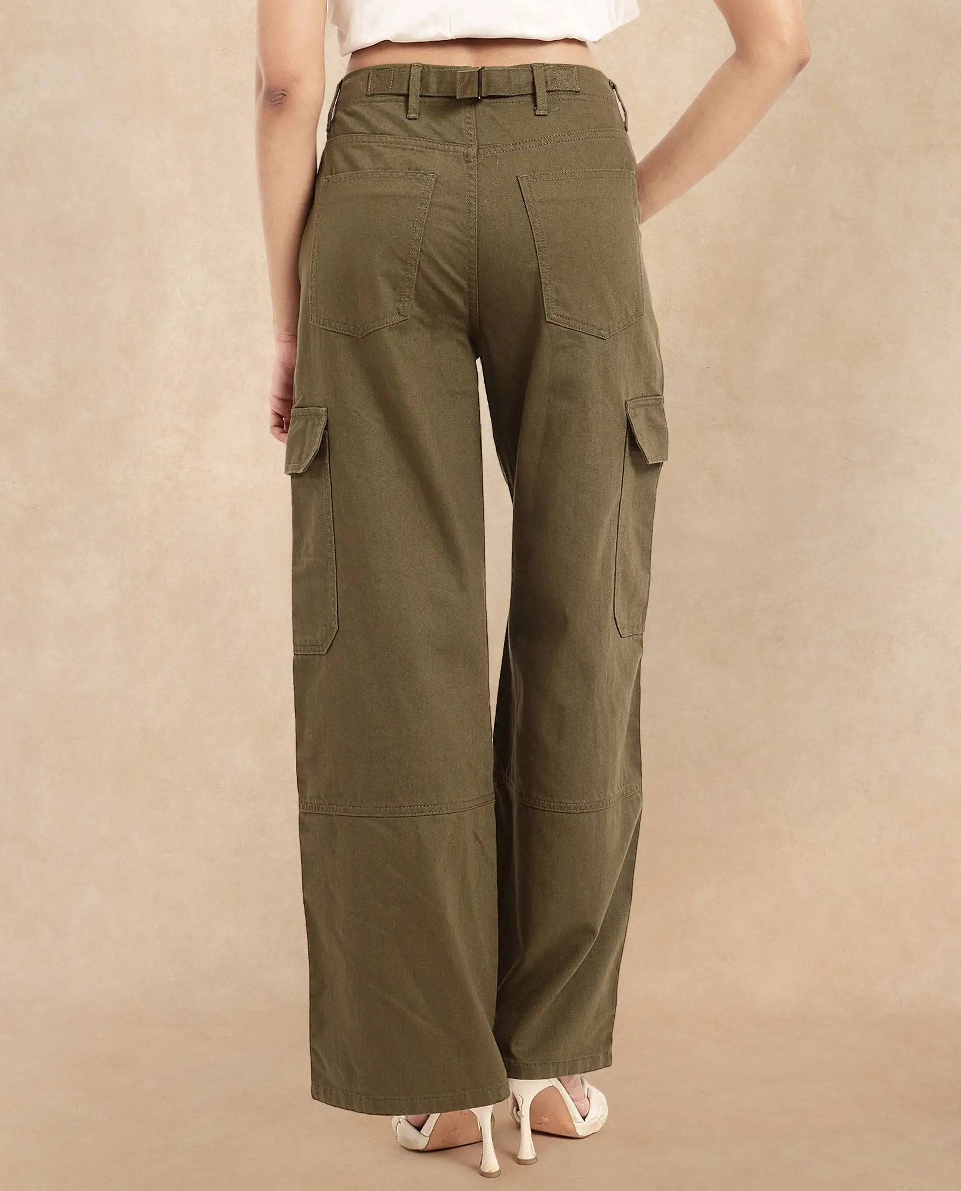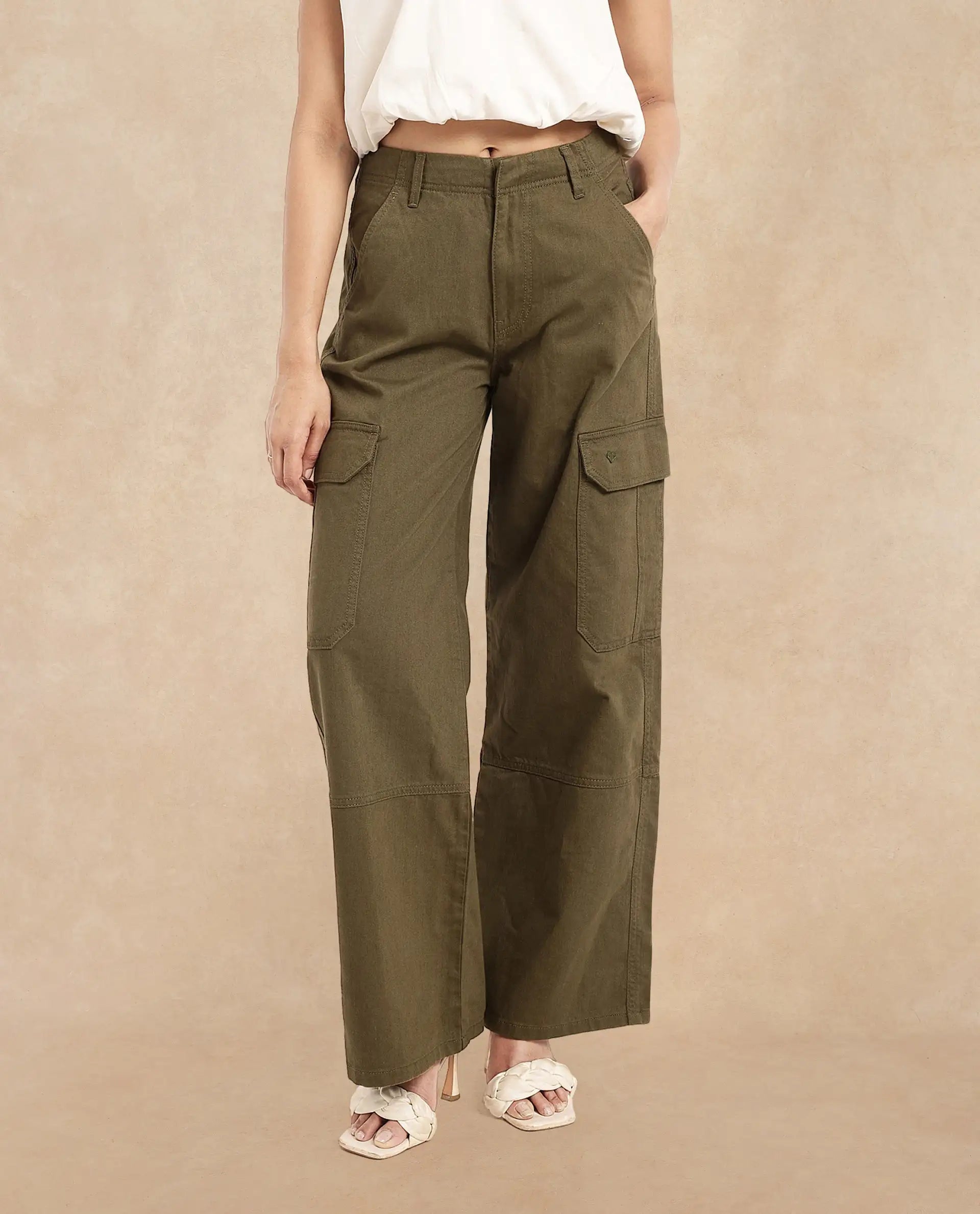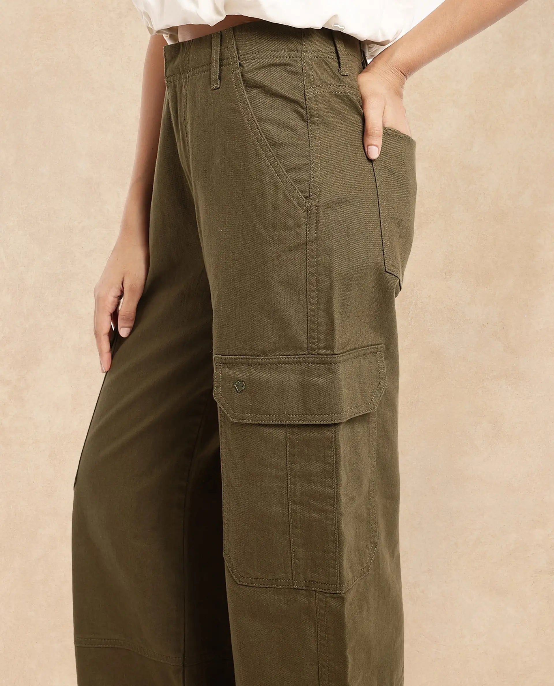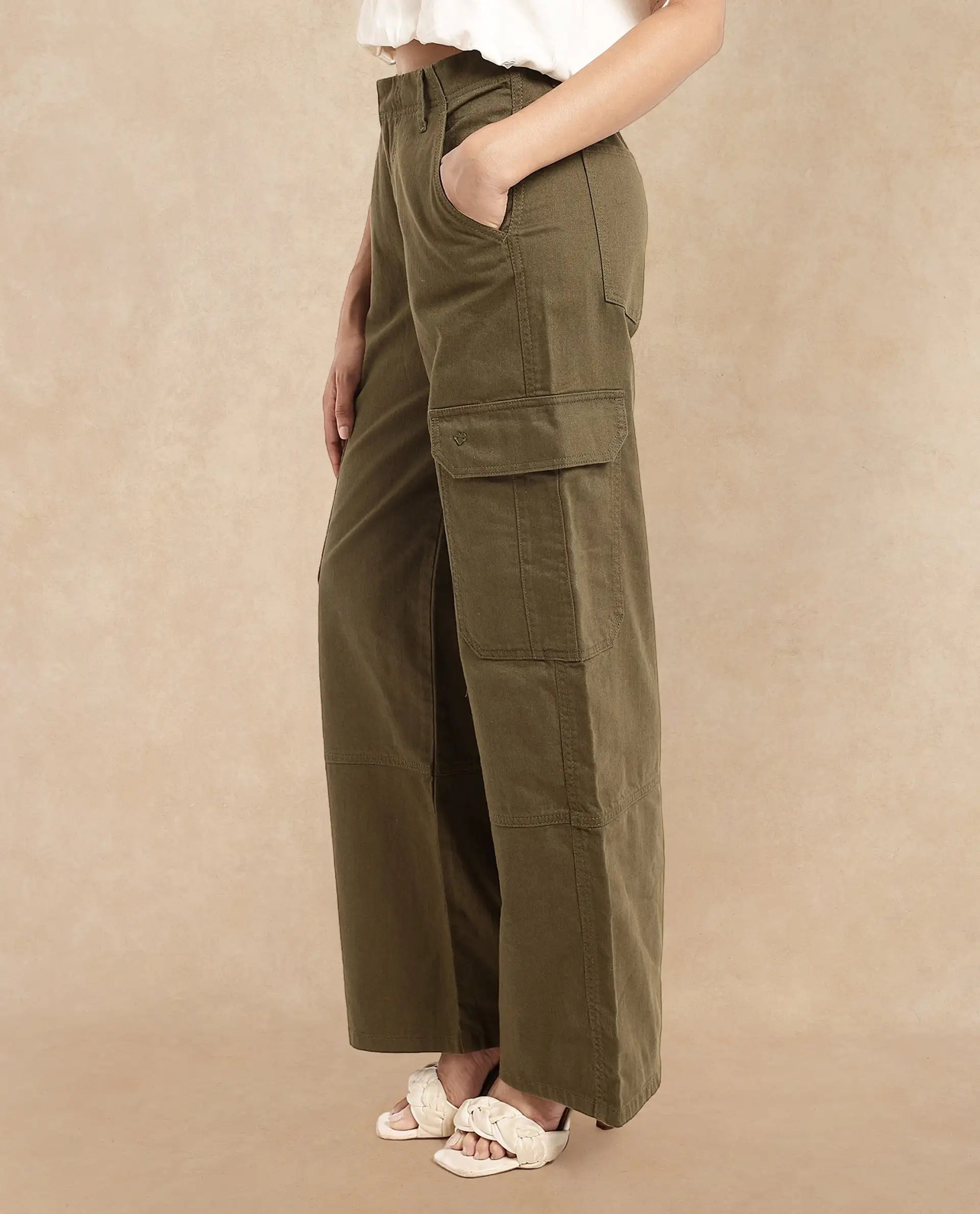 Rareism Women Itsiz-SC Olive Wide Wide Ankle Length Broad Stripes Cargo Trouser
