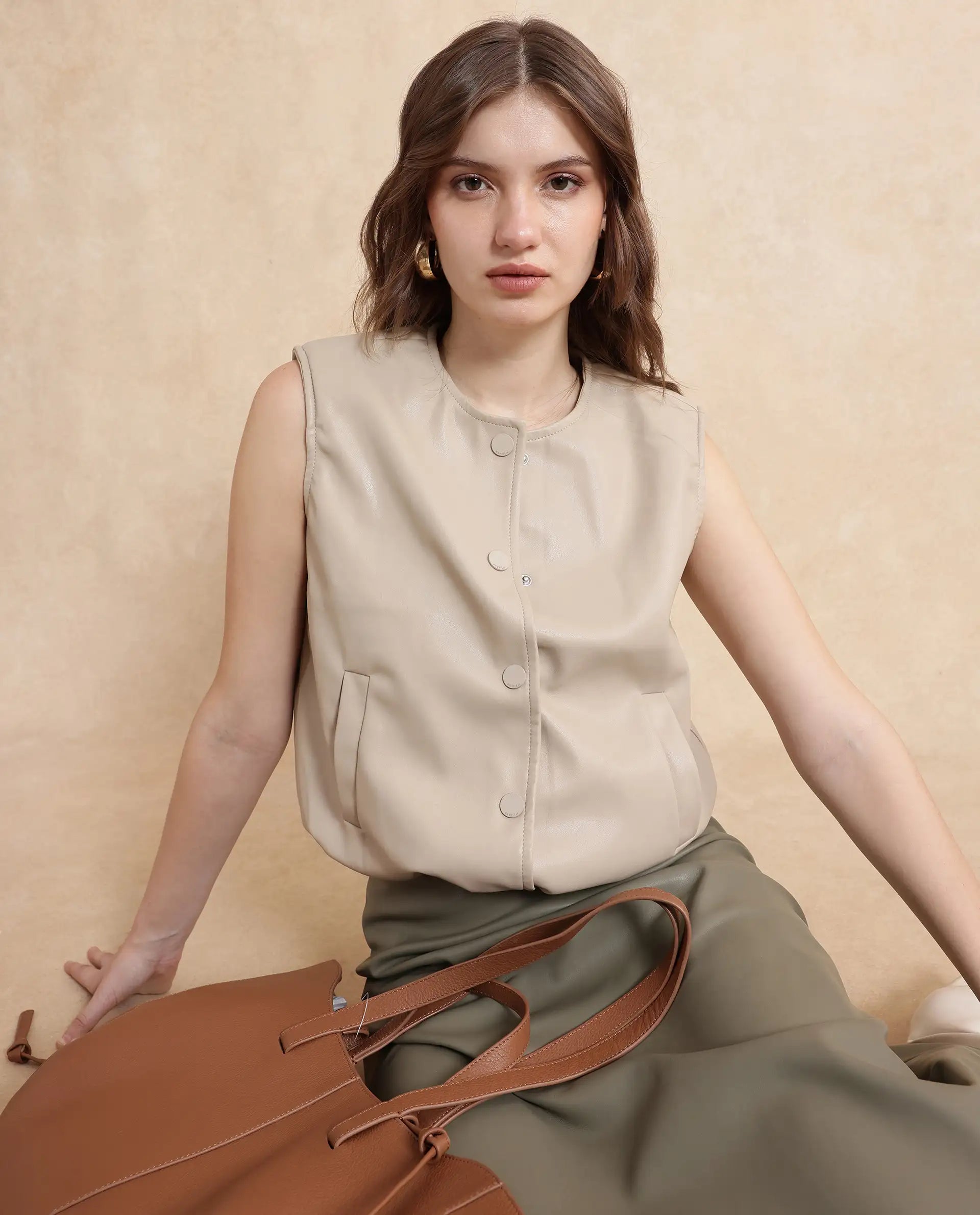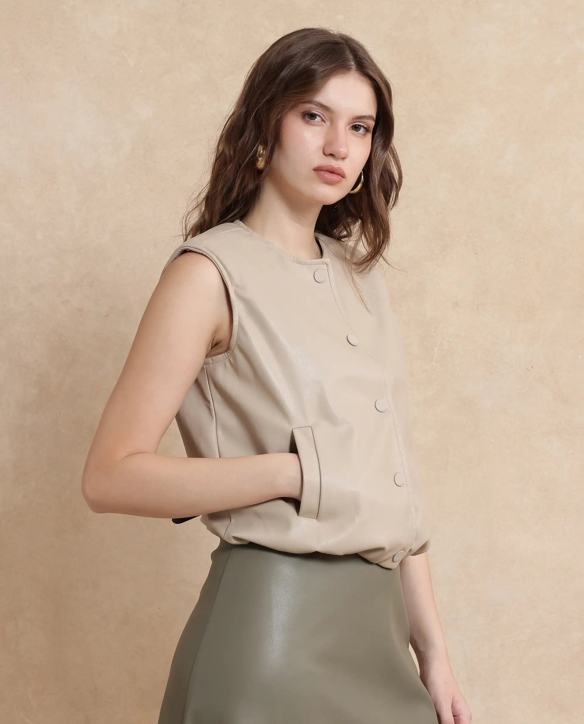 PU SLEEVELESS JACKET WITH DRAWSTRING DETAIL