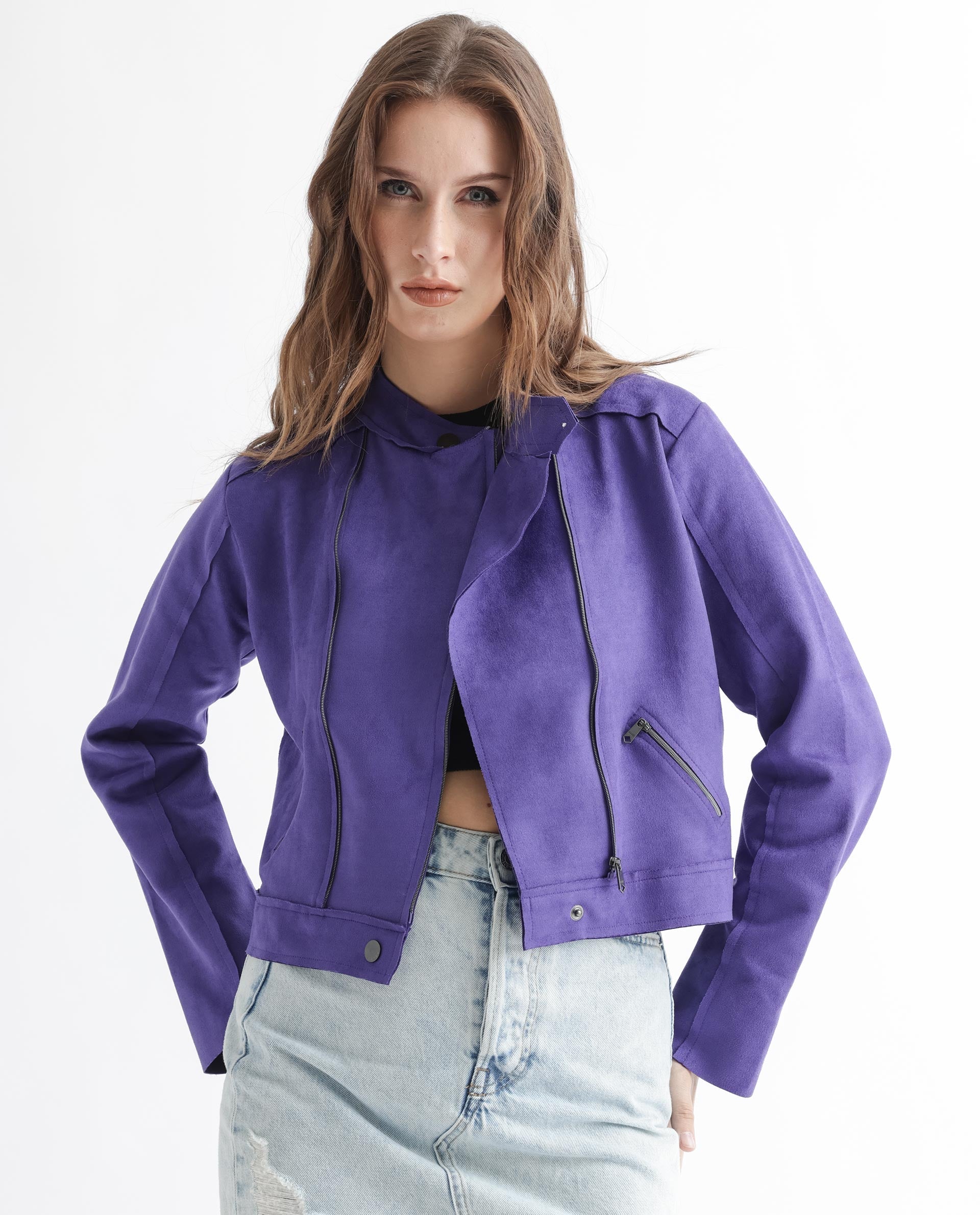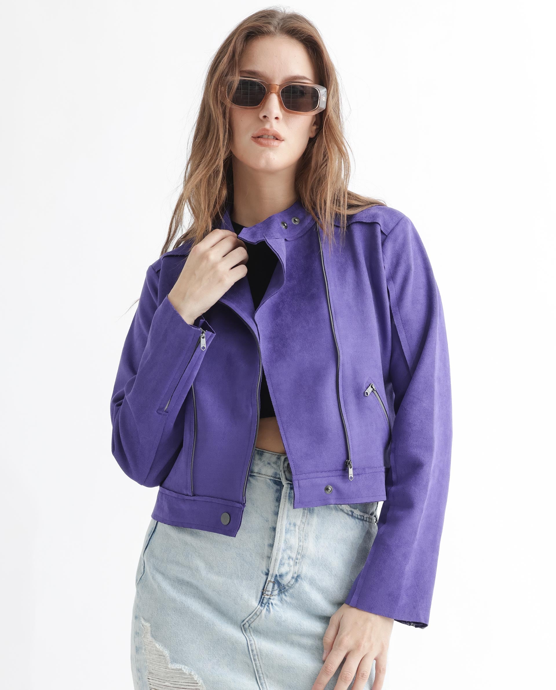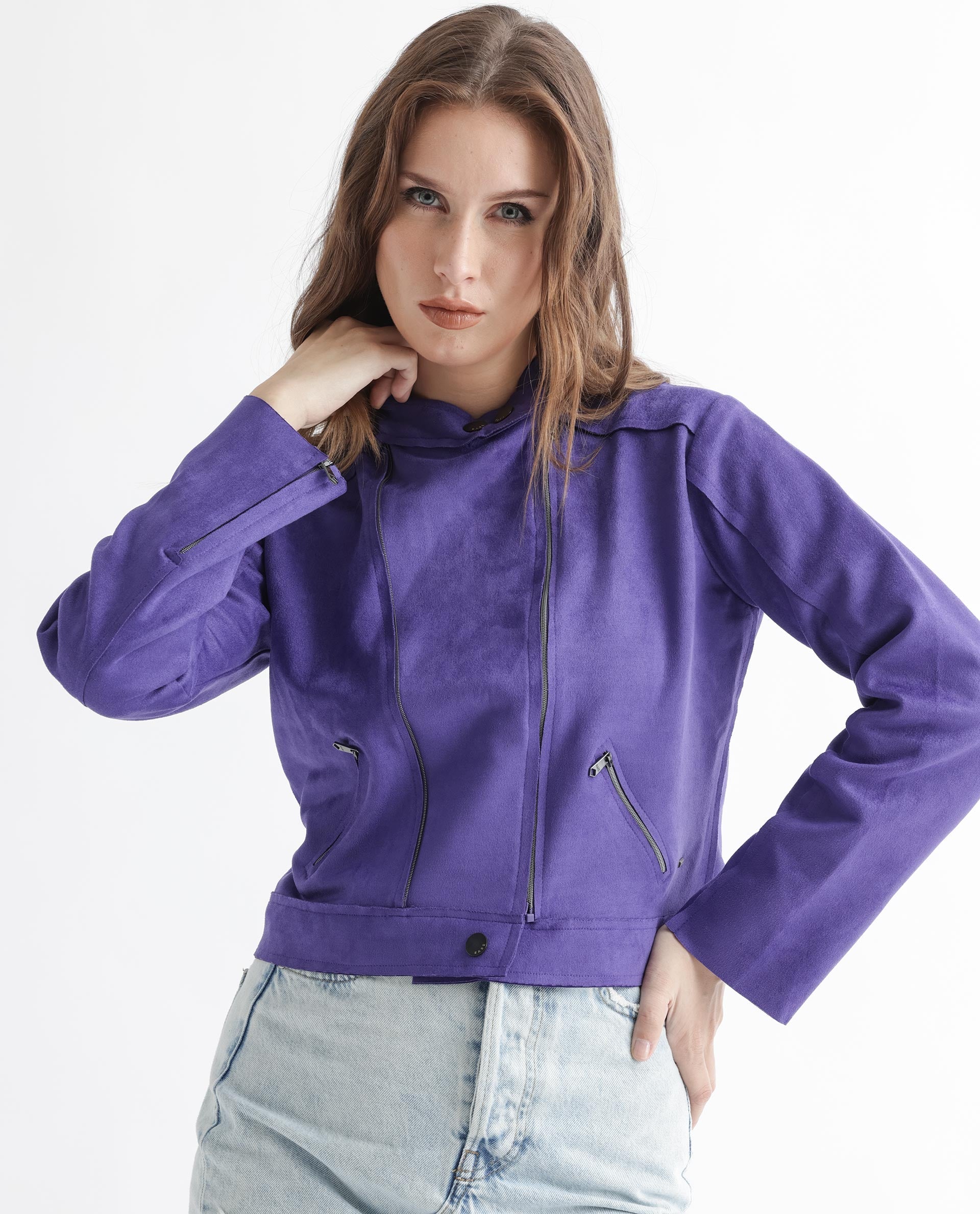 Rareism Women Everlee Purple Polyester Fabric Full Sleeves Solid Mandarin Collar Jacket