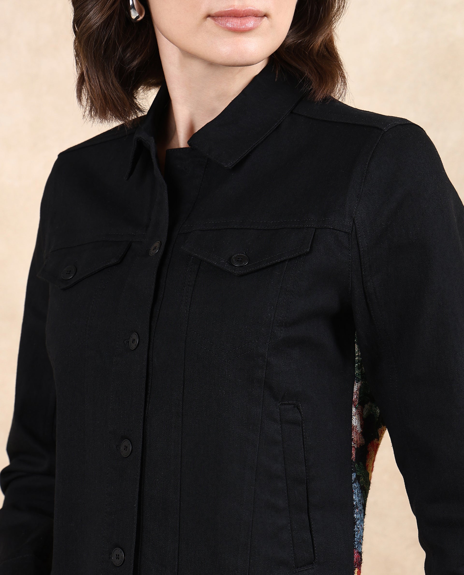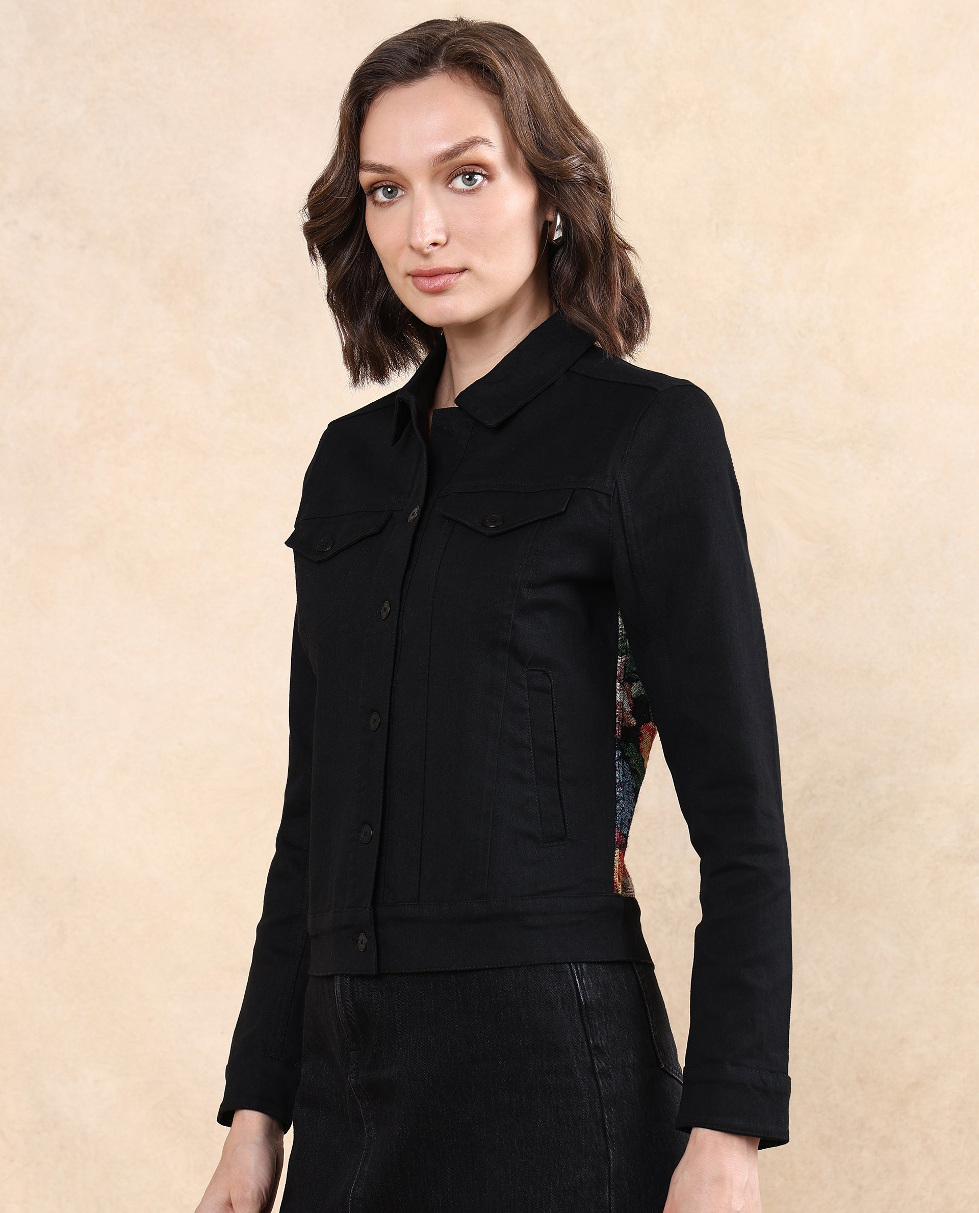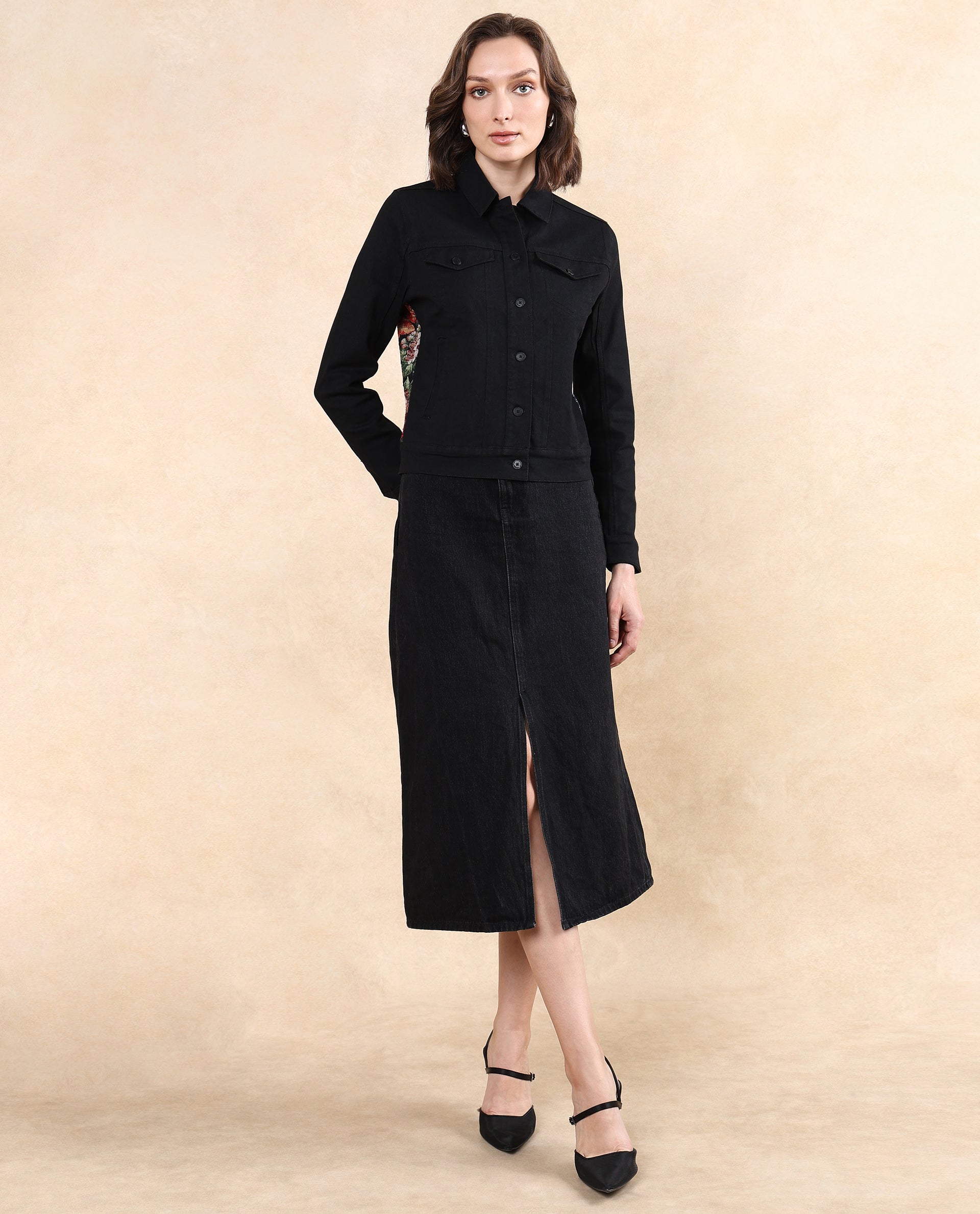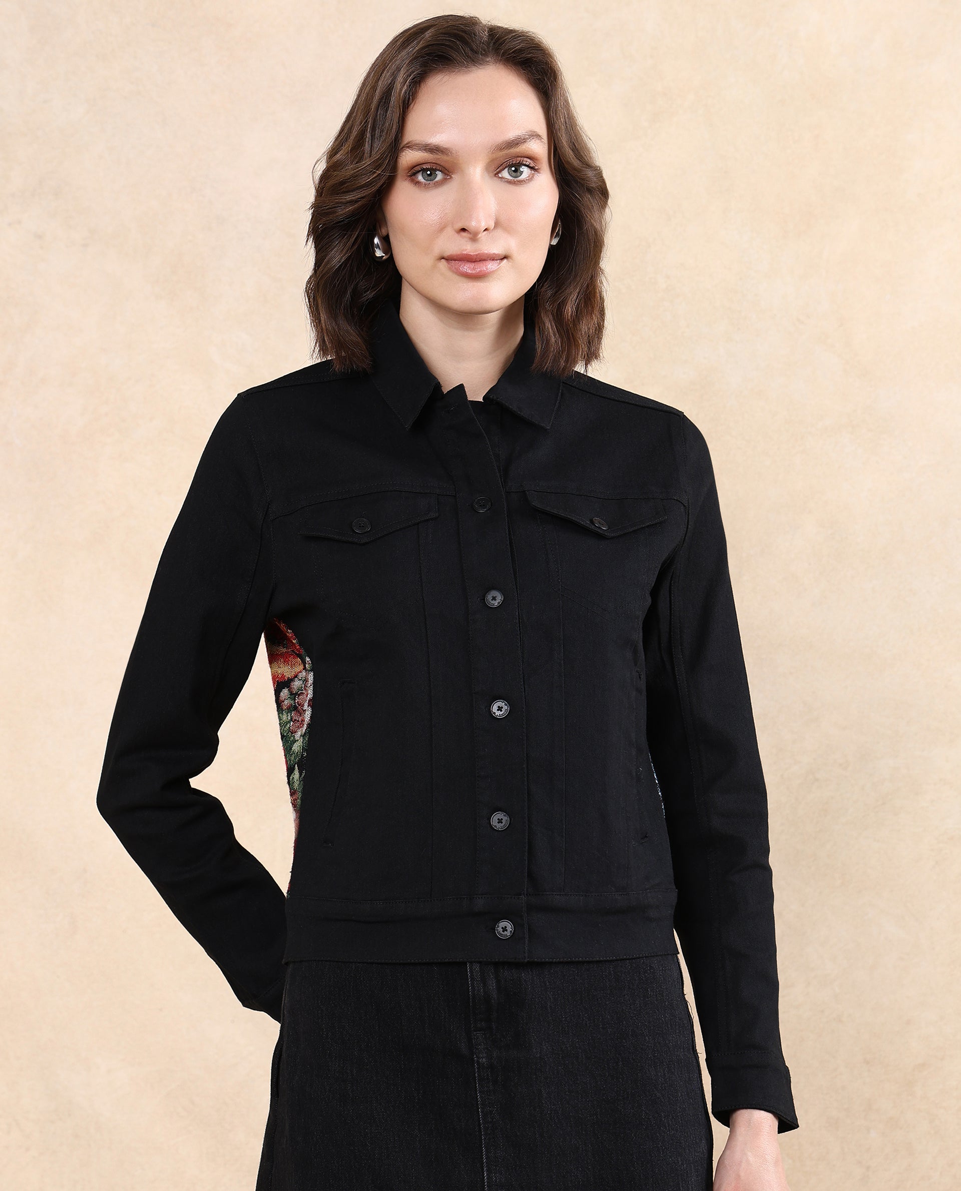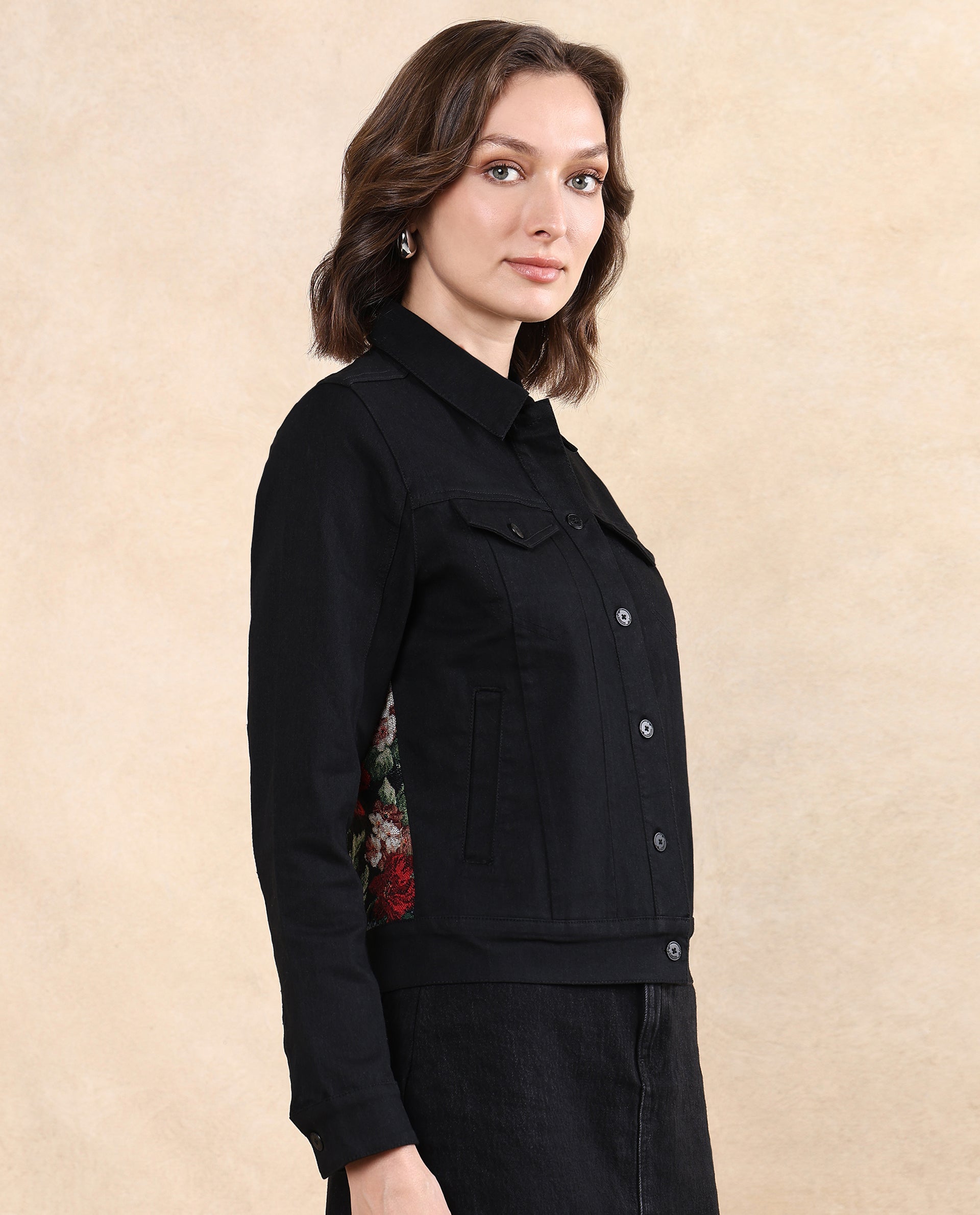 Rareism Women Floria Black Cuffed Sleeve Collared Neck Button Closure Regular Fit Plain Jacket