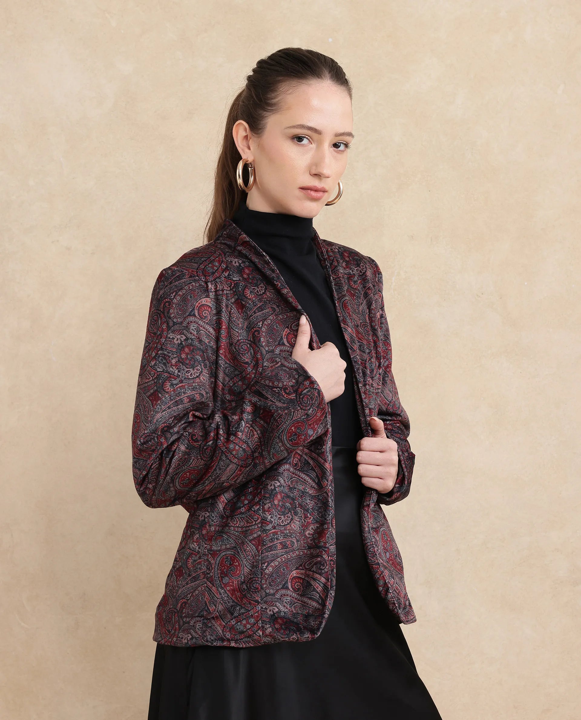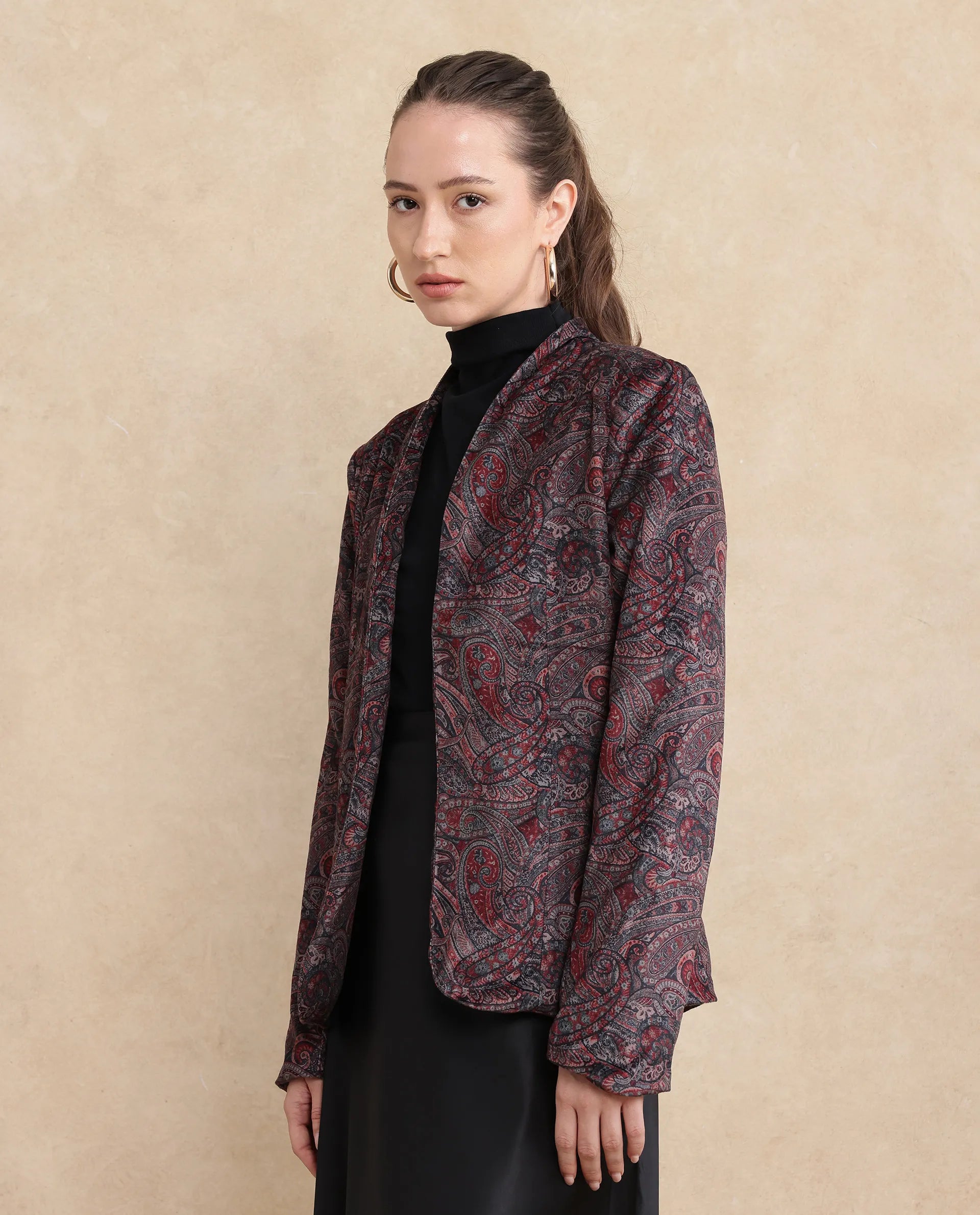 Rareism Women Resko Multi Velvet Regular Sleeves Collarless Paisley Print Jacket