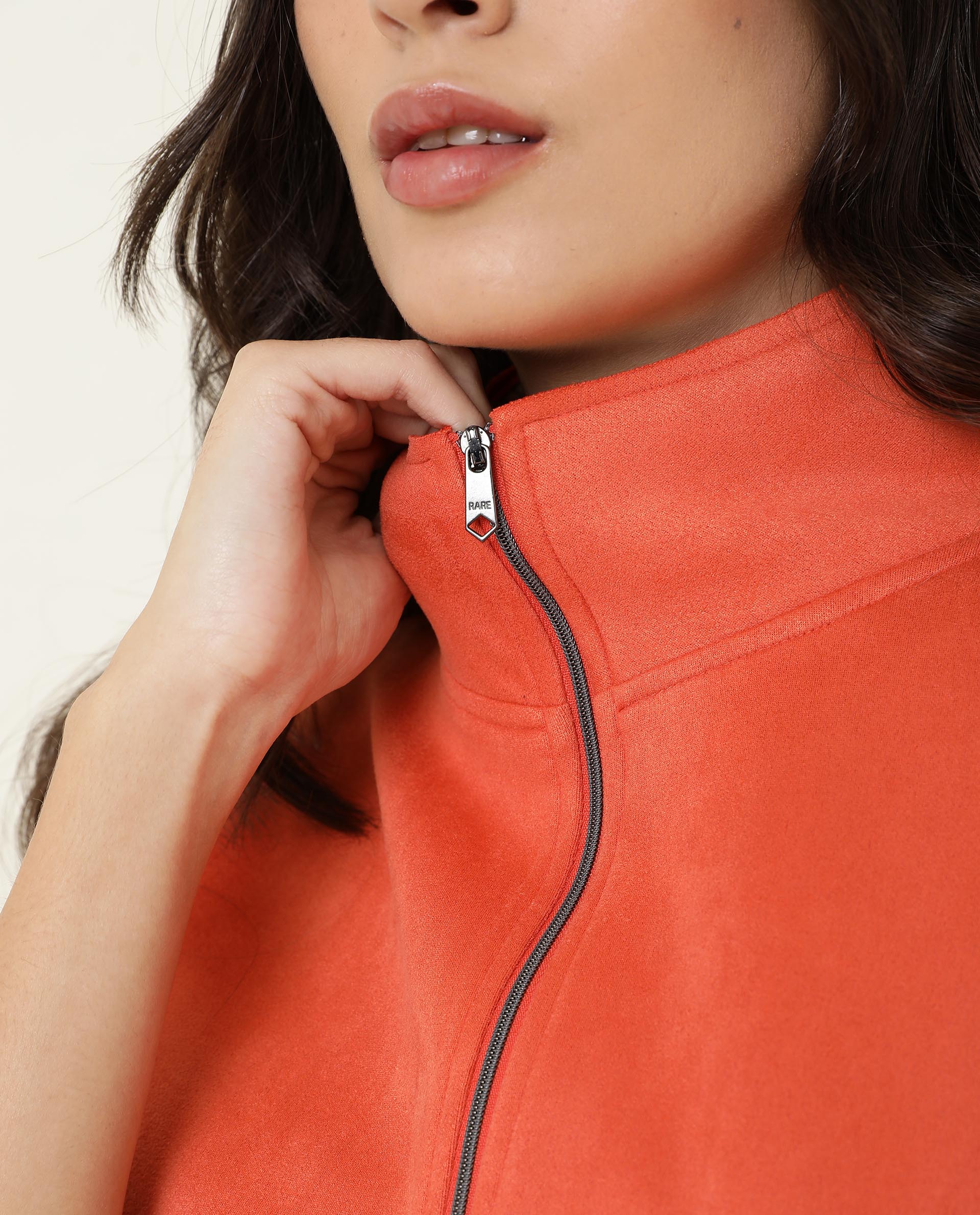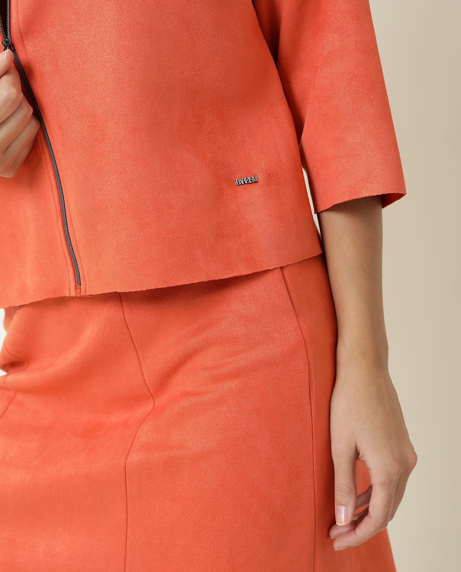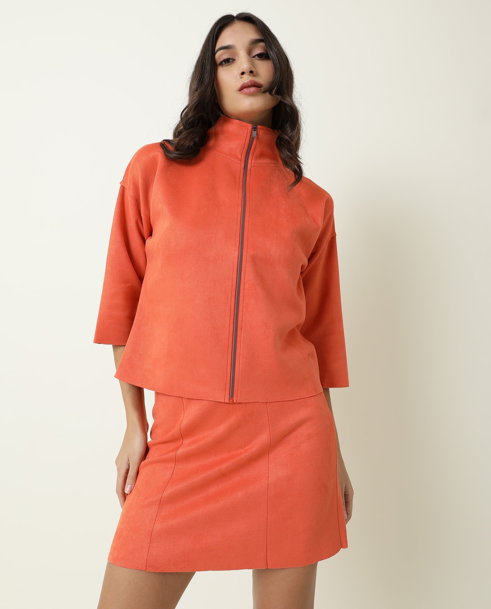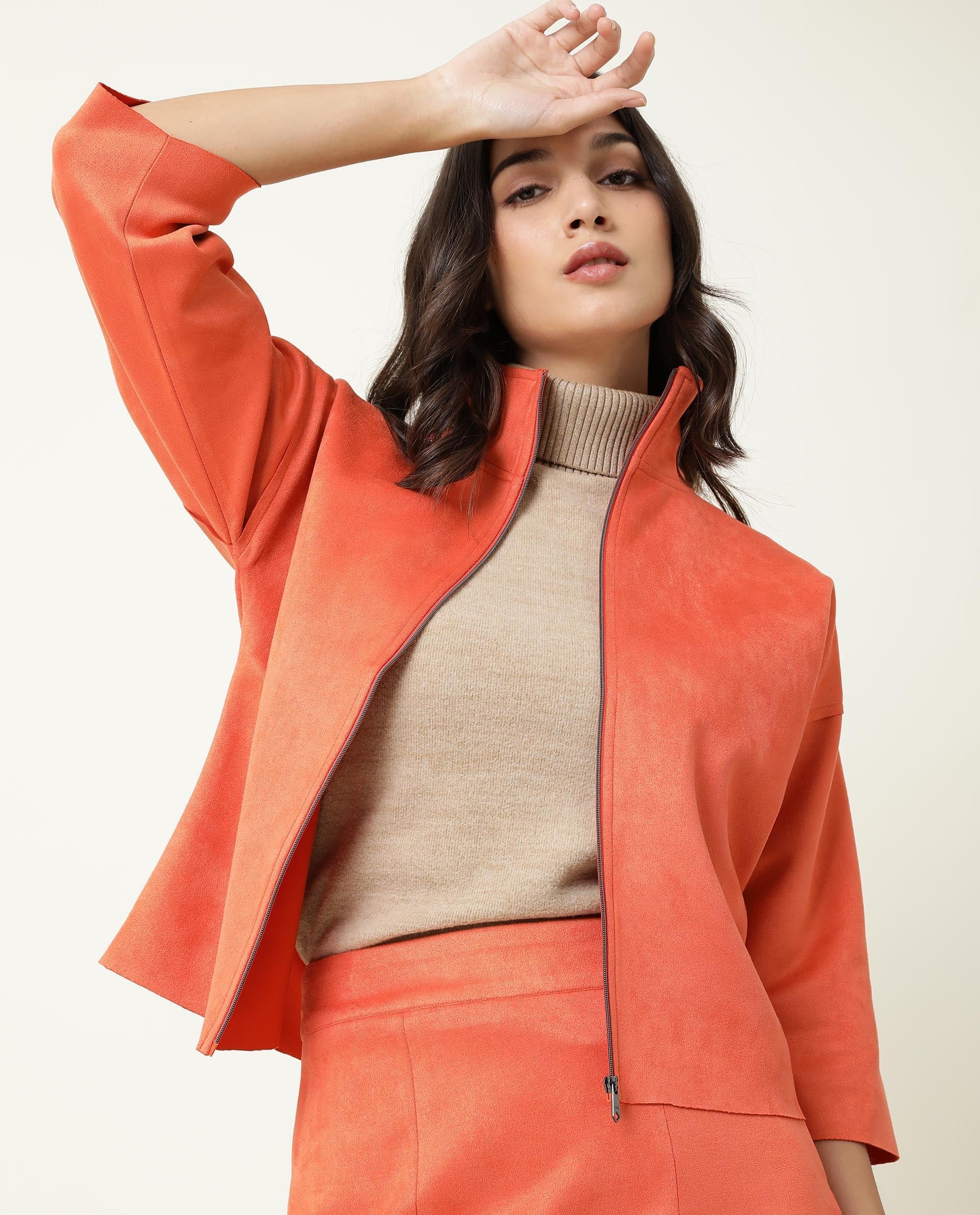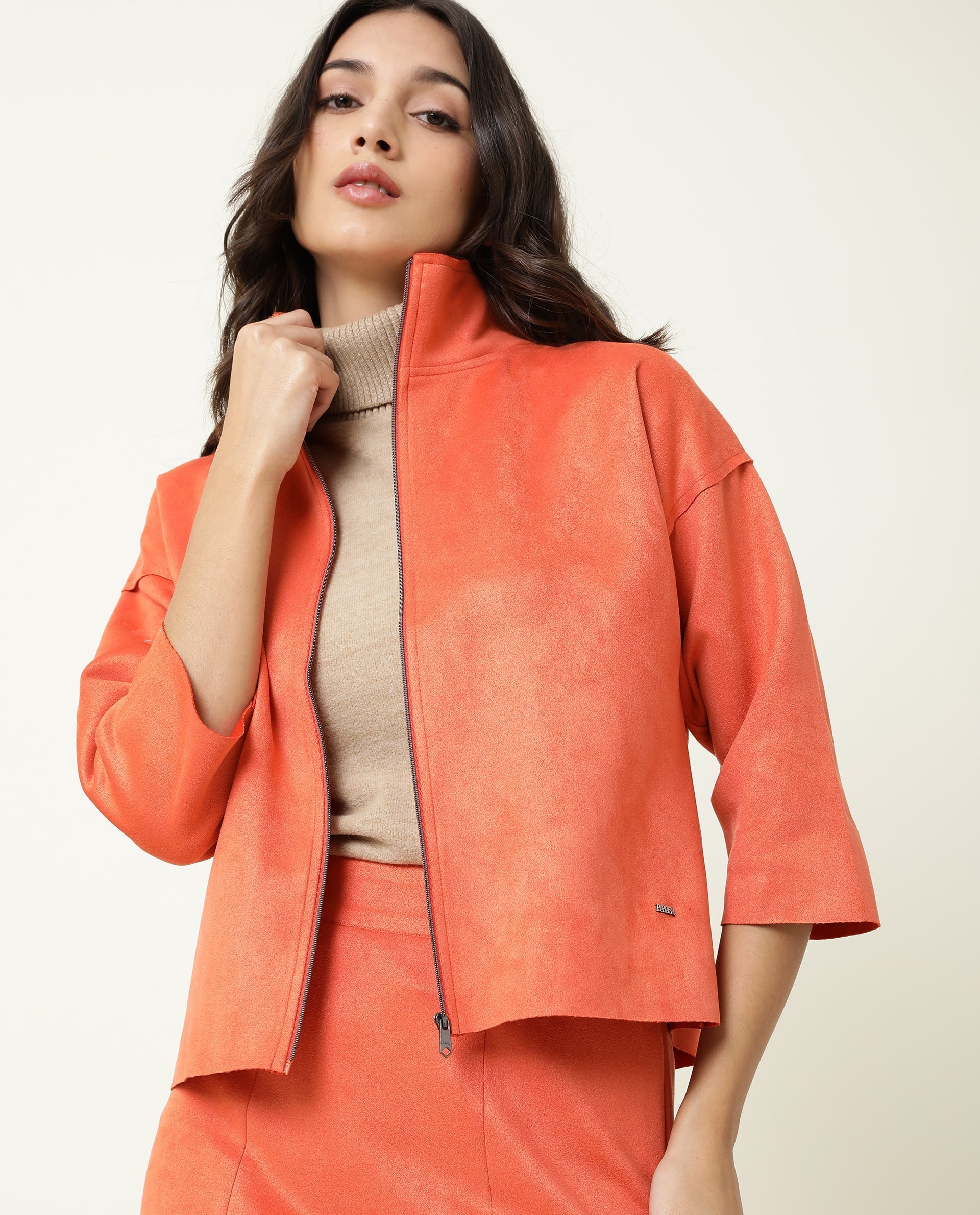 Rareism Women Vasu Orange Polyester Fabric 3/4Th Sleeves Solid High Neck Jacket