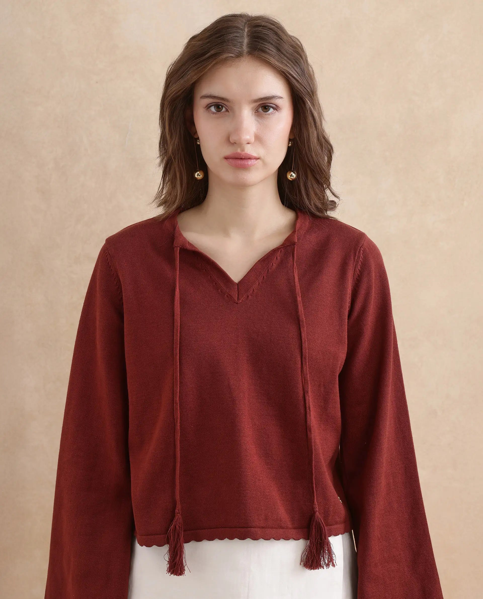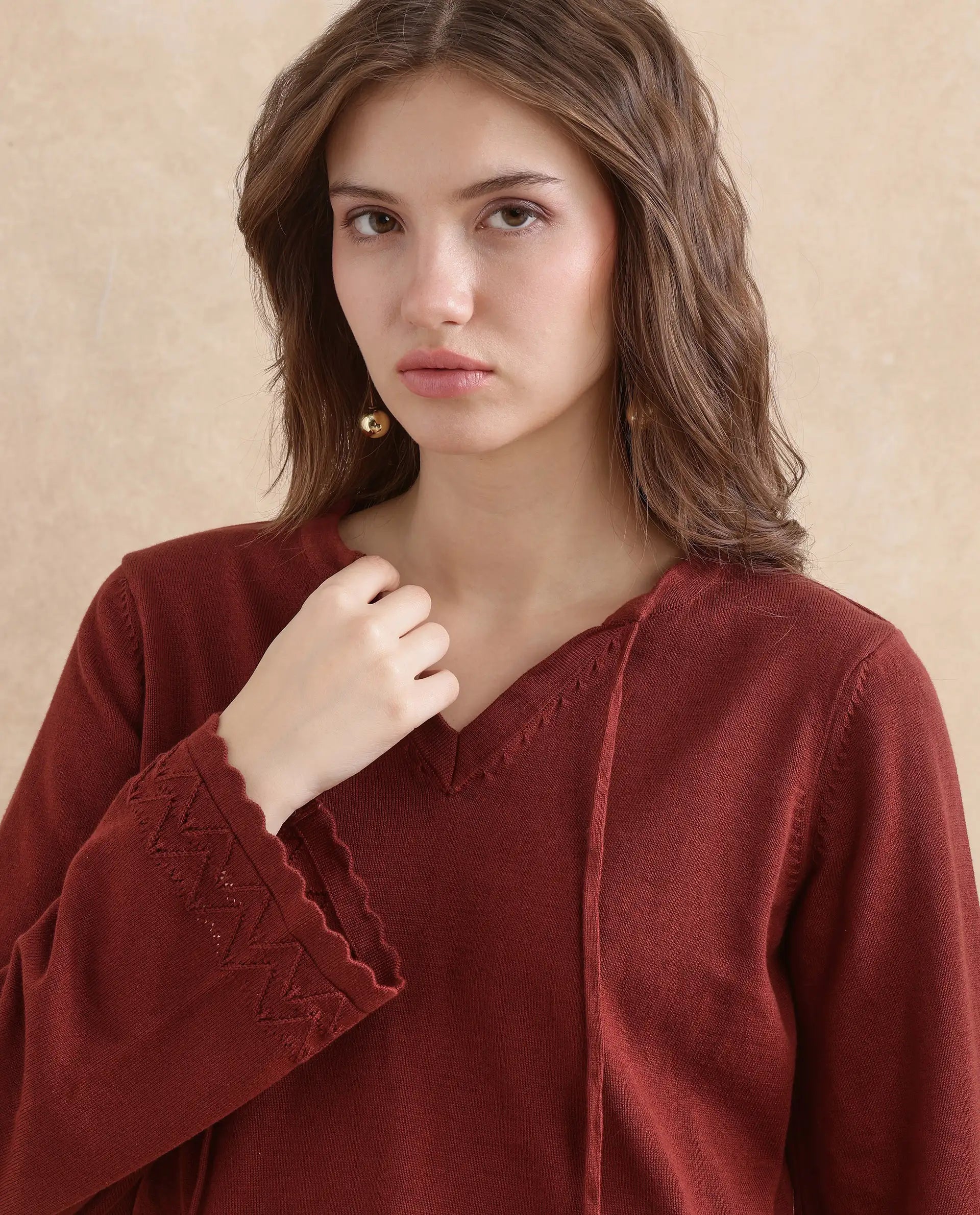Rareism Women Ronzmu Dark Brown Cotton Fabric Full Sleeve Relaxed Fit Top