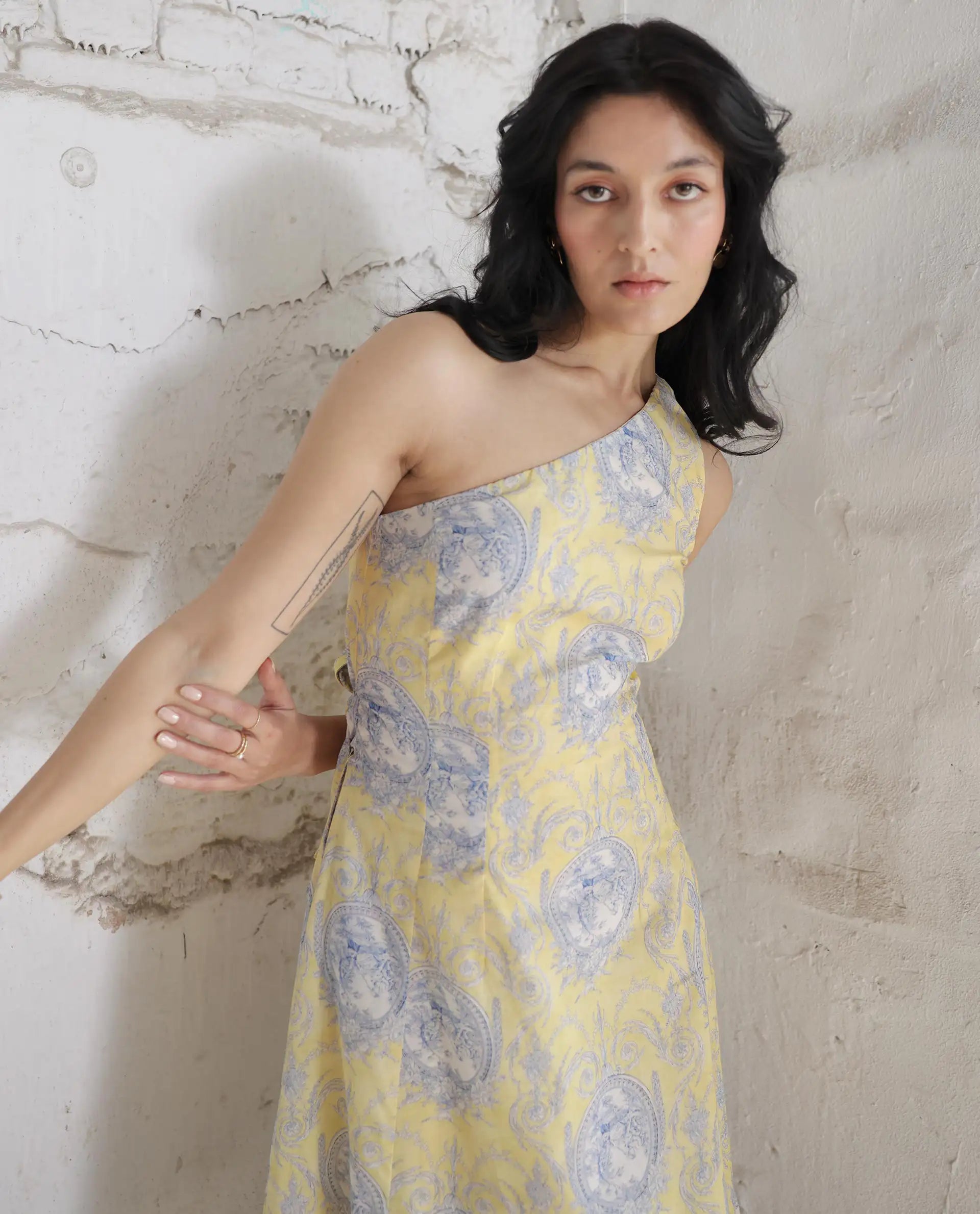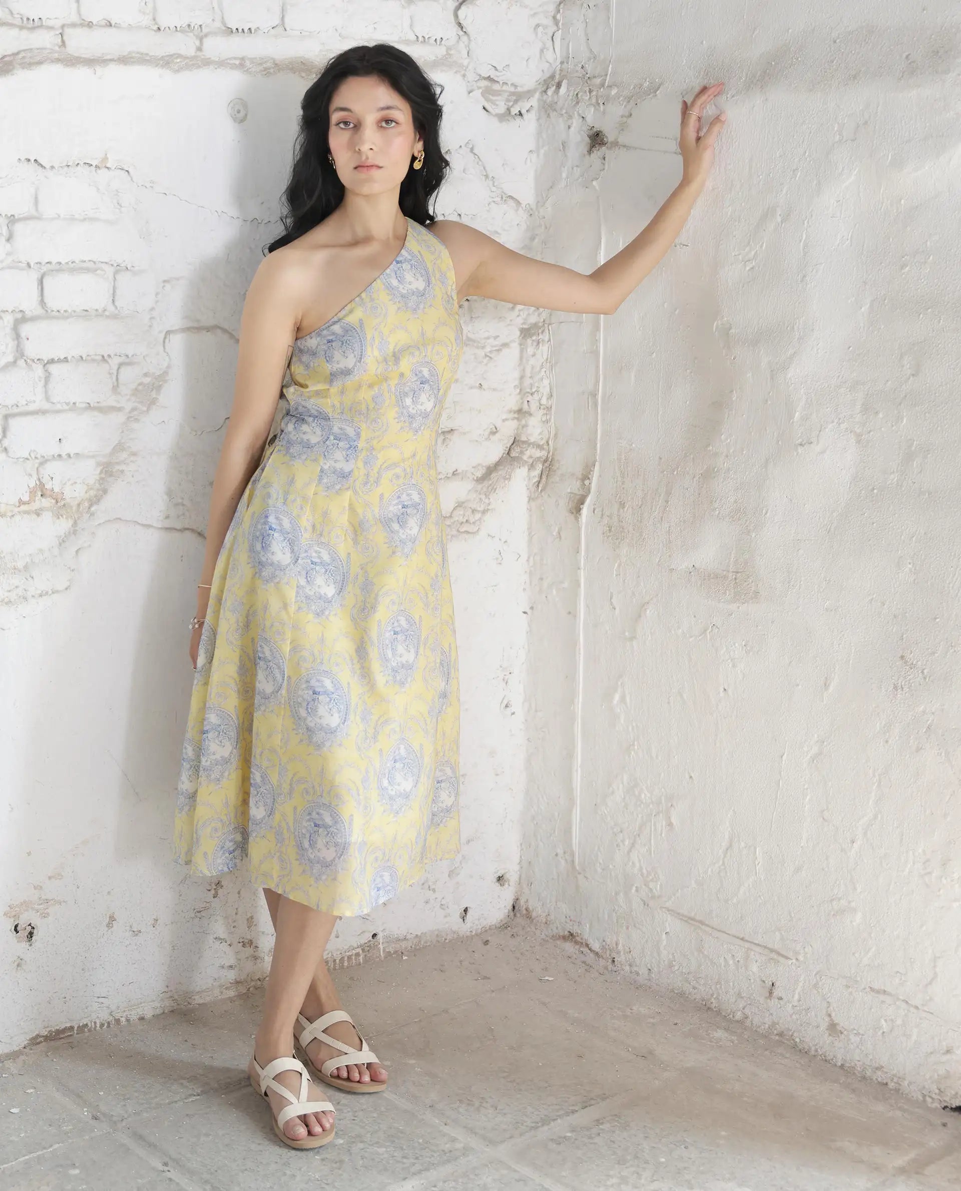 Elevate your brunch style with our One Shoulder Brunch Dress. Sleeveless and midi-length, this dress exudes chic simplicity. The self-design fabric belt adds a touch of sophistication, while side pockets offer practicality. Crafted from 100% Cotton fabric, it ensures comfort in style.