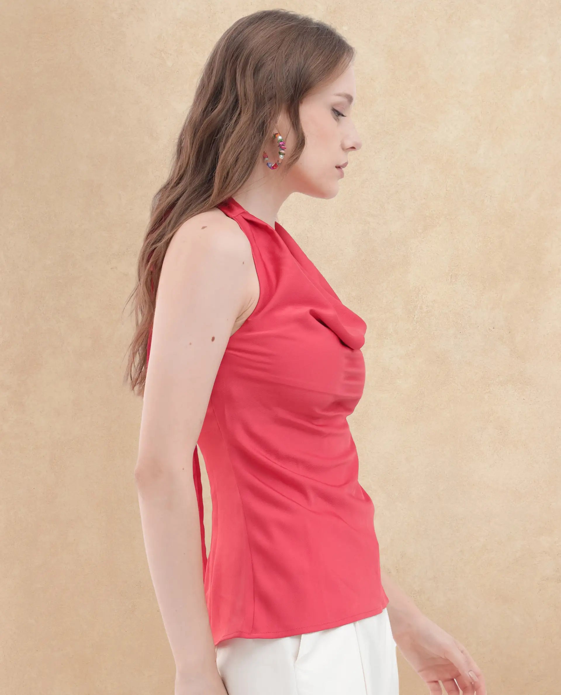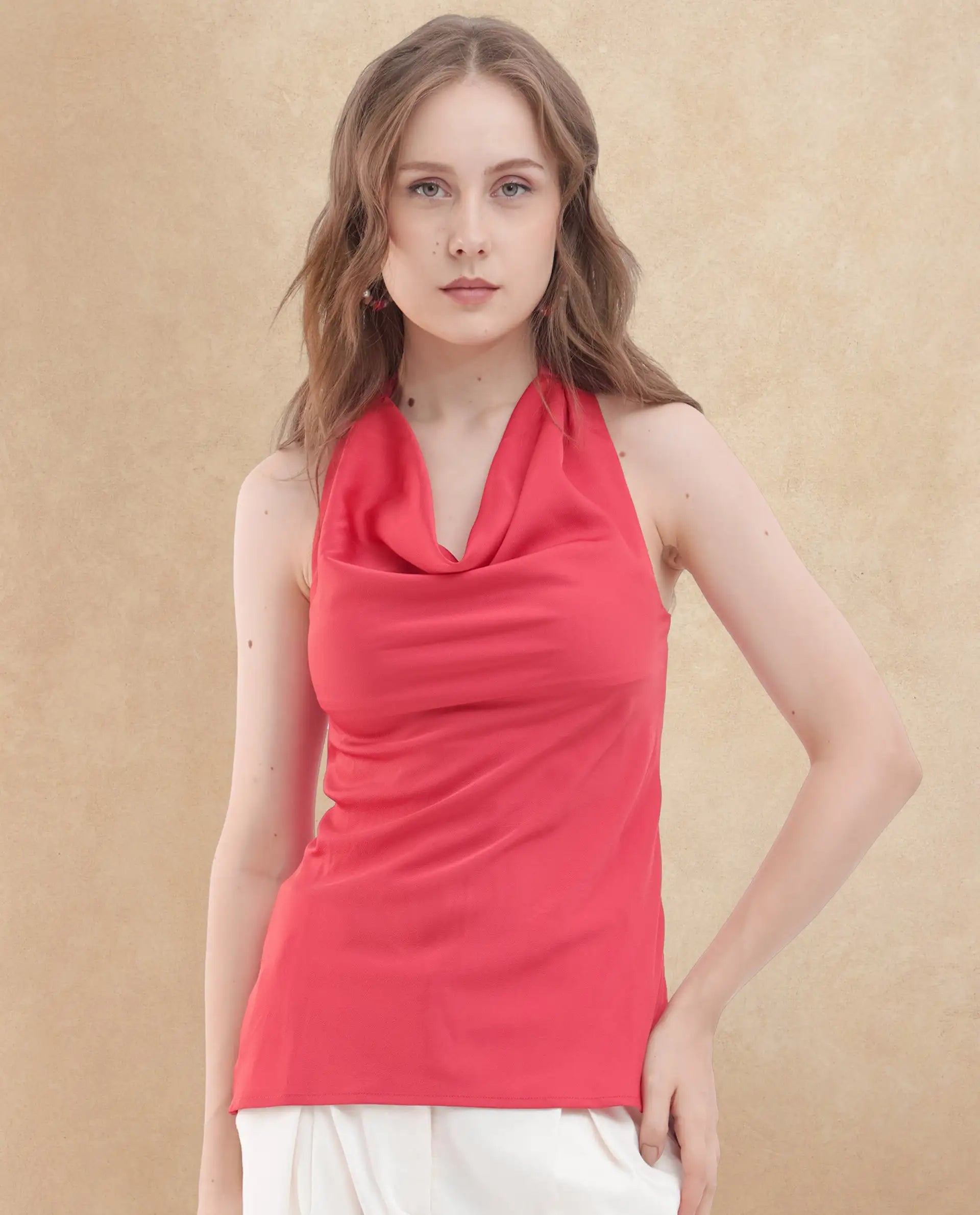 1. Elevate your wardrobe with this chic cowl neck top featuring a delicate tie-up detail at the back.