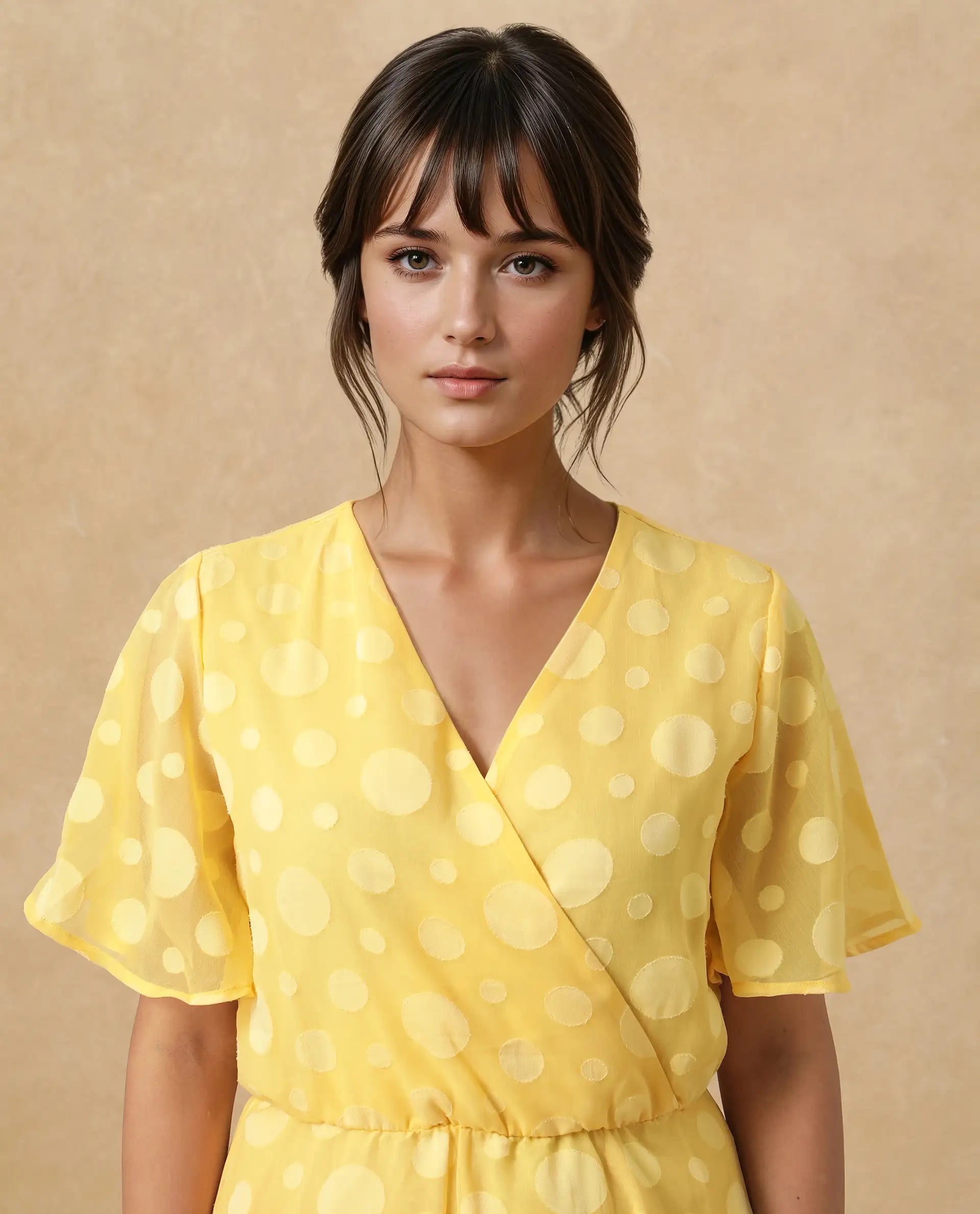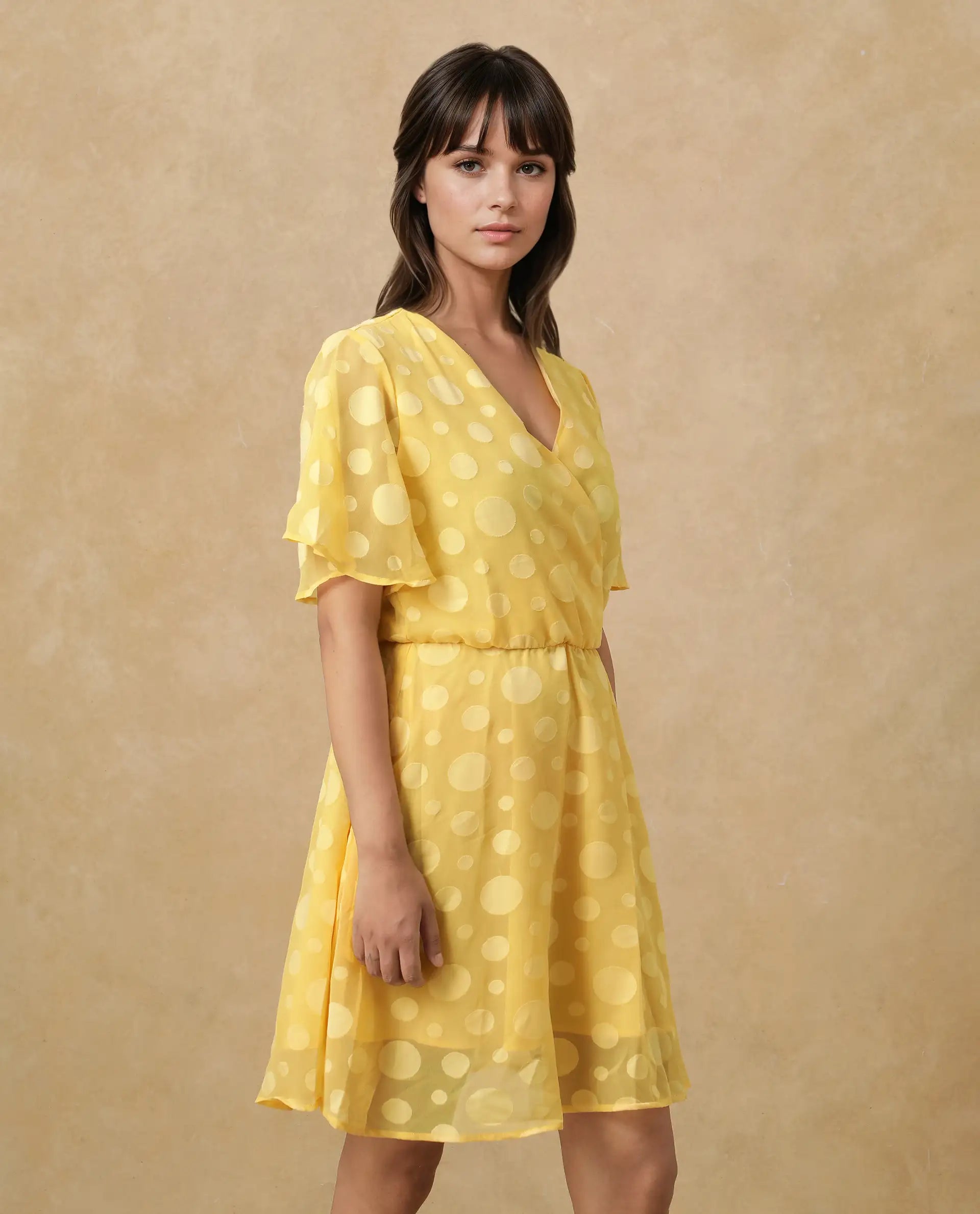 Elevate your wardrobe with this chic yellow polka dot wrap dress, perfect for any occasion. The playful polka dot print adds a touch of fun, while the wrap design ensures a flattering fit. Crafted from lightweight fabric, this dress offers comfort and style. The short sleeves and V-neckline enhance its feminine appeal, making it a versatile choice for both casual outings and special events. Pair it with your favorite heels or sandals for a complete look.