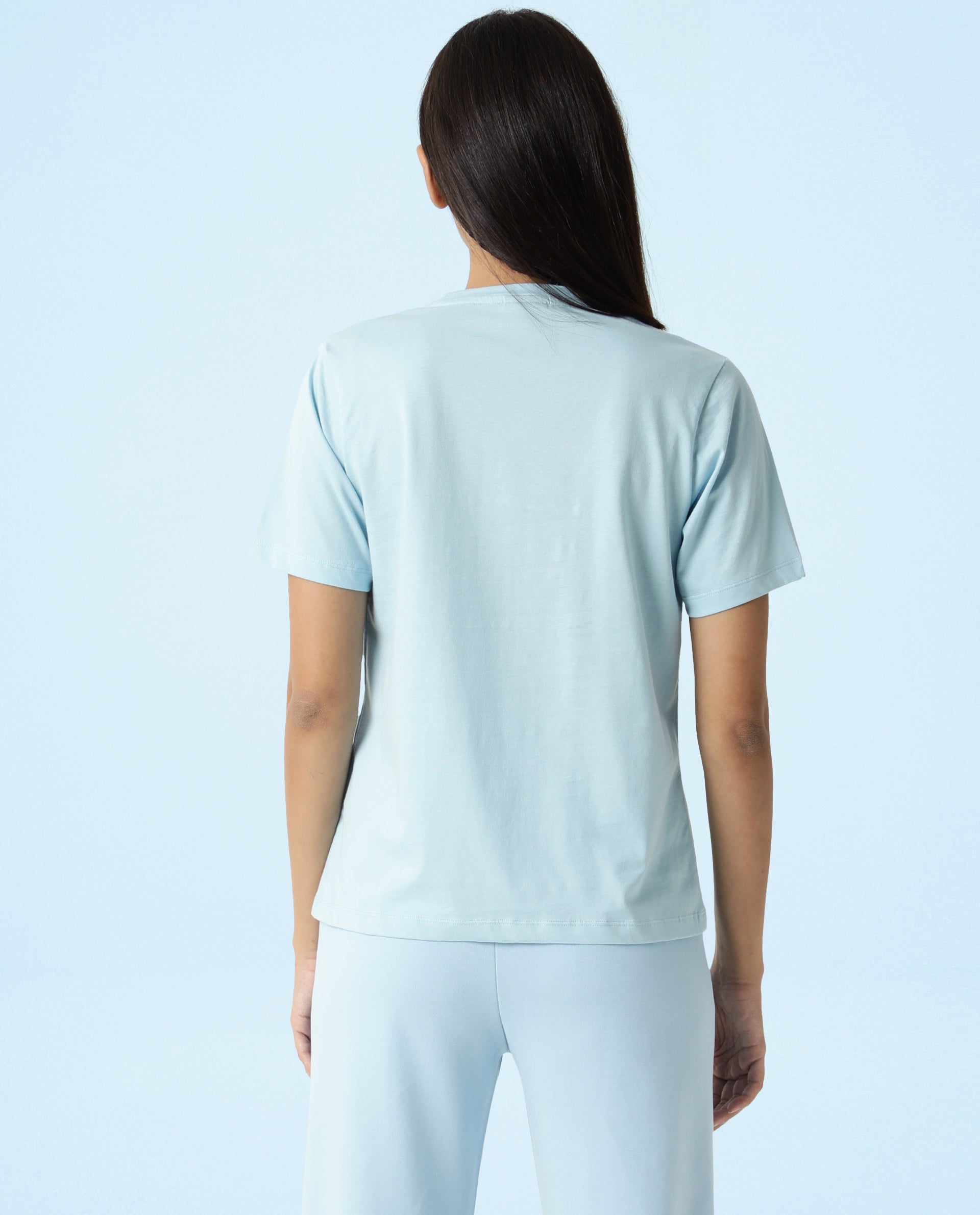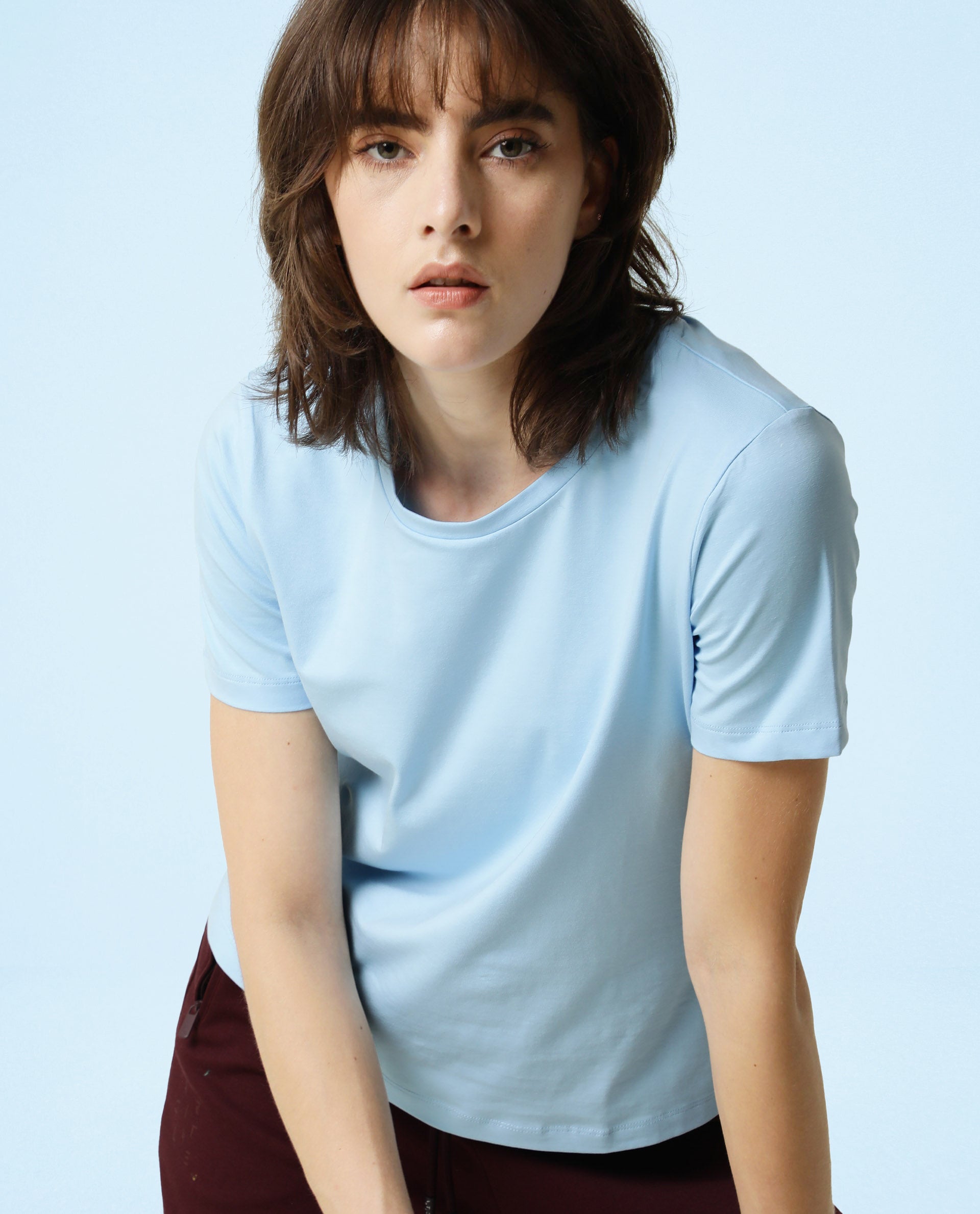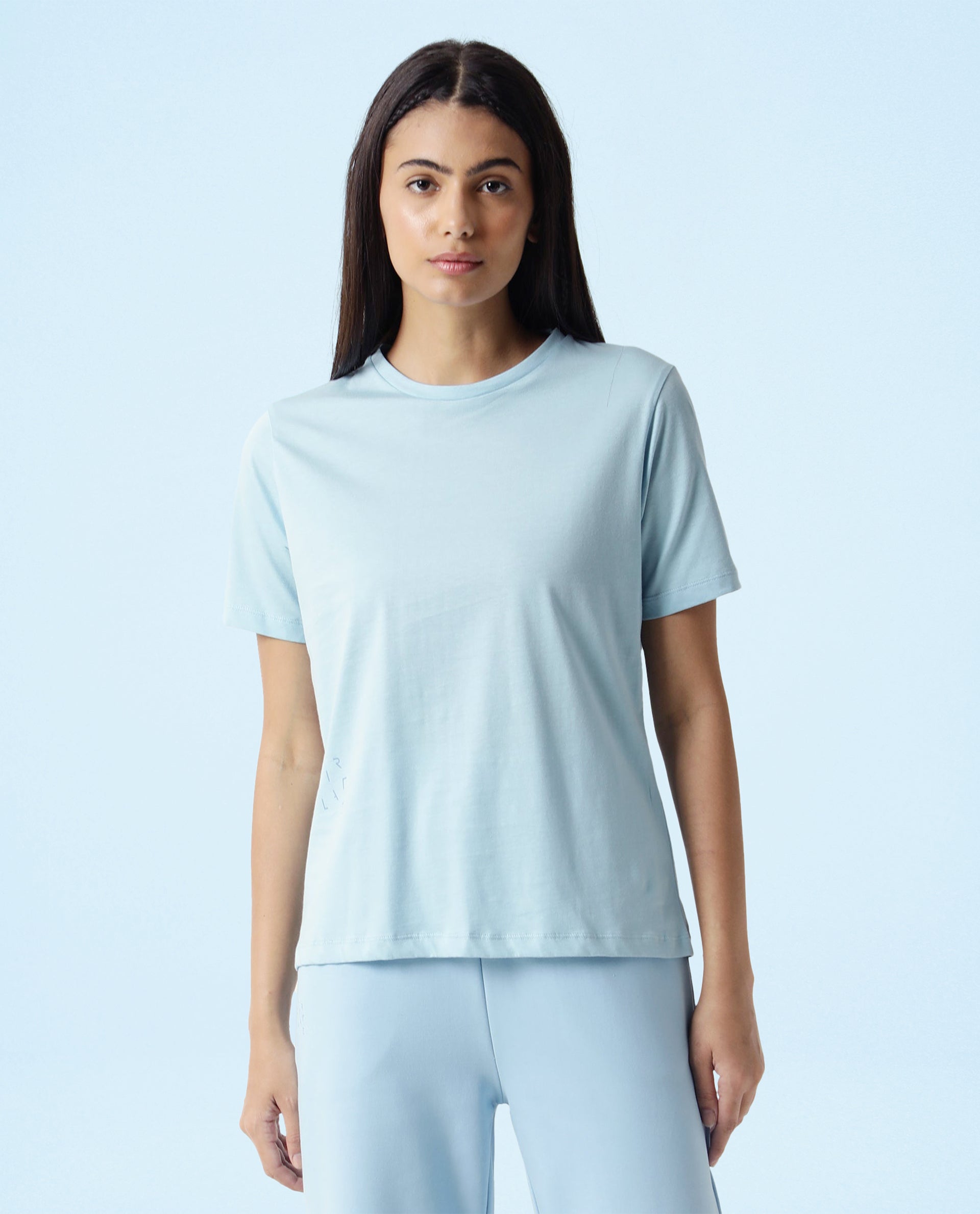 Rareism Women Alcas Blue Cotton Blend Fabric Regular Fit Half Sleeves Solid Round Neck T-Shirt