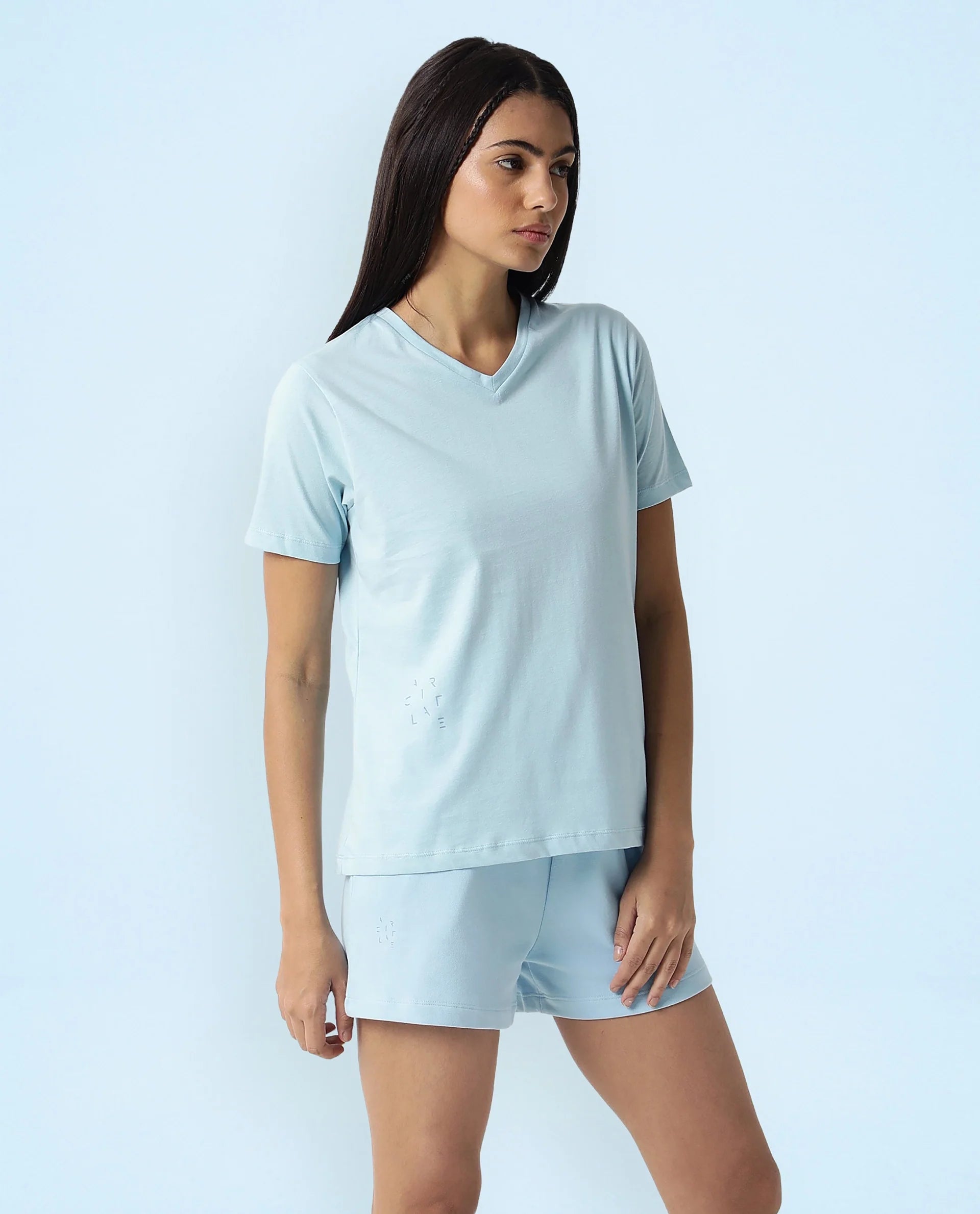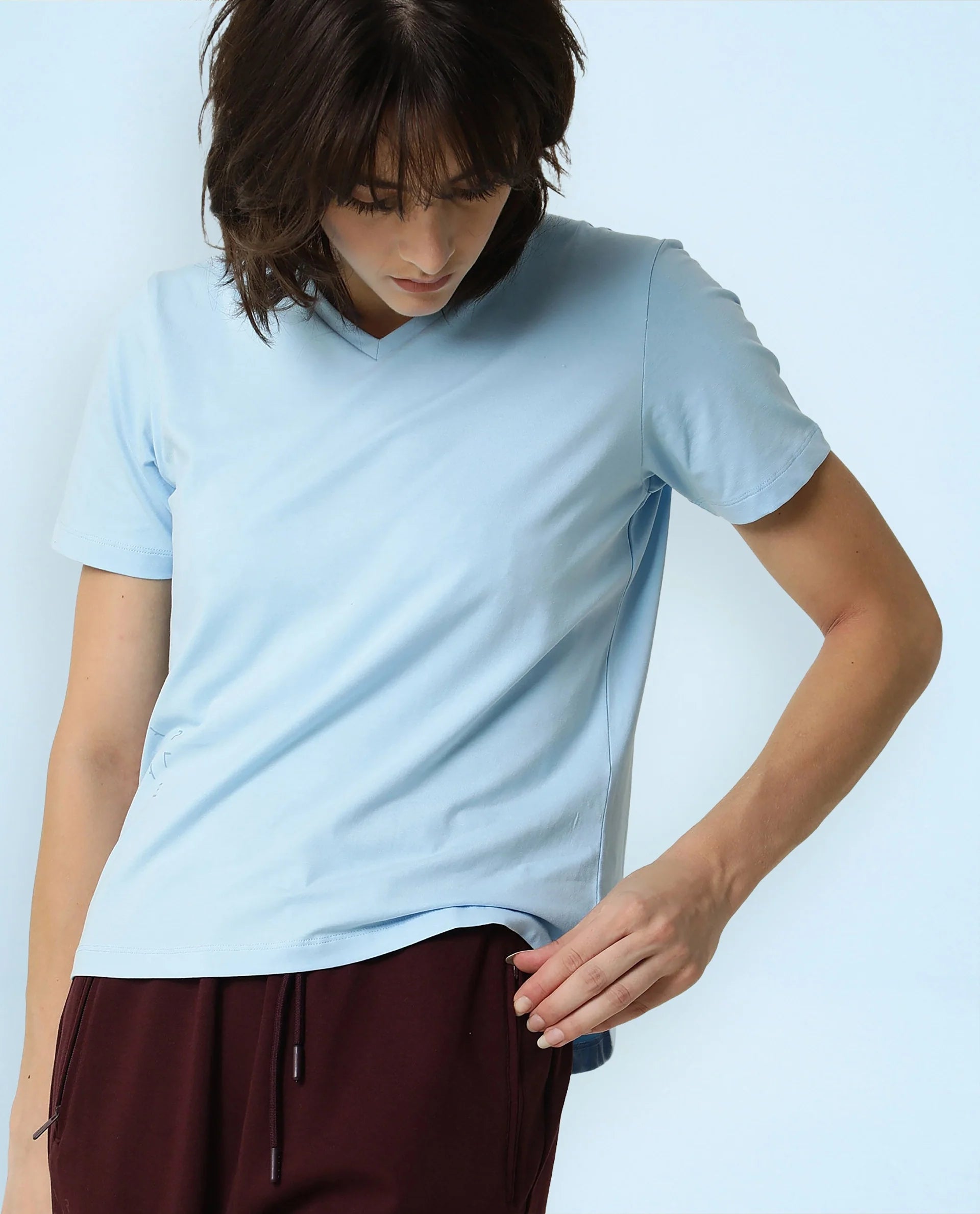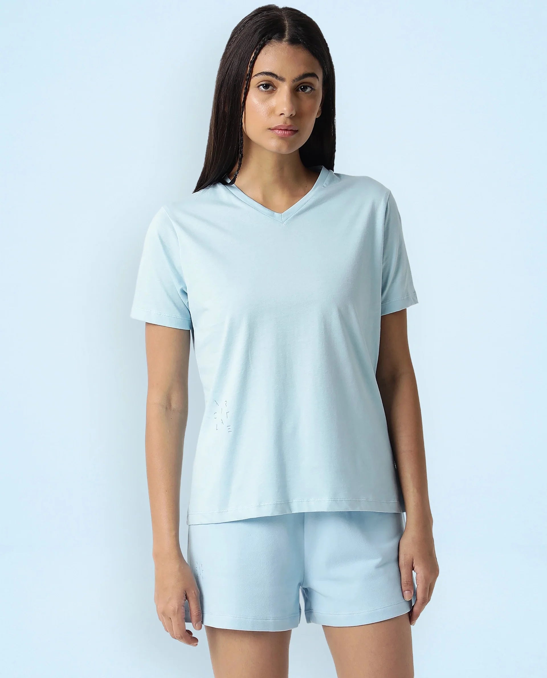 Rareism Women Arvi Blue Cotton Blend Fabric Regular Fit Half Sleeves Solid V-Neck T-Shirt