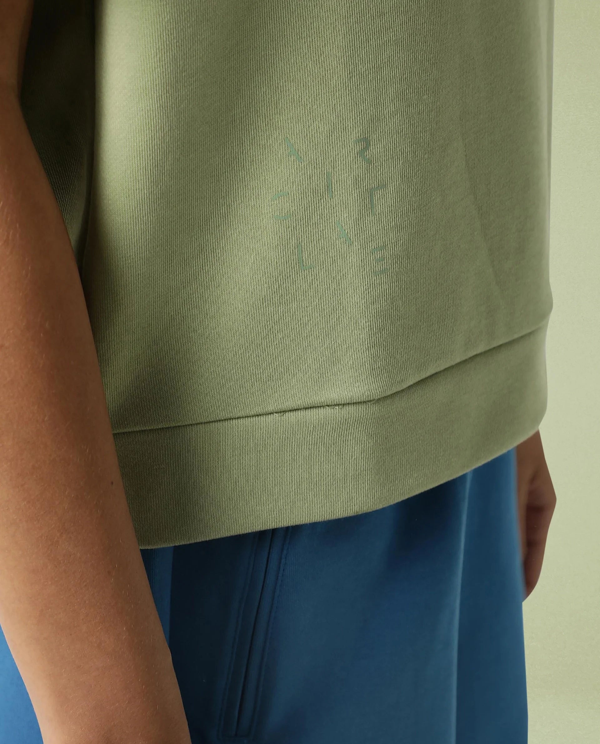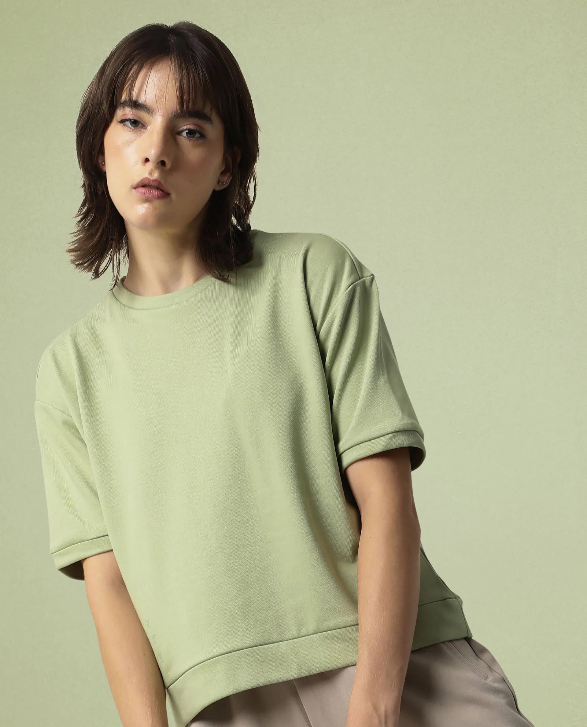 Rareism Women Coco Light Green Cotton Fabric Half Sleeves Relaxed Fit Solid Round Neck Sweat Tee