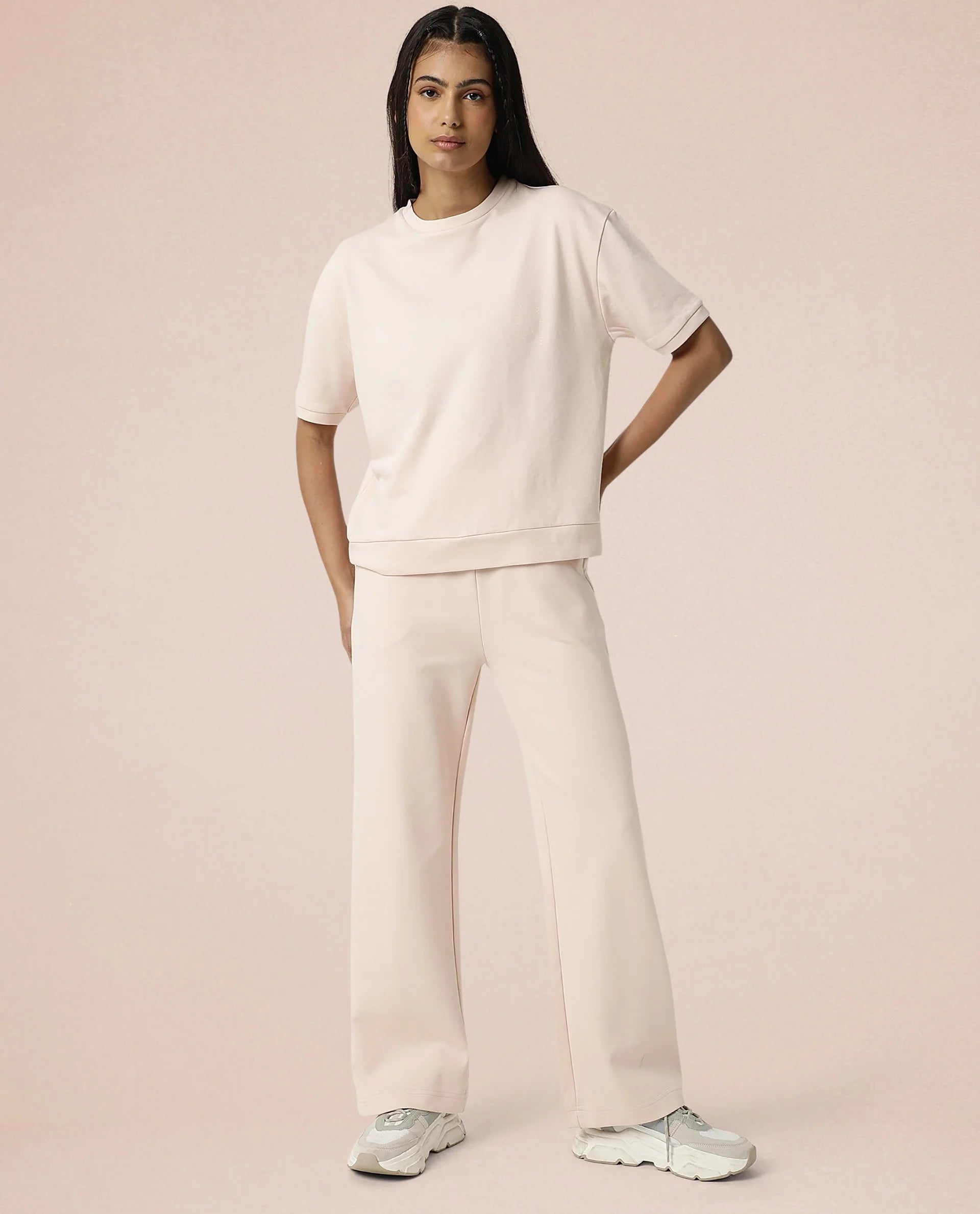 Rareism Women Coco Pink Cotton Fabric Half Sleeves Relaxed Fit Solid Round Neck Sweat Tee
