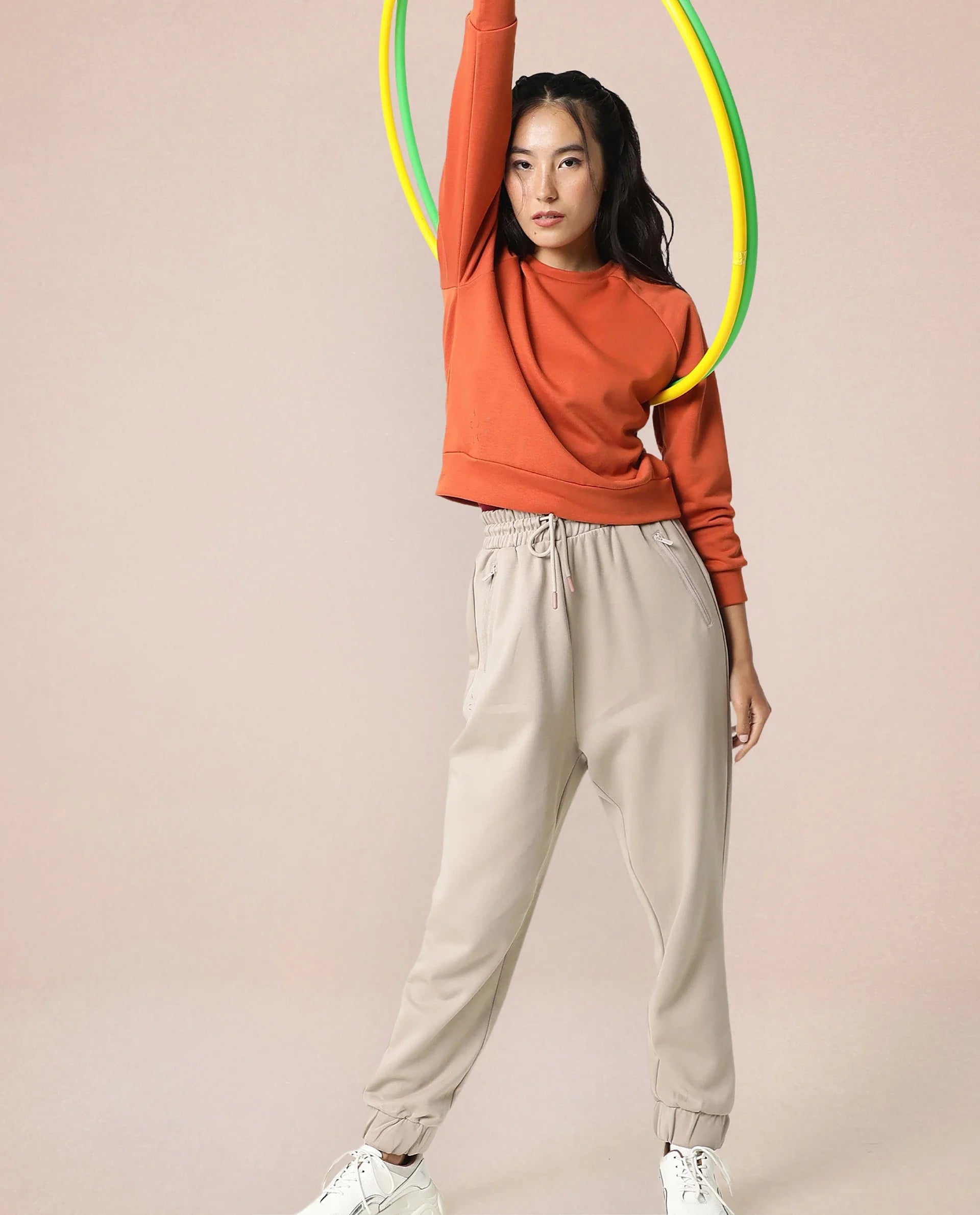 Rareism Women Creta Beige Cotton Blend Fabric Relaxed Fit Solid Mid Rise Ankle Length Track Pant