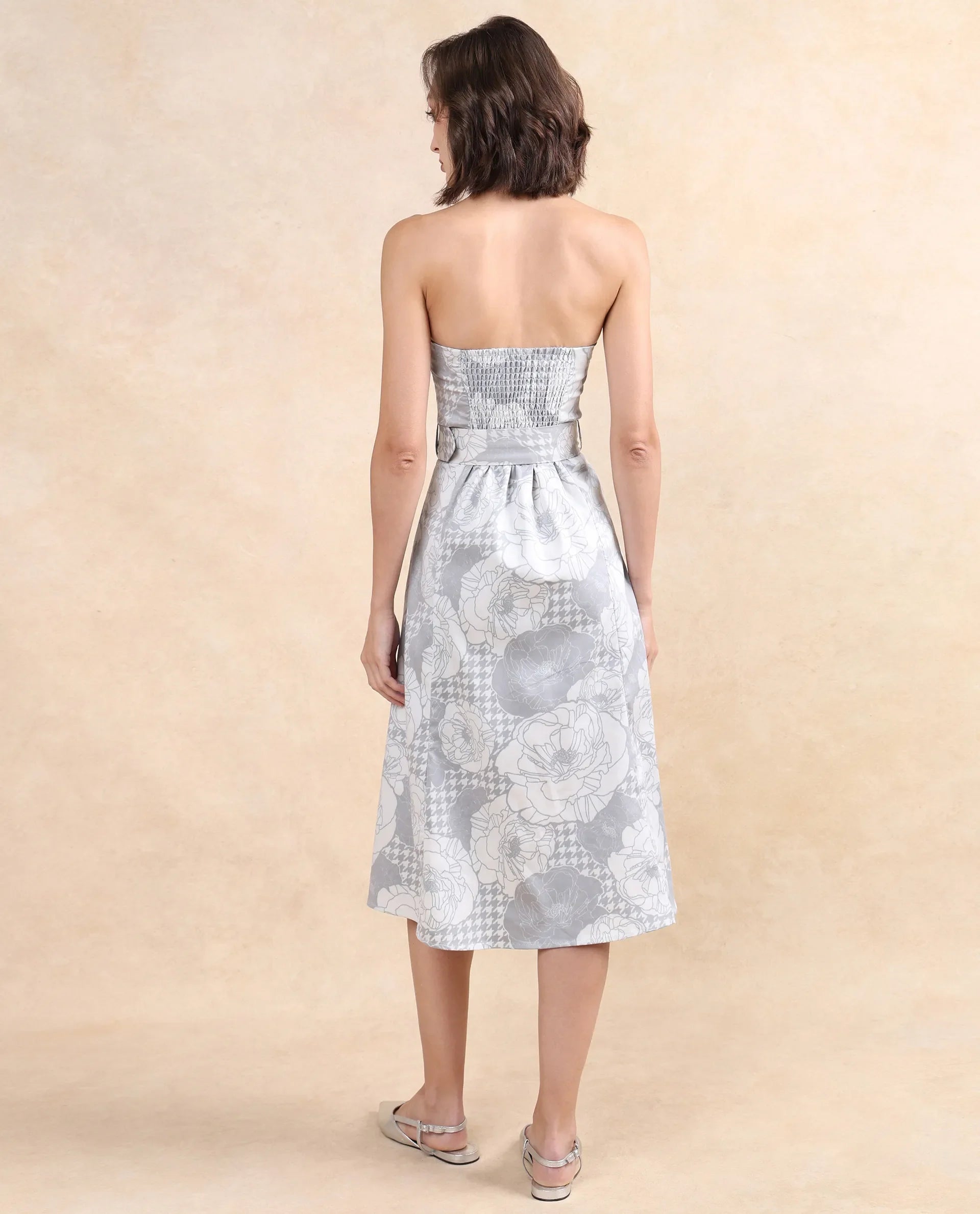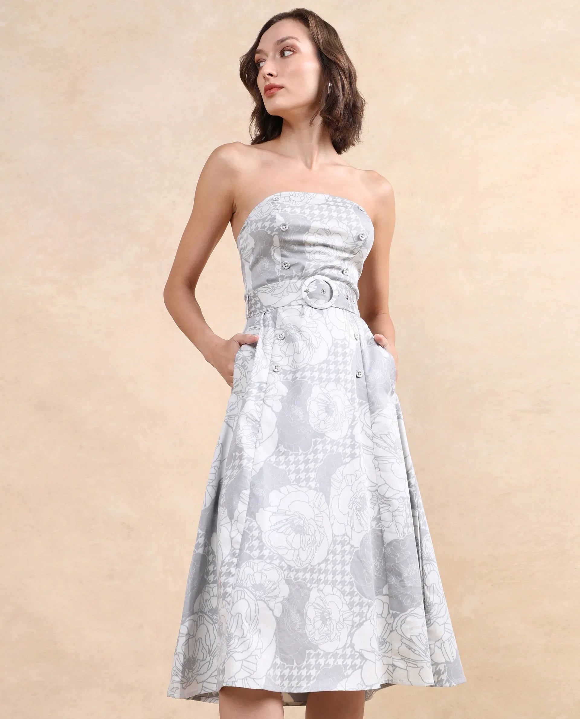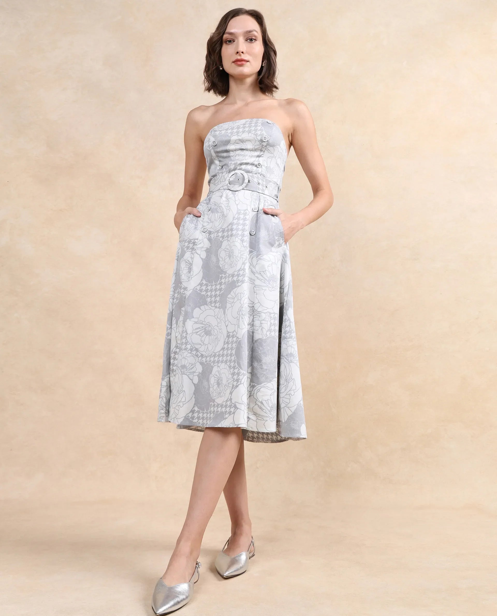 Elevate your style with this elegant strapless floral midi dress, perfect for any occasion. Crafted from premium fabric, it features a flattering belted waist and a chic floral print that exudes sophistication. The dress offers a comfortable fit and a timeless silhouette, making it a versatile addition to your wardrobe. Pair it with your favorite heels for a stunning look that will turn heads wherever you go.