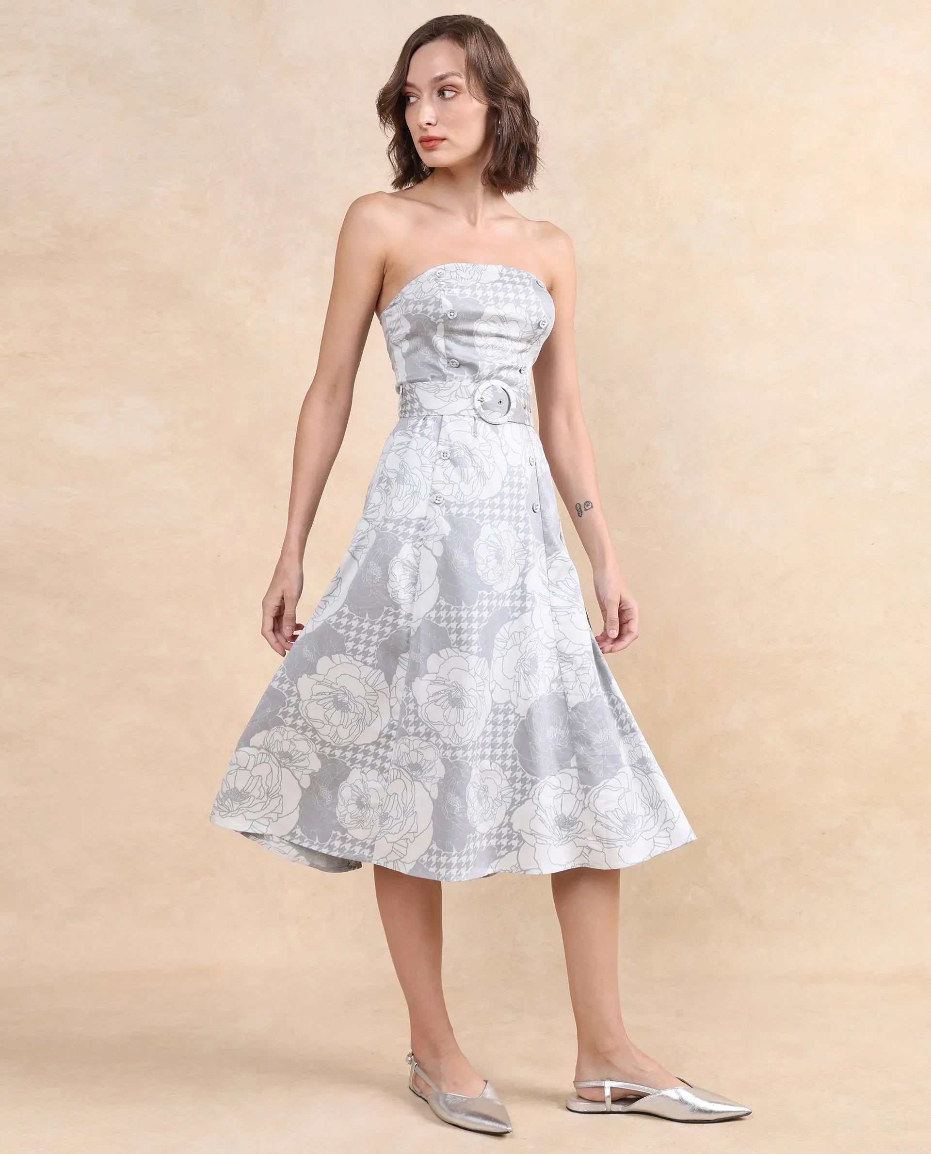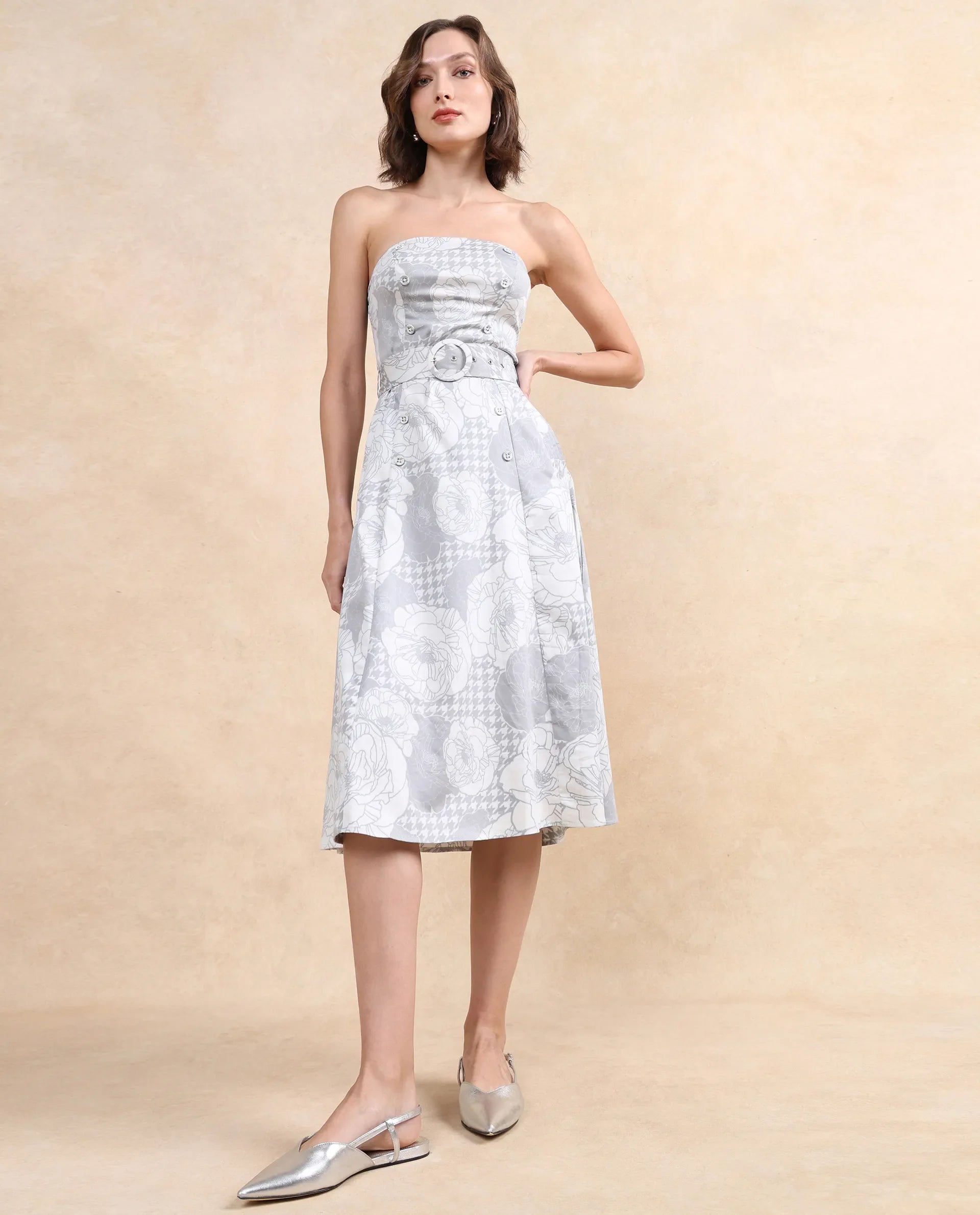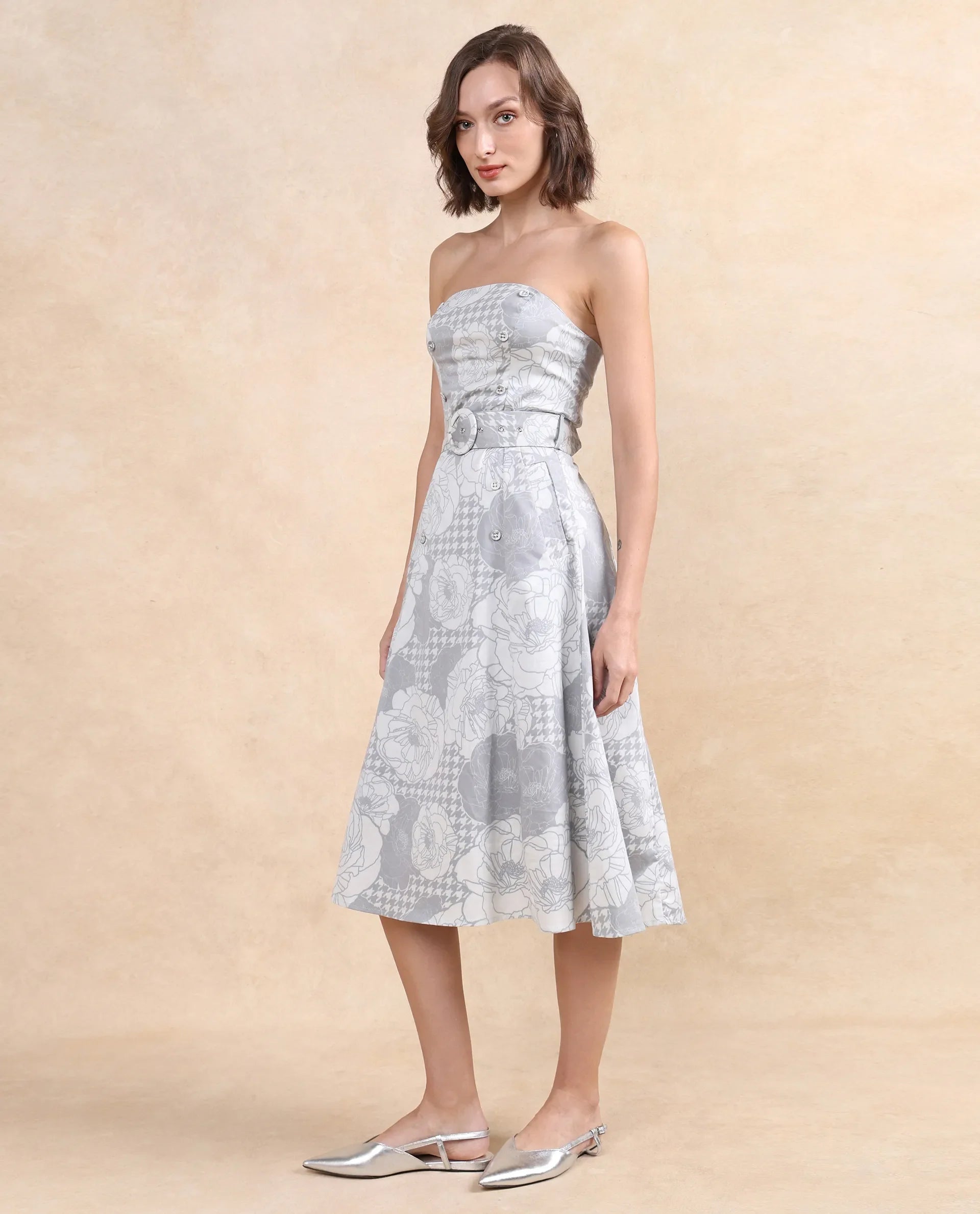 Elevate your style with this elegant strapless floral midi dress, perfect for any occasion. Crafted from premium fabric, it features a flattering belted waist and a chic floral print that exudes sophistication. The dress offers a comfortable fit and a timeless silhouette, making it a versatile addition to your wardrobe. Pair it with your favorite heels for a stunning look that will turn heads wherever you go.