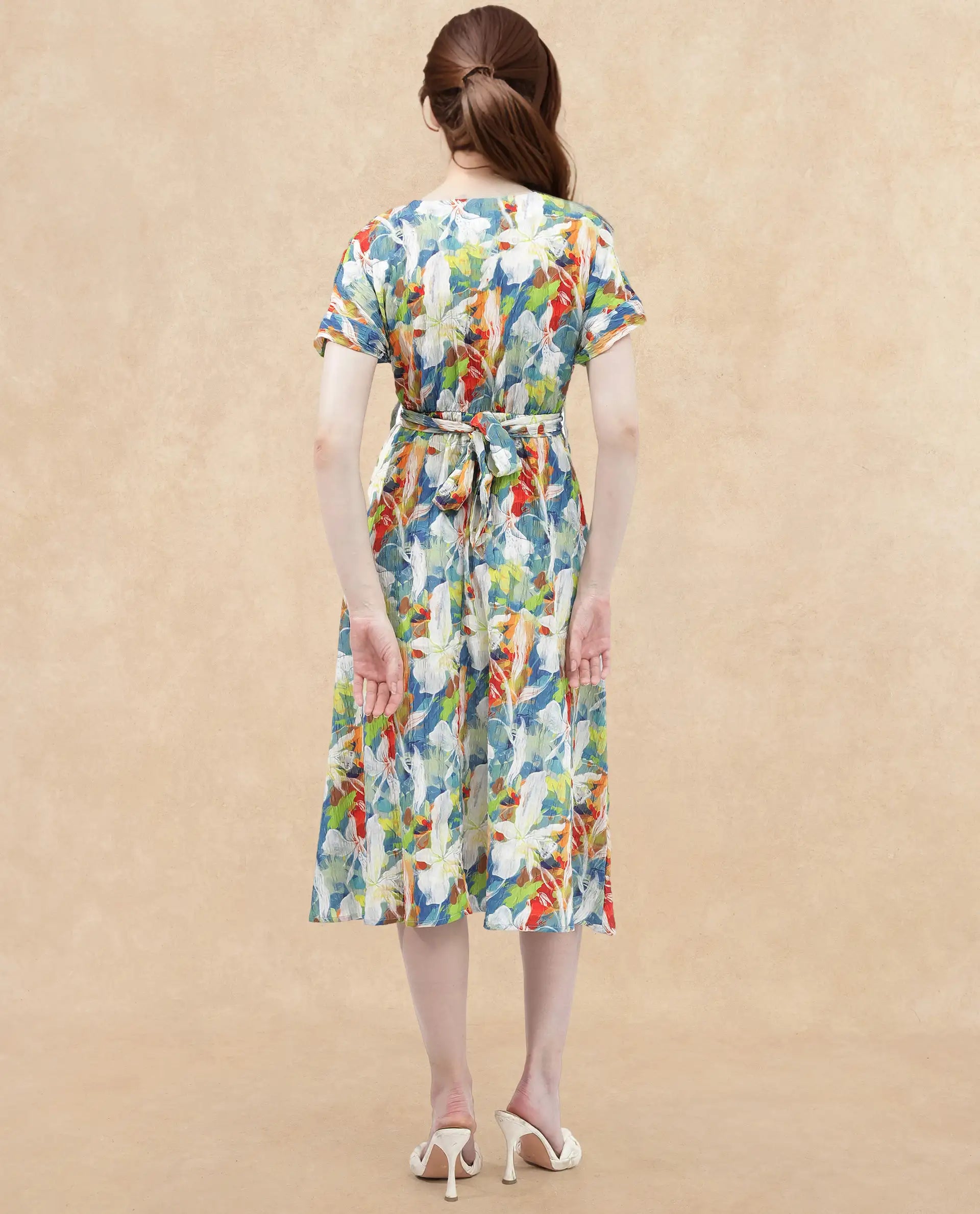 2. Feminine Floral Print: Adorned with a charming floral print, adding a touch of femininity and elegance to the dress.