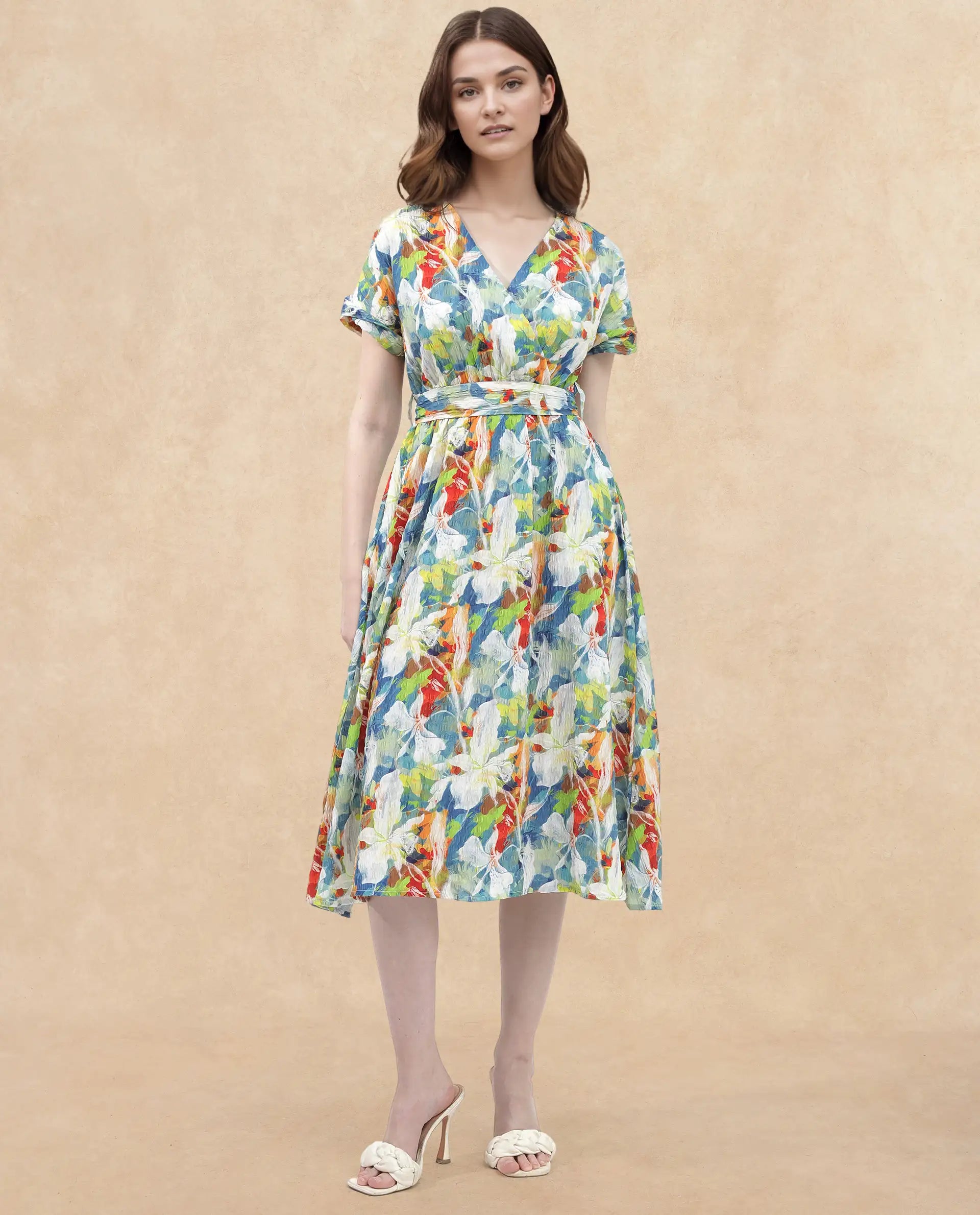 Rareism Women Jaci Light Multi Poly Lycra Fabric Short Sleeve Over Lap Neck Wrap Floral Print Regular Fit Dress
