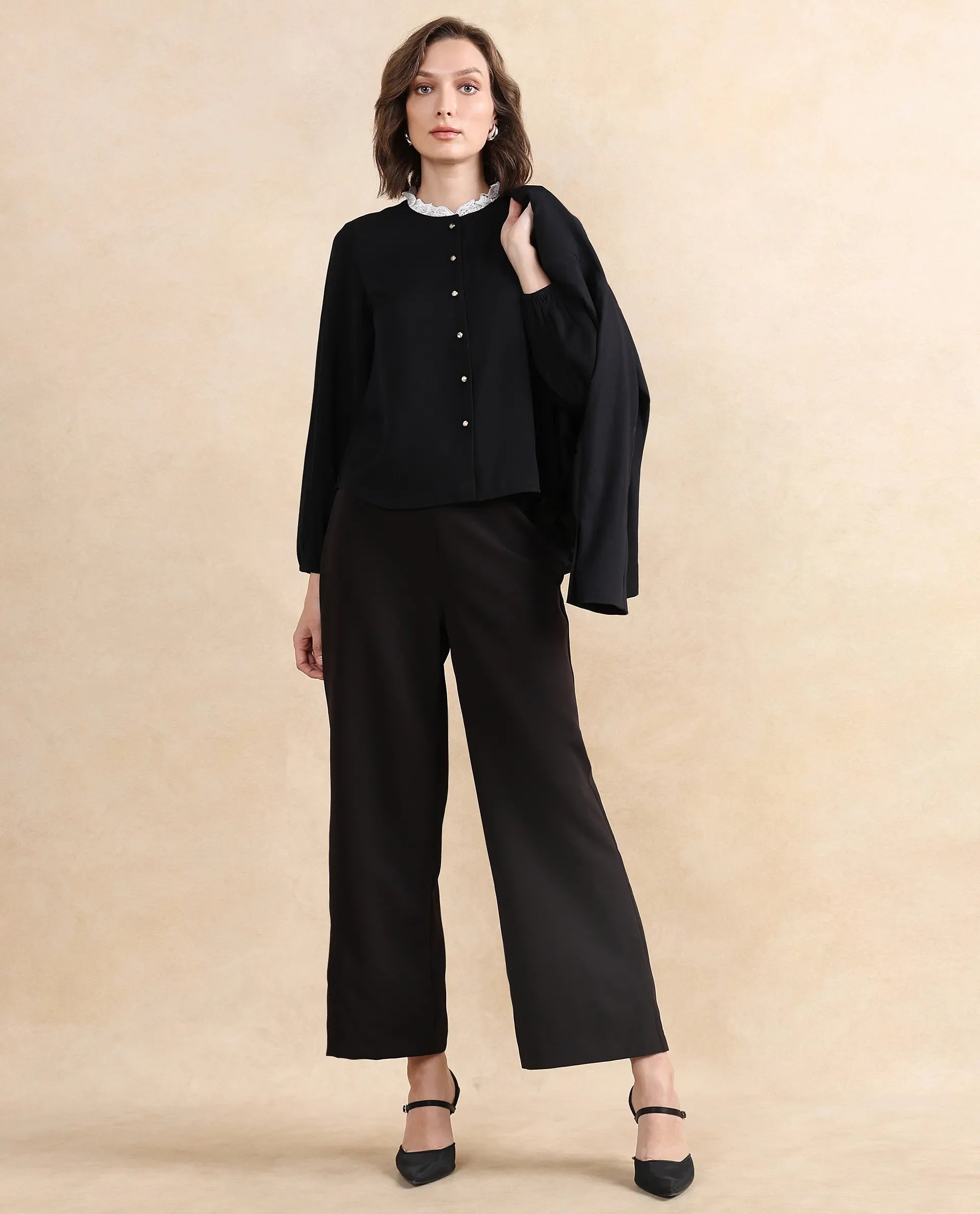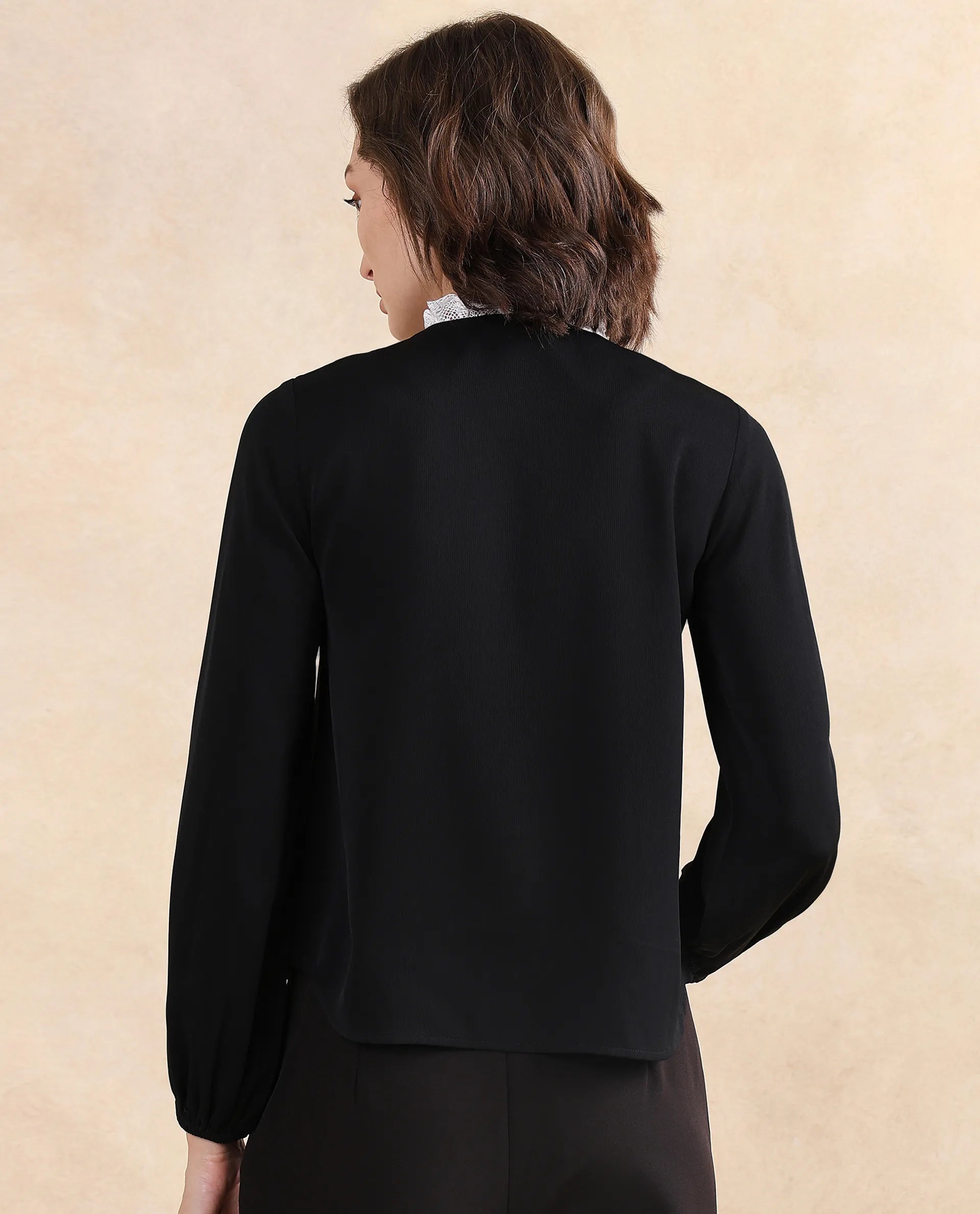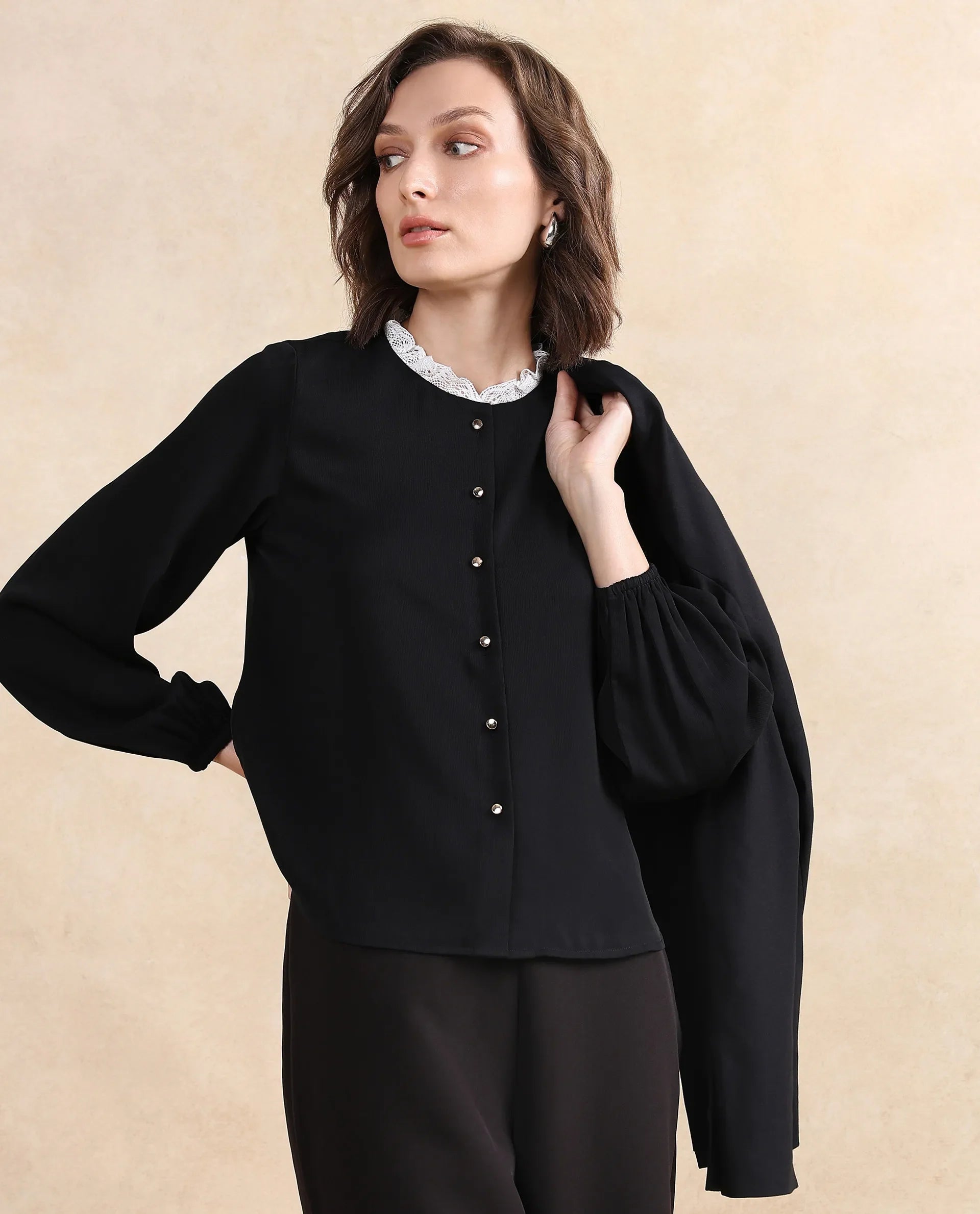 Rareism Women Ubik Black Bishop Sleeve Round Neck Button Closure Plain Top