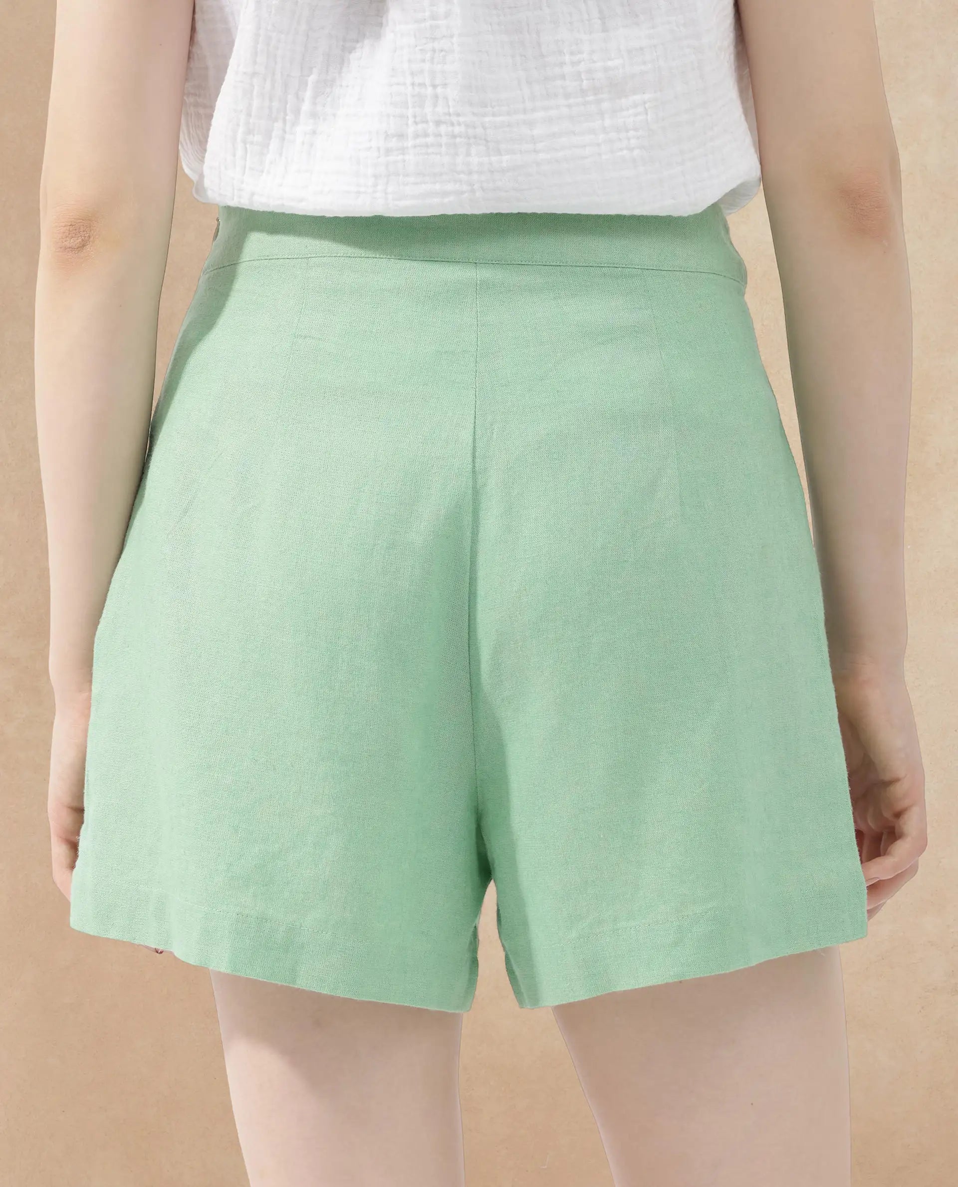 Rareism Women Eveny Pastel Green Viscose Linen Fabric Zip Closure Slim Fit Plain Mini Shorts