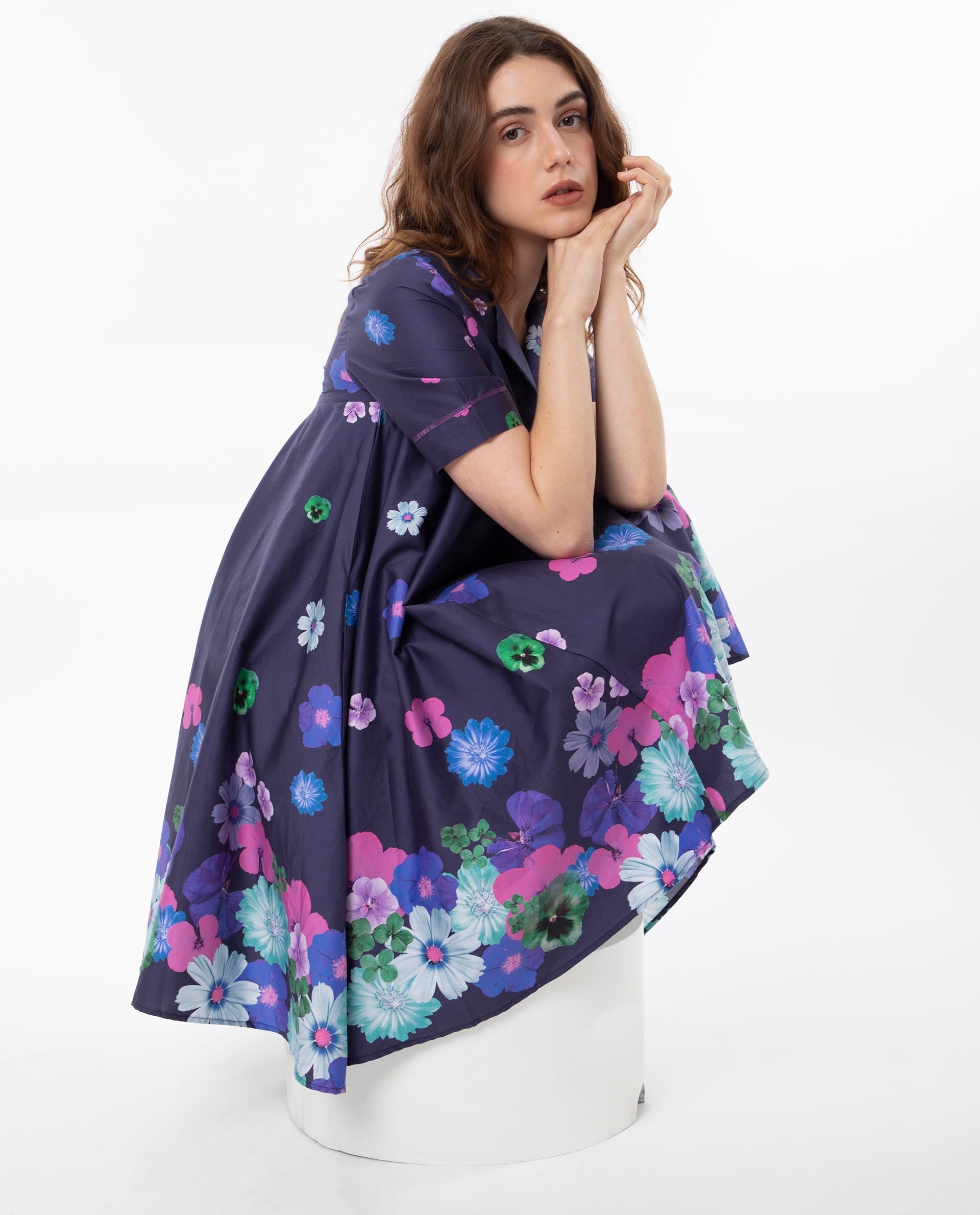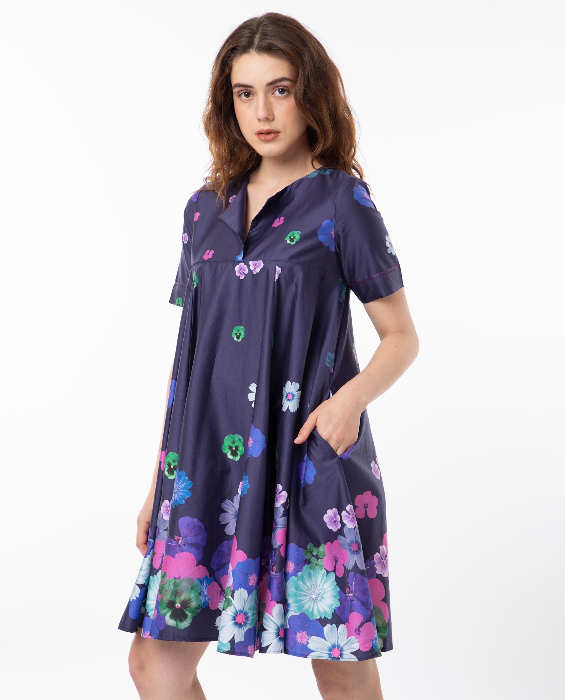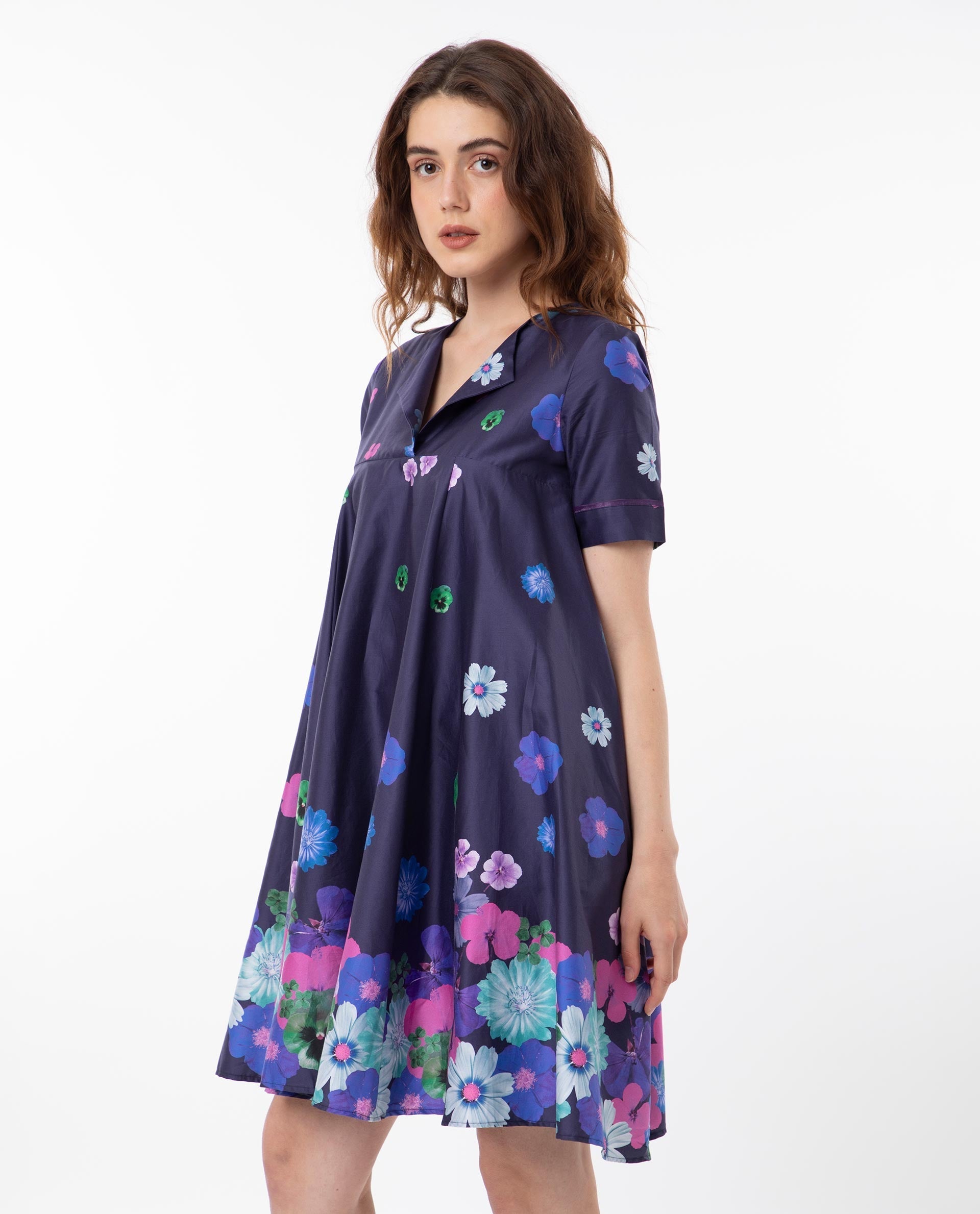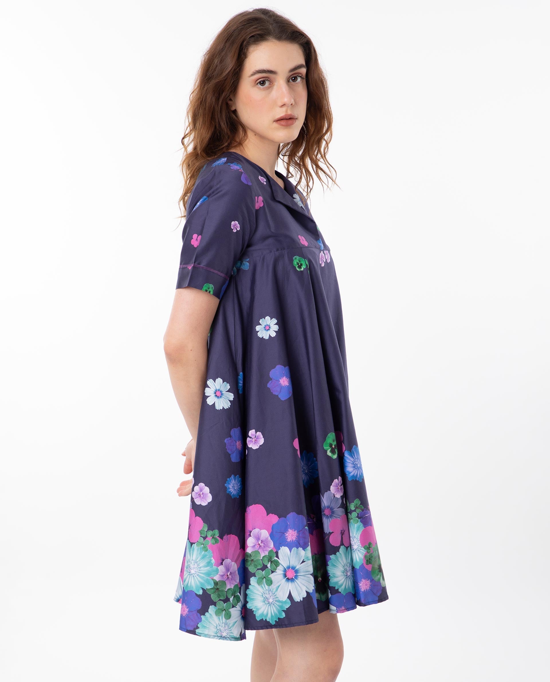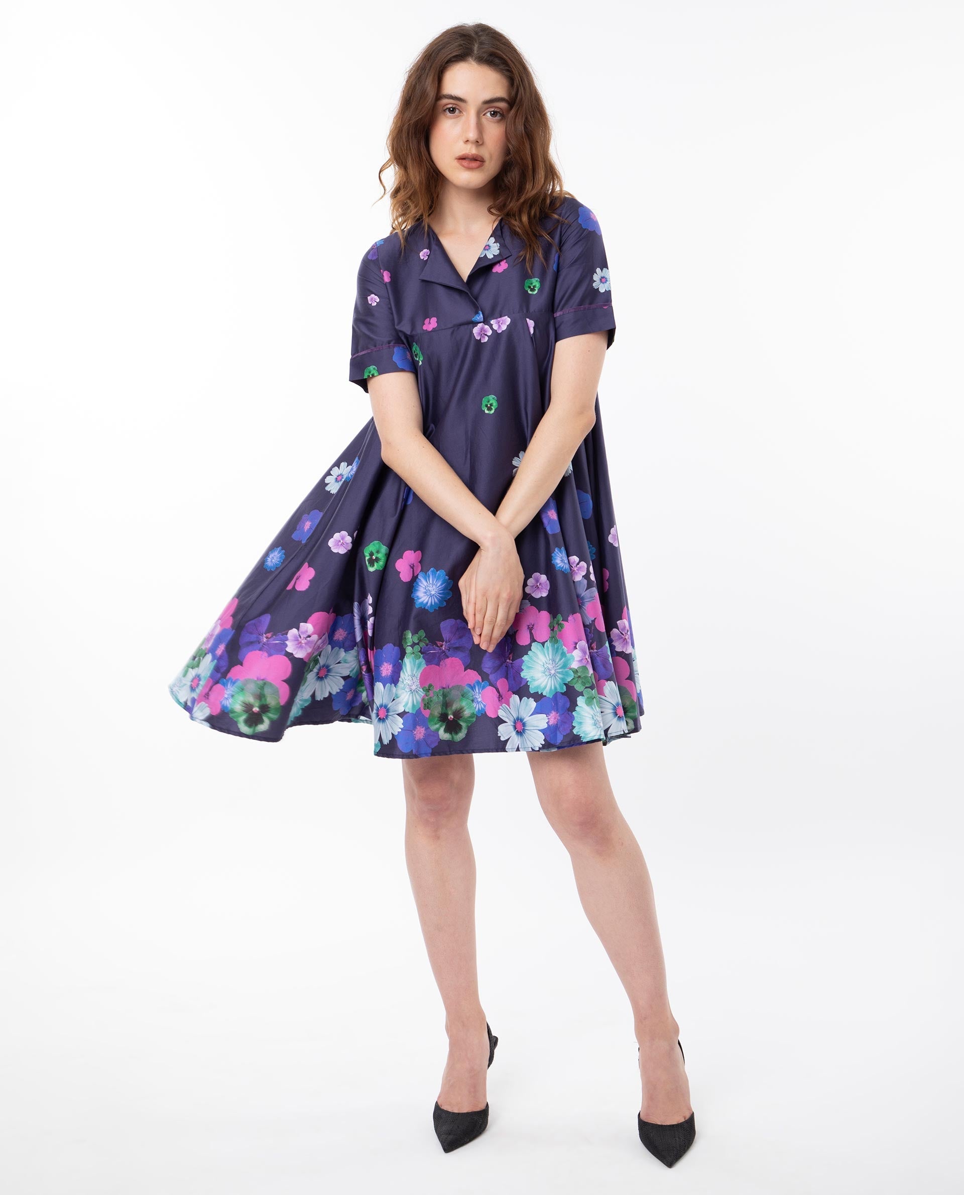 FLORAL PRINT CIRCULAR FLARED DRESS WITH TURN COLLAR NECK