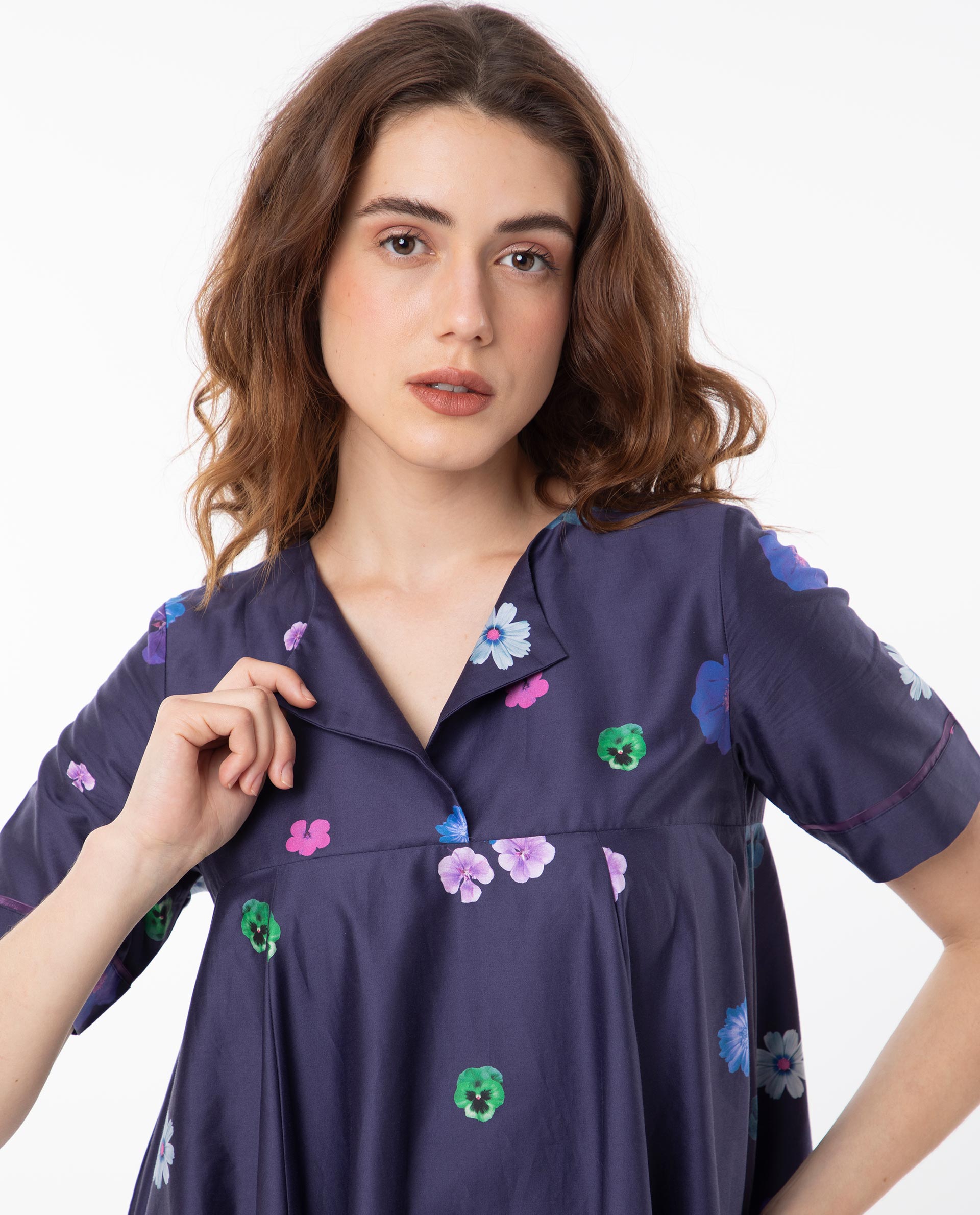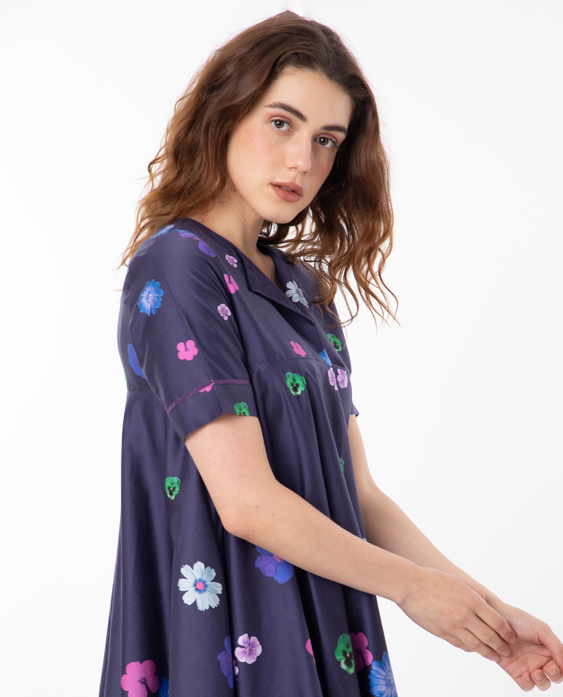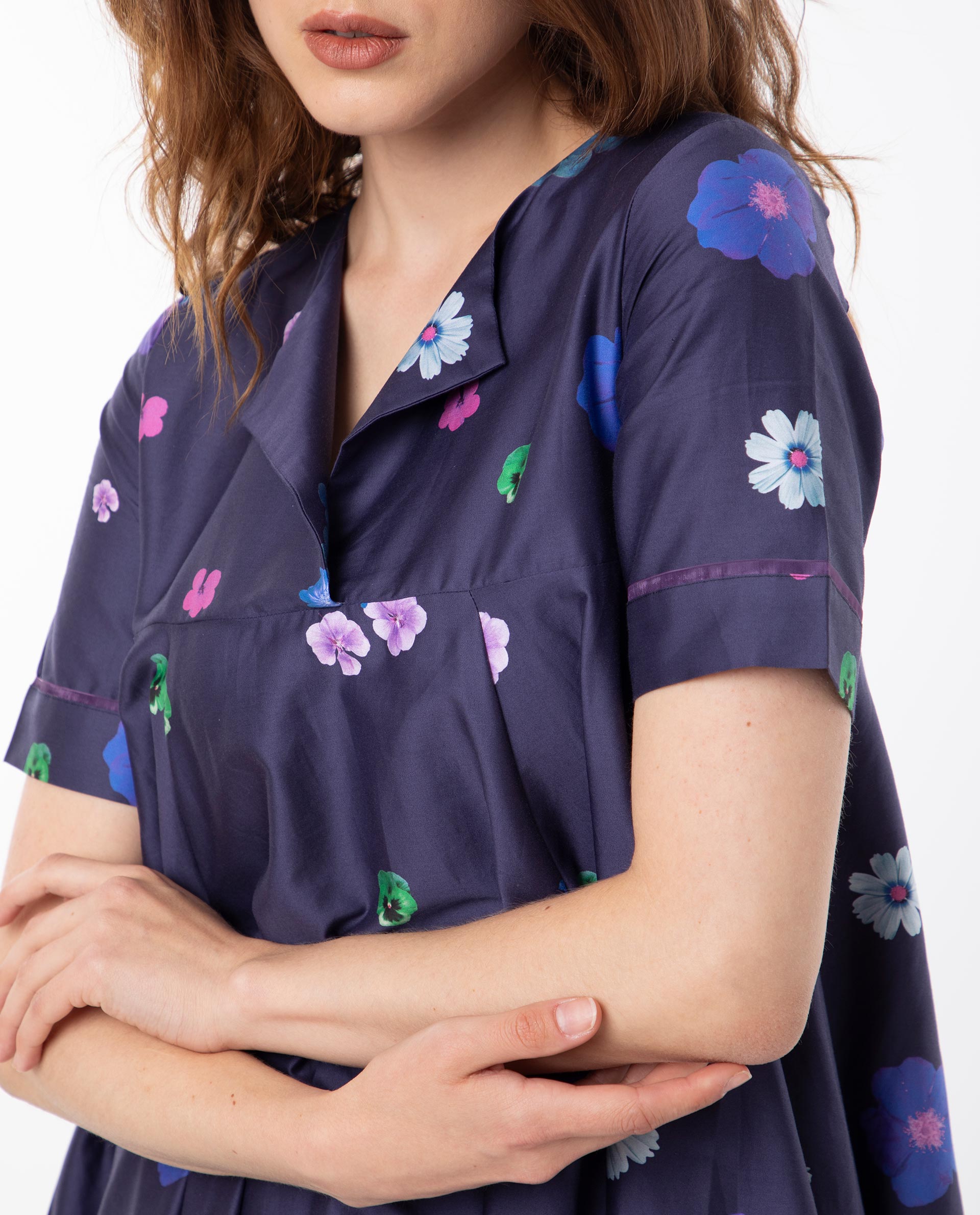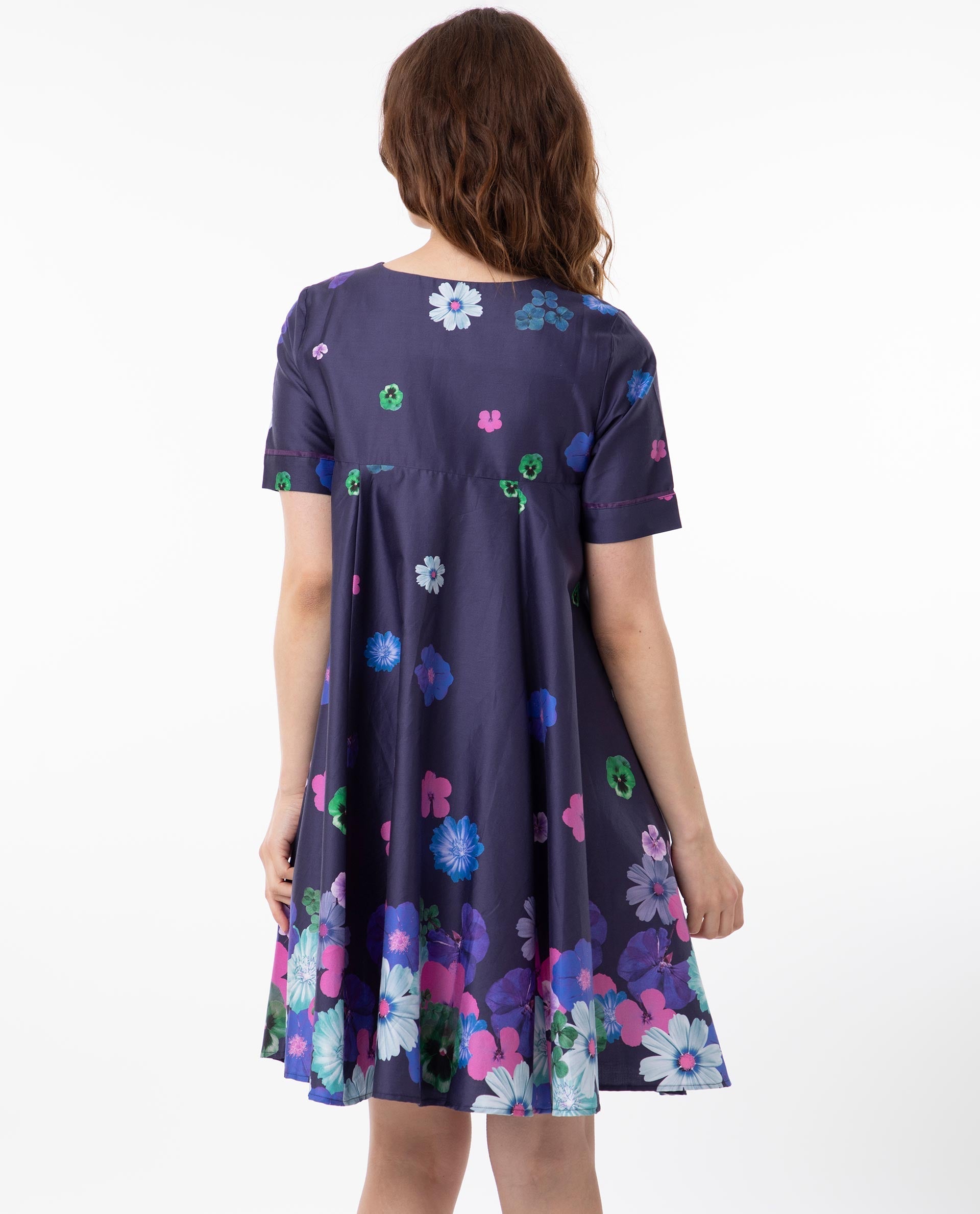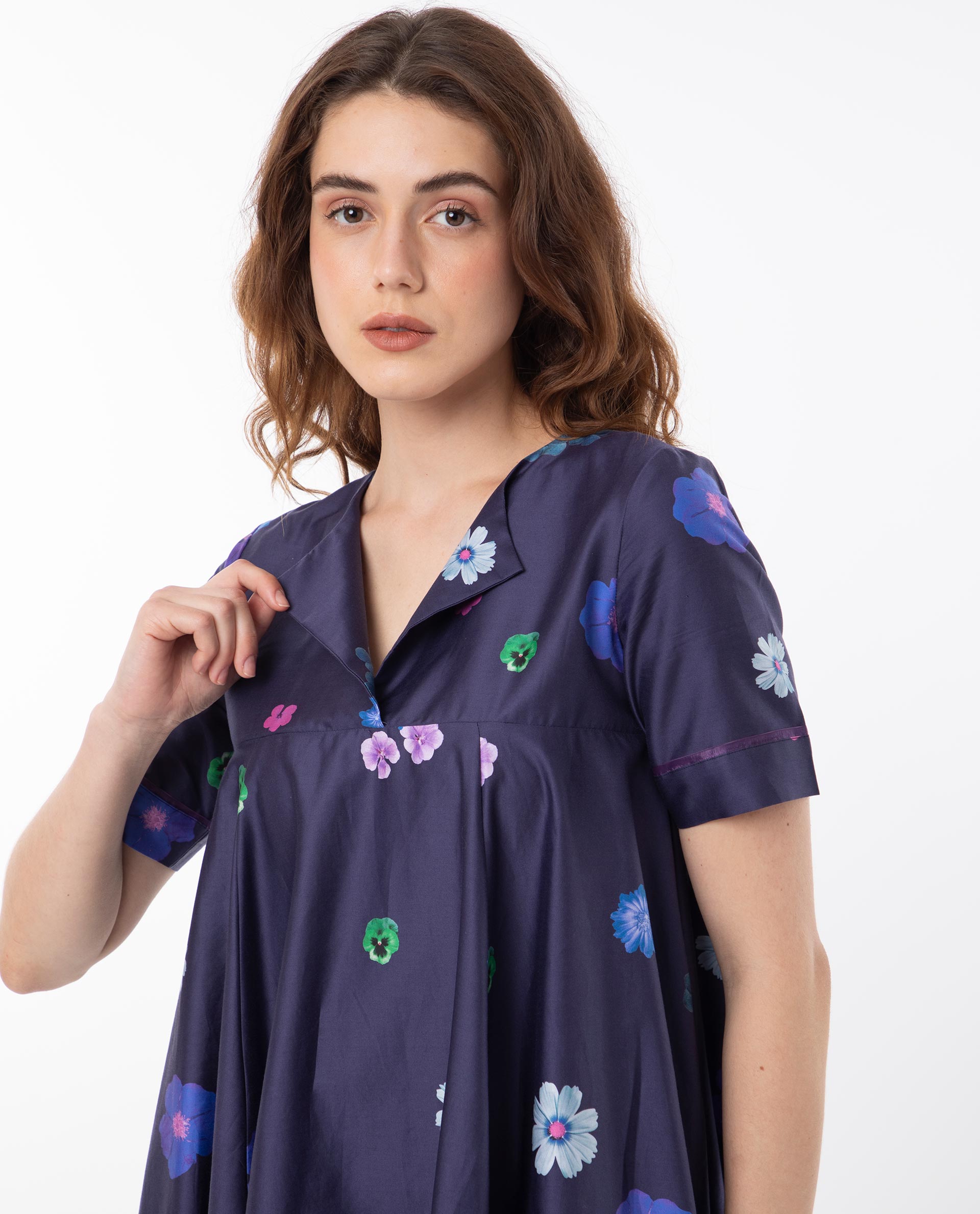 FLORAL PRINT CIRCULAR FLARED DRESS WITH TURN COLLAR NECK